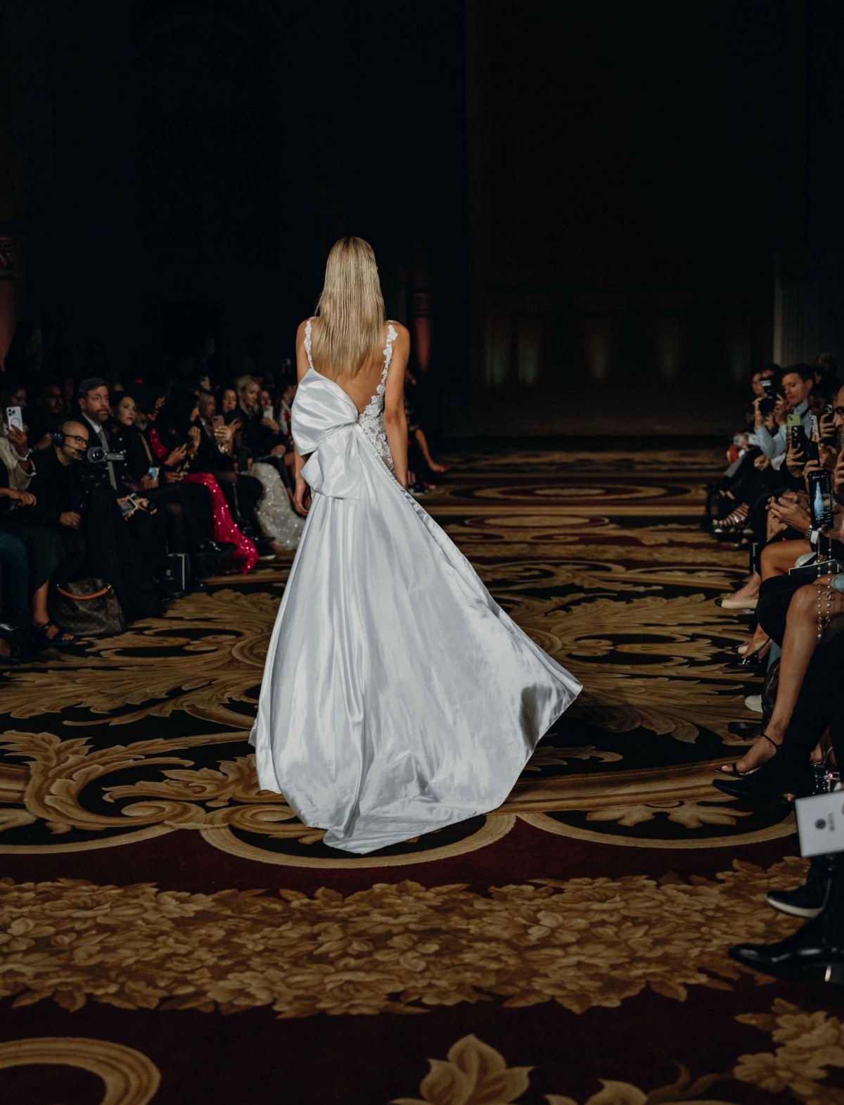 Ciò che rende questo abito davvero indimenticabile è il fiocco in seta che adorna la parte posteriore. Questo dettaglio sartoriale non è solo un ornamento, ma il punto focale che aggiunge volume e un’inaspettata drammaticità alla silhouette. Il fiocco si trasforma in un regale strascico che scivola con leggerezza, creando un contrasto meraviglioso tra la trama delicata del pizzo e la lucentezza liscia della seta. Perfetto per la sposa che desidera combinare sensualità e romanticismo, questo abito è consigliato per chi vuole lasciare il segno con un look sofisticato e indimenticabile.