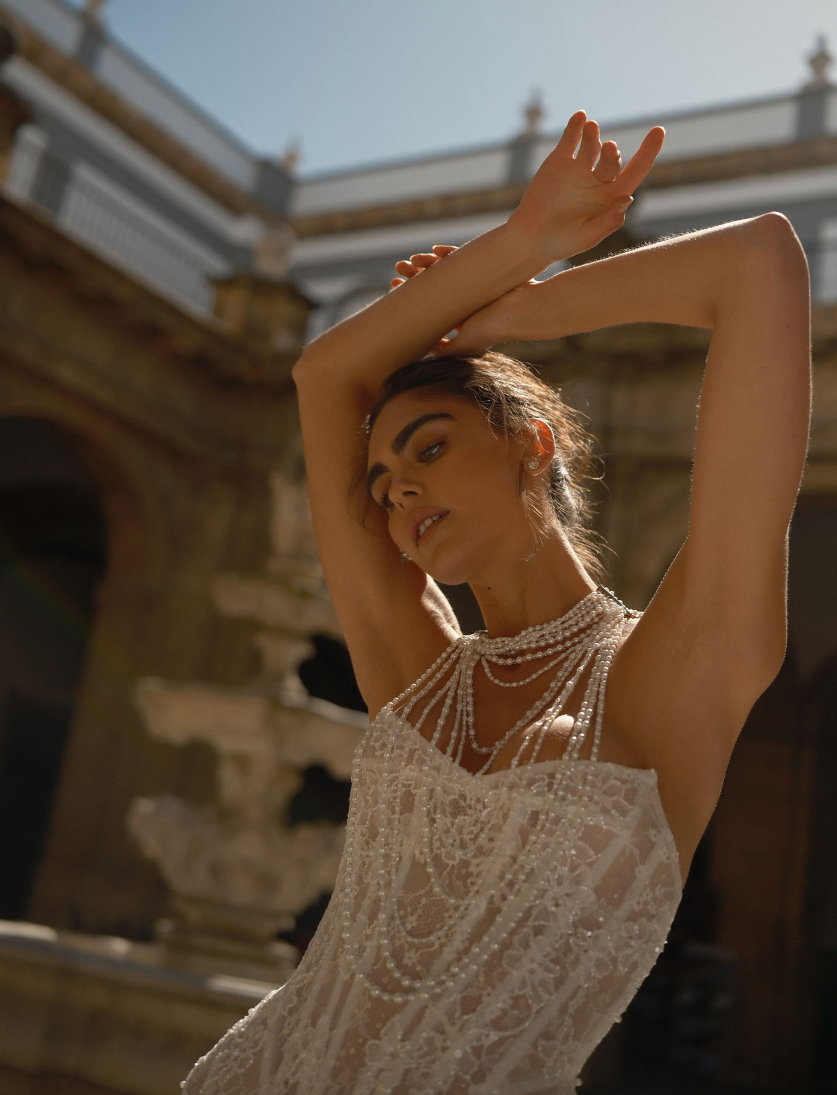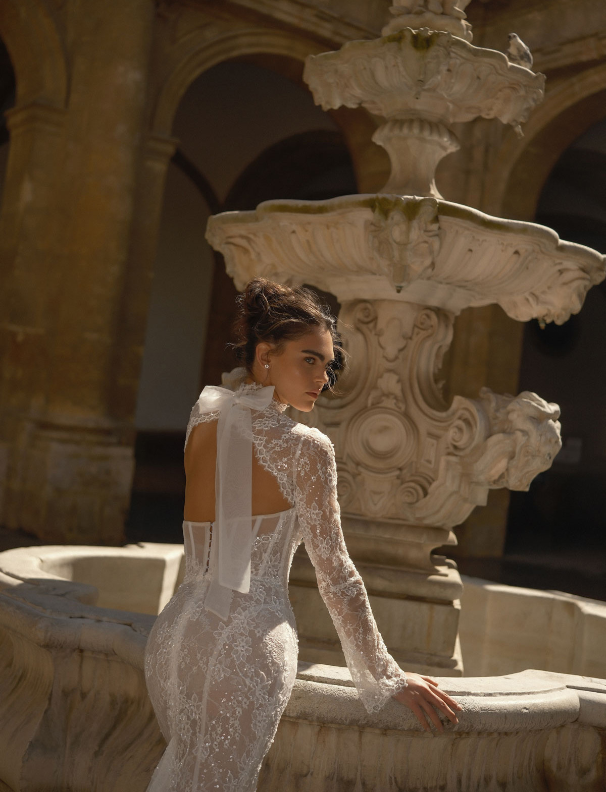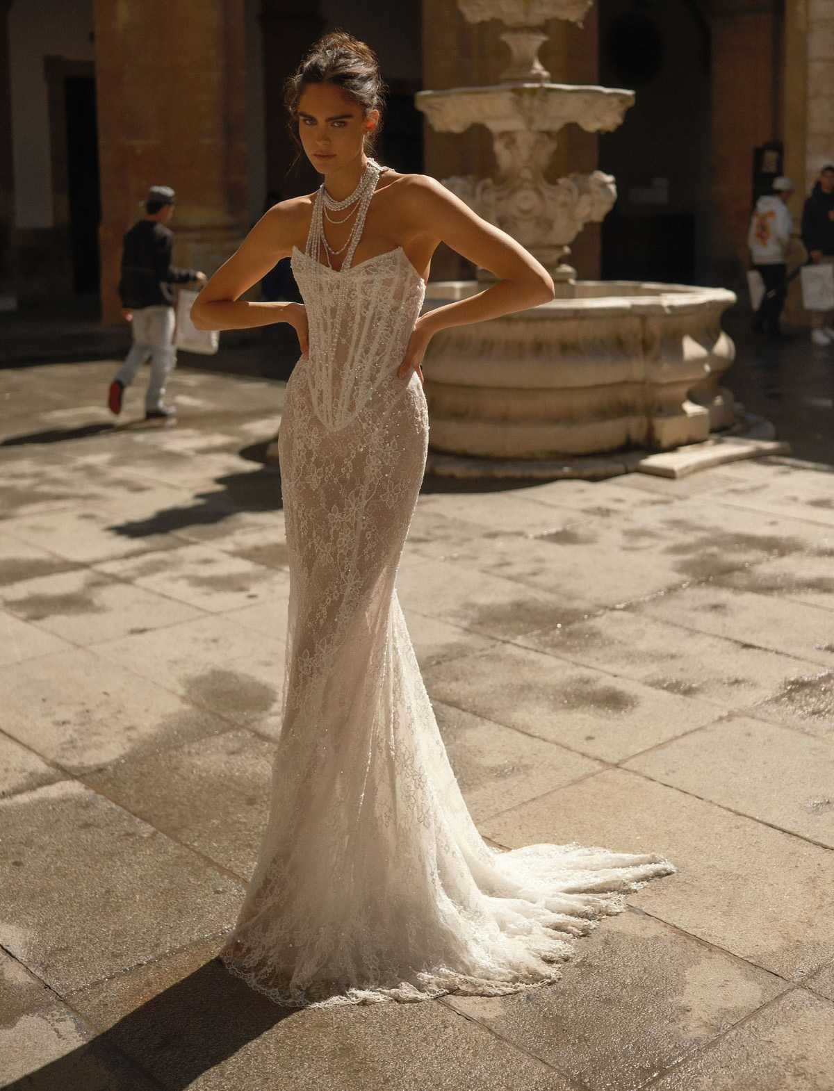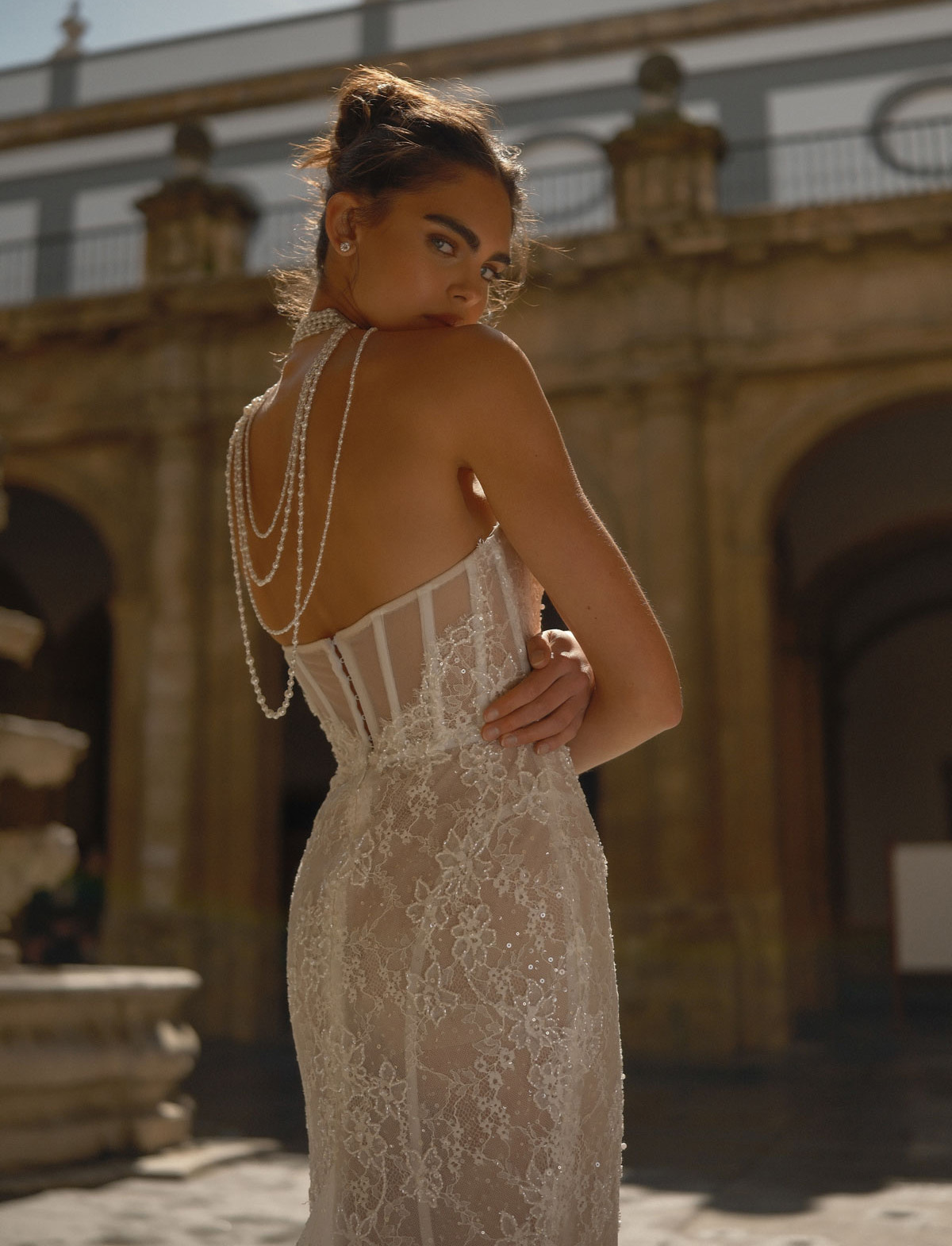 L’abito da sposa Berta Privée all’Atelier Le Spose di Mori unisce sensualità sofisticata e romanticismo audace con una silhouette a sirena che valorizza le curve. Il corpetto rigido con scollo a sorriso in pizzo intarsiato aderisce alla figura, per un effetto di sostegno e stile anche sulla schiena. Eleganti dettagli floreali sul lungo velo. La gonna in pizzo scivola leggera fino a uno strascico svasato, combinando eleganza e leggerezza con motivi floreali e trasparenze. Perfetto per spose glamour e versatili.