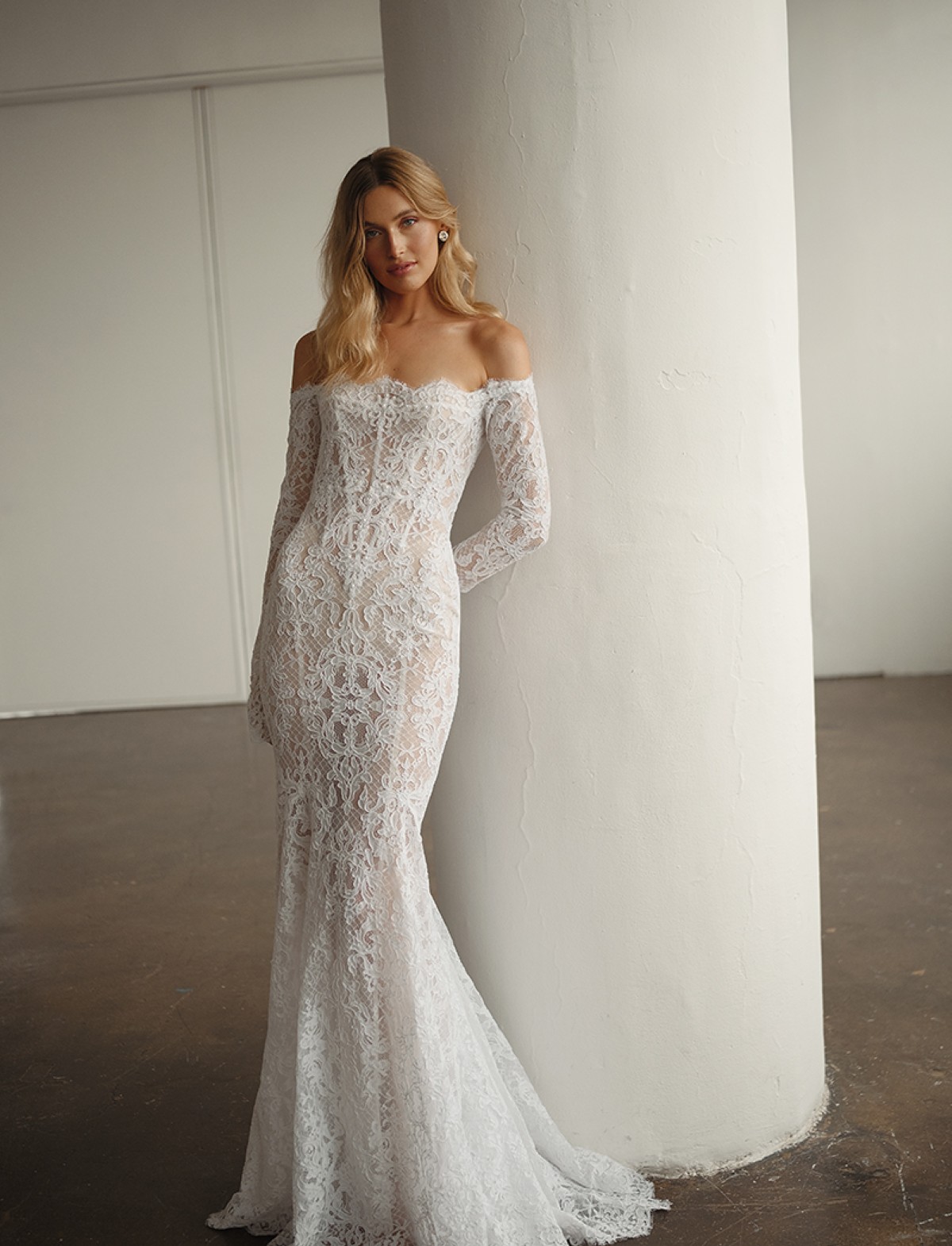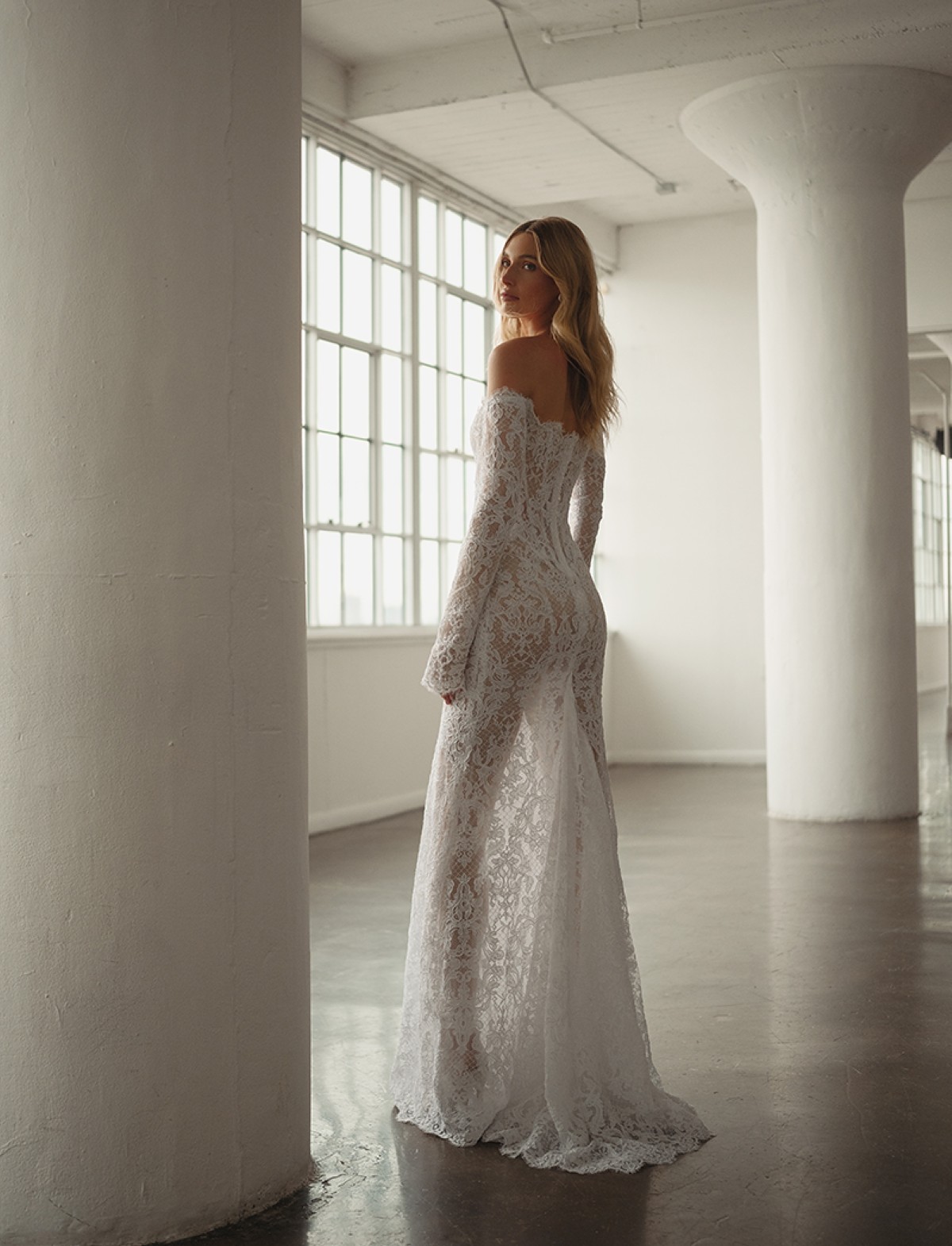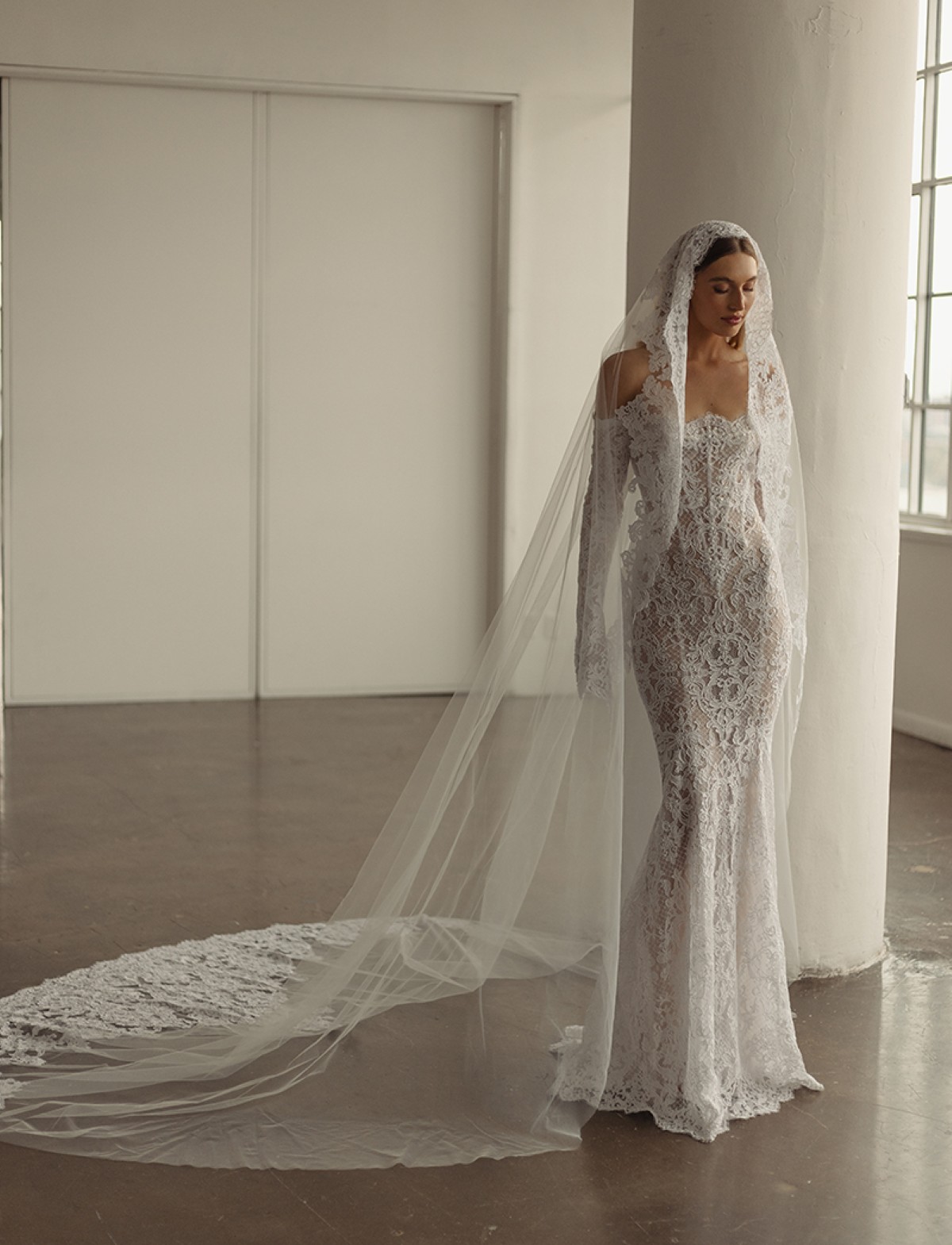 Questo capolavoro è un trionfo di ricami in pizzo floreale e preziose lavorazioni artigianali. Il corpetto steccato offre una struttura impeccabile, mentre il design off-shoulder (spalle scoperte) e le maniche lunghe aderenti in pizzo creano un’armoniosa composizione tra sensualità e raffinatezza. L’intero abito presenta audaci trasparenze che esaltano la texture del pizzo sul corpo. La possibilità di abbinare un sontuoso velo sposa in tulle e pizzo a terra aggiunge un ulteriore tocco fiabesco, rendendo questo abito sofisticato e indimenticabile.
