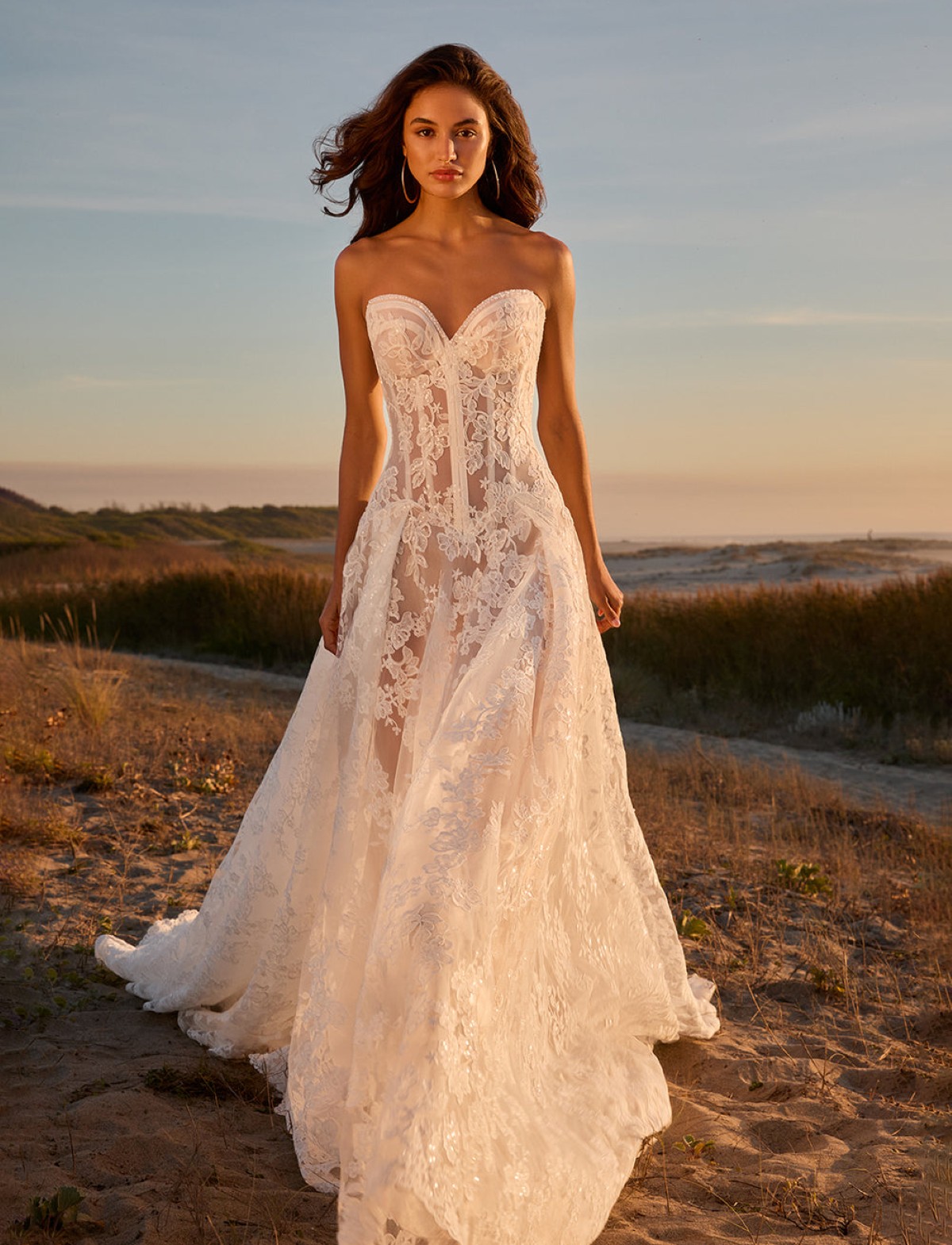 Sotto un cielo dorato, l’abito da sposa Galia Lahav modello Aspire evoca una bellezza eterea e moderna. Questo vestito da sposa romantico presenta un corpetto steccato con scollo a cuore e un design trasparente che rivela l’intricato lavoro dei ricami in pizzo floreale. La gonna, ampia e fluida, si muove con grazia, creando una silhouette che unisce leggerezza e volume. Le applicazioni floreali in pizzo sembrano sbocciare sul tessuto, conferendo un tocco di eleganza sofisticata. Ideale per una sposa che desidera un look glamour, l’abito Aspire è un capolavoro di dettagli sartoriali e lavorazioni artigianali.