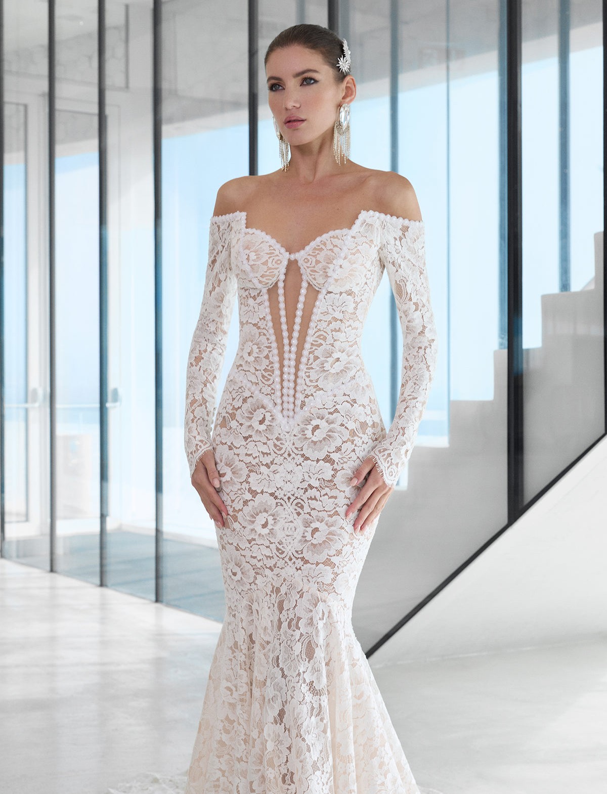 L’abito da sposa Galia Lahav modello Baroness è una celebrazione dell’eleganza sensuale e sofisticata. Questo vestito da sposa moderno si distingue per la sua audace e impeccabile silhouette a sirena, che avvolge la figura con grazia. Il capo è interamente realizzato in un prezioso pizzo floreale. Le maniche in pizzo e le delicate spalline scese aggiungono un tocco di romanticismo, mettendo in risalto le spalle in un modo estremamente raffinato. Un dettaglio che cattura l’attenzione è la profonda scollatura centrale a V sul corpetto, ornata da una fila di piccole perle che aggiungono un tocco di lusso. Questo abito da sposa è la scelta perfetta per una sposa glamour che desidera un look che esalti la sua femminilità con un’atmosfera da diva. I dettagli sartoriali e le lavorazioni artigianali di Galia Lahav rendono questo abito un pezzo unico e memorabile.