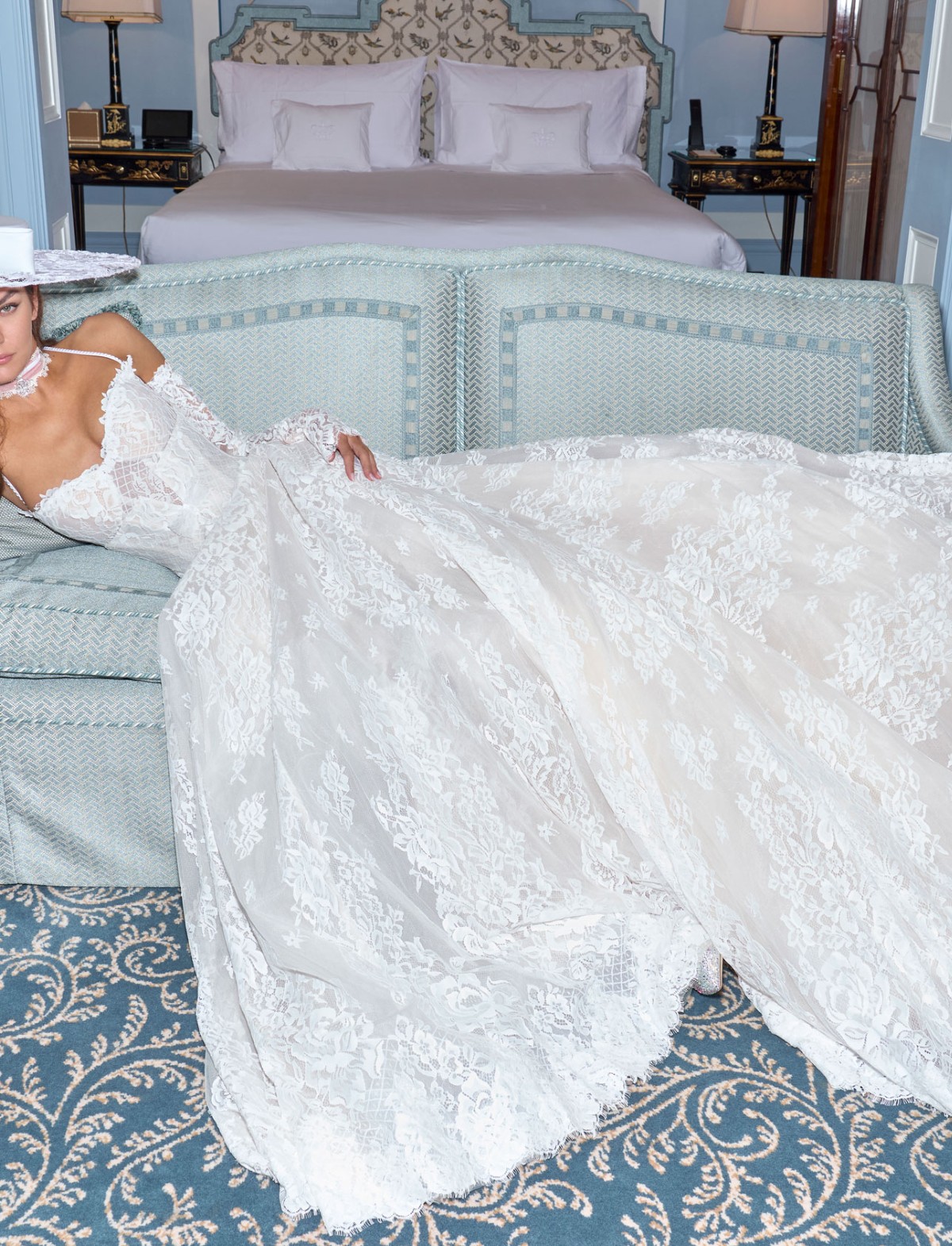 L’abito da sposa Chelsea, firmato Galia Lahav, è un capolavoro di romanticismo sartoriale e seduzione contemporanea. Questo modello A-line si distingue per il sontuoso utilizzo di pizzo francese a motivi floreali, che avvolge l’intera silhouette creando un effetto di intramontabile eleganza.