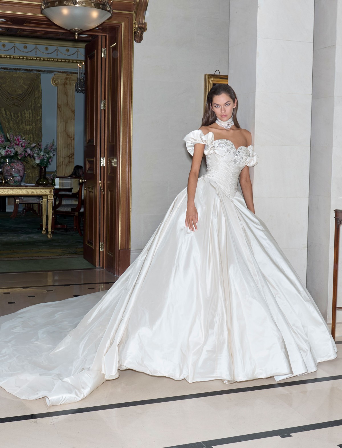 Il corpetto è finemente strutturato, caratterizzato da un design off-the-shoulder con maniche a sbuffo drappeggiate e una scollatura a cuore impreziosita da delicati ricami di cristalli e perle. Il punto vita ribassato enfatizza la figura, conferendo un tocco contemporaneo a un classico intramontabile, perfetto per una sposa che desidera un look da vera principessa d’altri tempi.