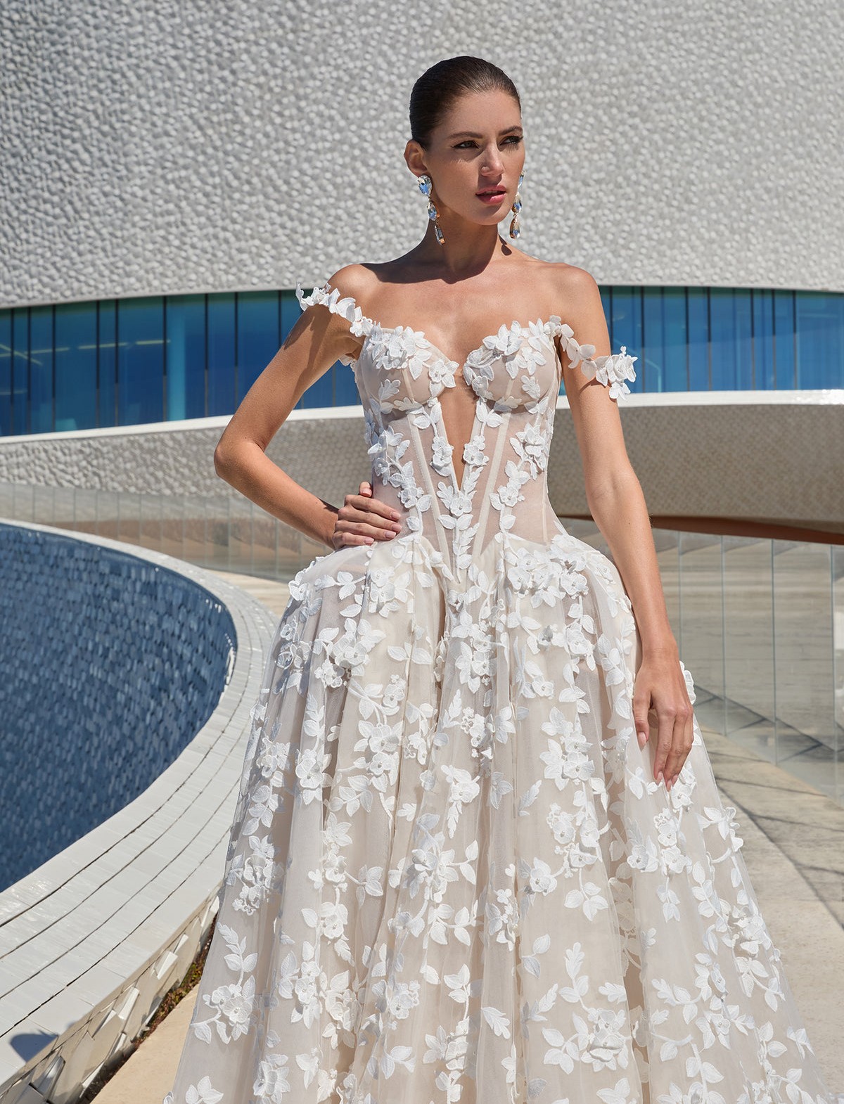 L’abito da sposa Galia Lahav modello Petal è un’opera d’arte, che unisce lo stile principesco a una sensualità moderna. Questo vestito da sposa romantico evoca un’atmosfera da fiaba, grazie al suo design ricco di dettagli sartoriali. Il corpetto steccato presenta una profonda scollatura a V e audaci trasparenze che slanciano la figura, mentre le delicate spalline scese e le applicazioni floreali in pizzo 3D creano un look sognante. La gonna ampia, con la sua silhouette a linea A, cade maestosamente, ricoperta da una cascata di applicazioni floreali che conferiscono volume e un senso di leggerezza eterea. I ricami in pizzo sono un esempio di lavorazioni artigianali di altissimo livello. L’abito Petal è l’ideale per una sposa glamour che desidera un look regale e indimenticabile, senza rinunciare a un tocco di audacia contemporanea.