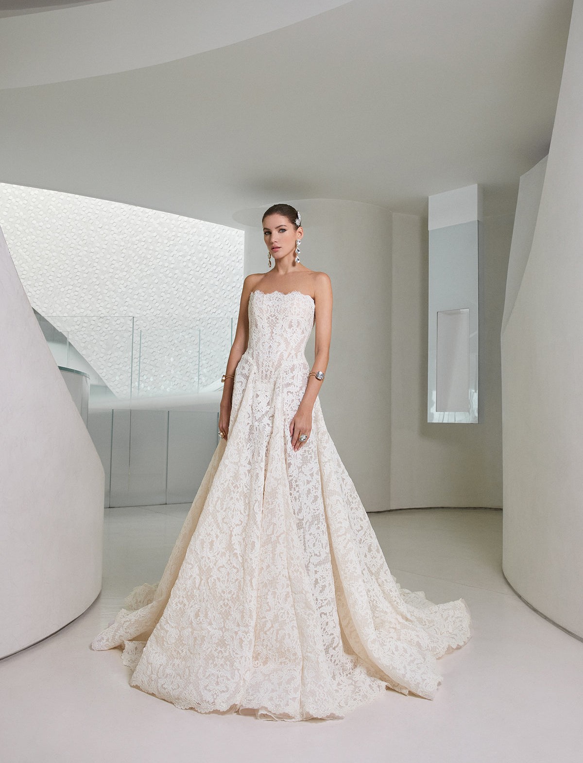 L’abito da sposa Galia Lahav modello Splendid è un’espressione di eleganza senza tempo, perfetto per una sposa che sogna un look principesco e al tempo stesso sofisticato. Questo vestito da sposa romantico presenta una gonna ampia e maestosa con una silhouette a linea A che dona una presenza regale. Il capo è interamente realizzato in un magnifico pizzo, che crea un effetto di lusso e ricchezza. Il corpetto senza spalline, con scollo dritto, è finemente ricamato, evidenziando le lavorazioni artigianali di Galia Lahav. La struttura e il volume della gonna, pur mantenendo un’aria di leggerezza, conferiscono un senso di imponenza e raffinatezza. L’abito Splendid è consigliato per una sposa che desidera un look classico con un tocco di glamour, per sentirsi la vera protagonista di una favola nel giorno del suo matrimonio.