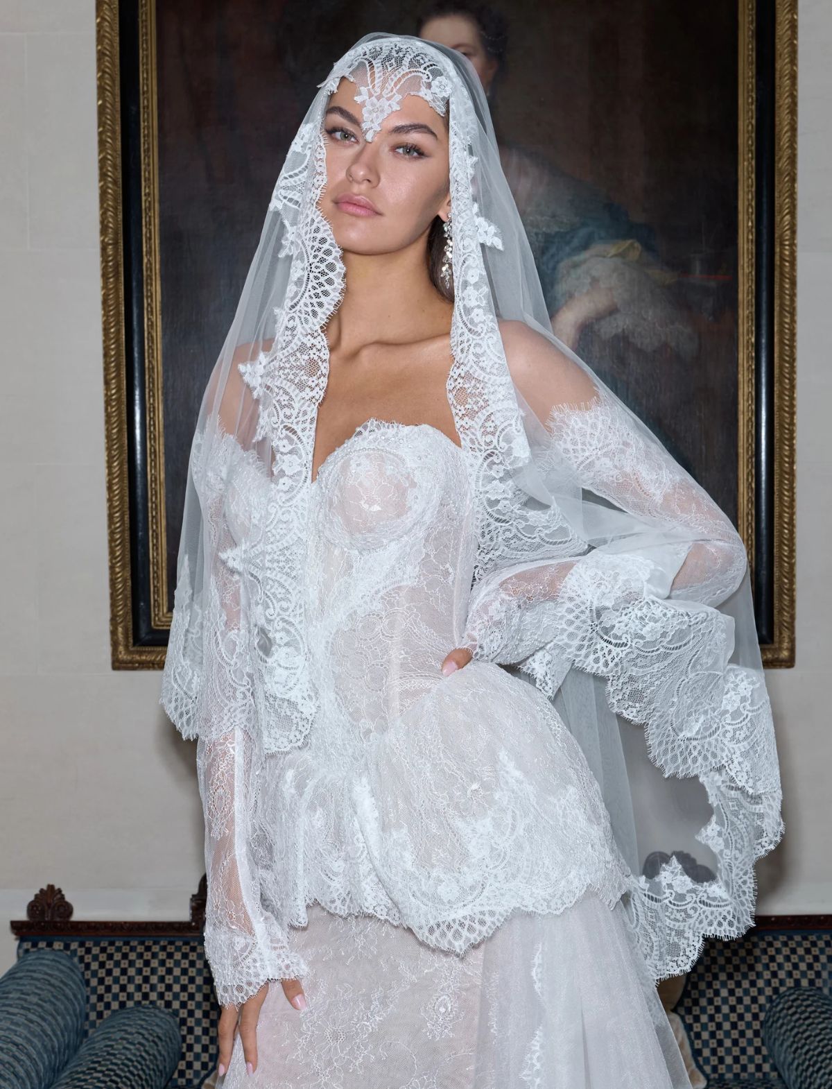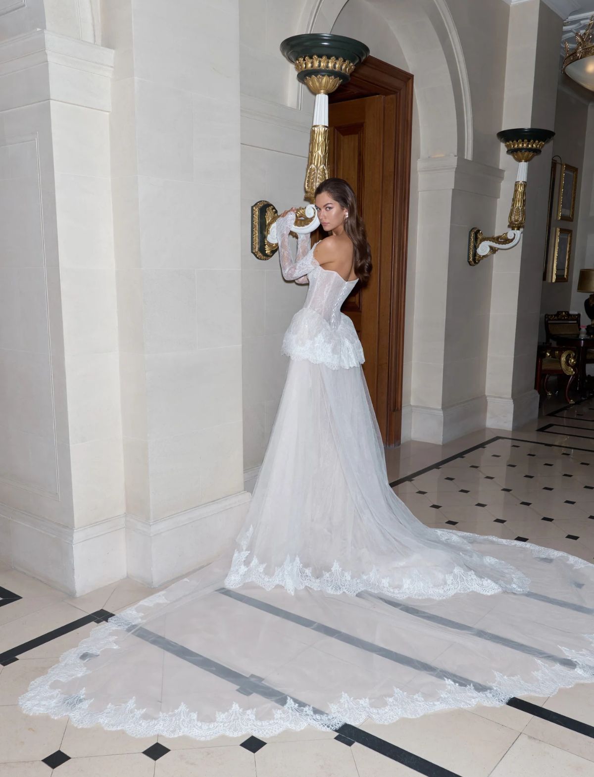 Realizzato in pregiato pizzo francese e tulle scintillante, l’abito presenta maniche lunghe staccabili e una scenografica mantovana in pizzo sui fianchi. Il lungo strascico trasparente, rifinito con bordi ricamati, completa il look, trasformando la sposa in una figura eterea e sofisticata, perfetta per un matrimonio da favola.