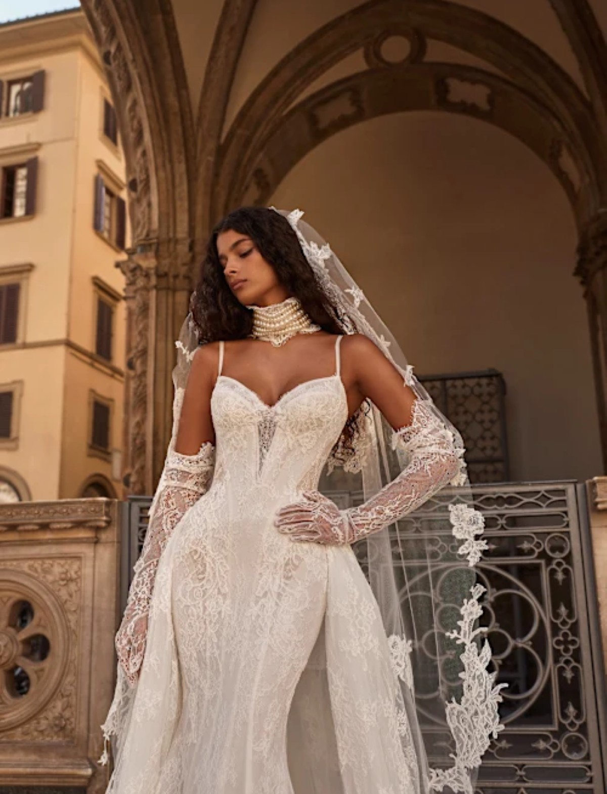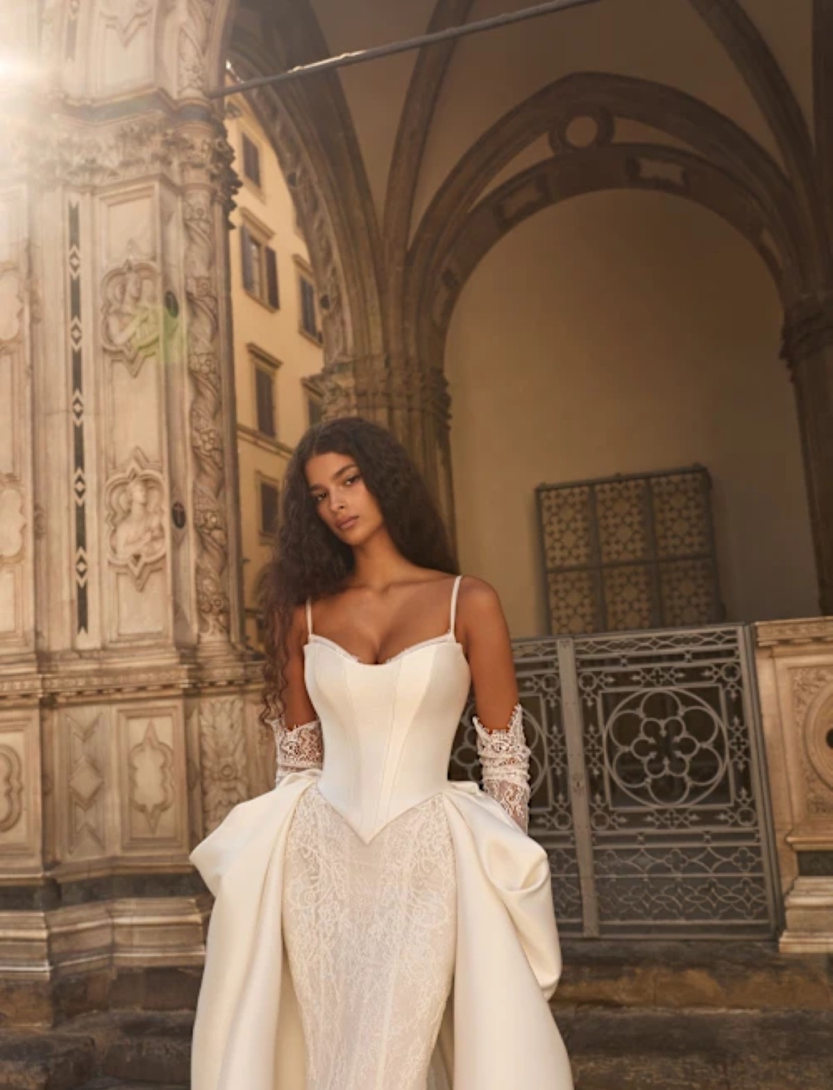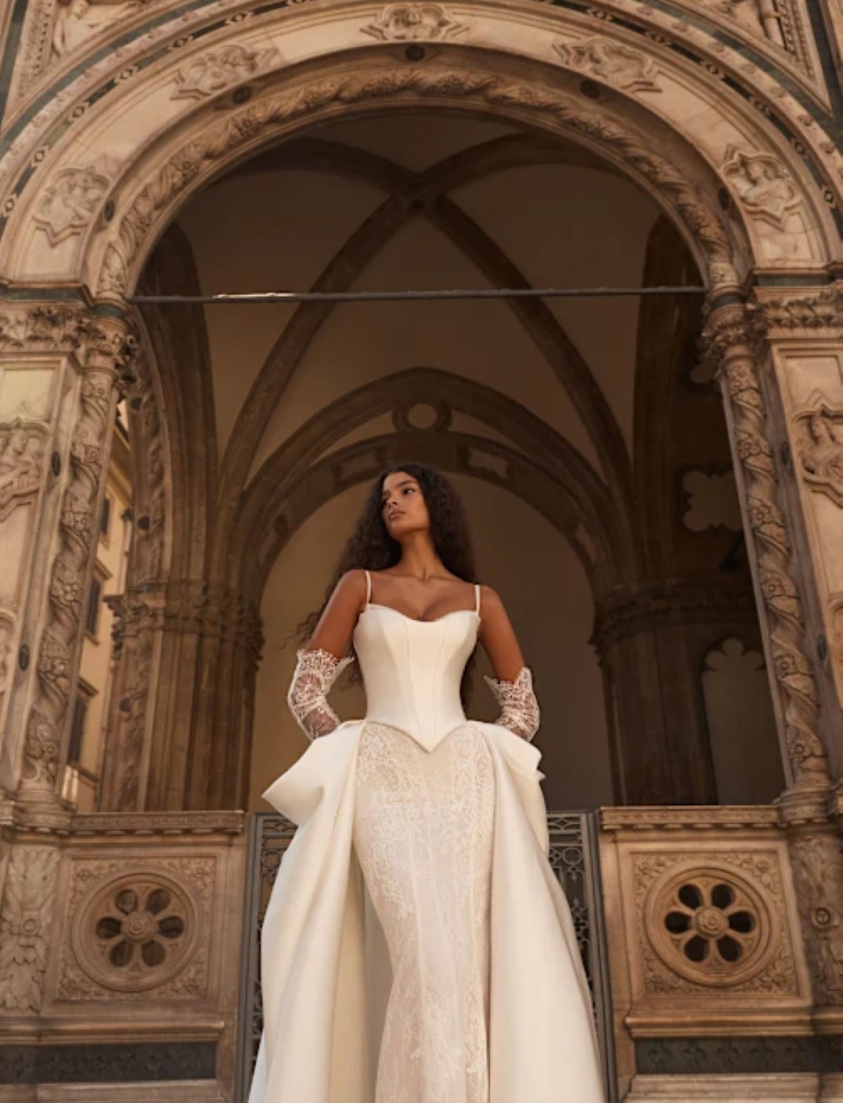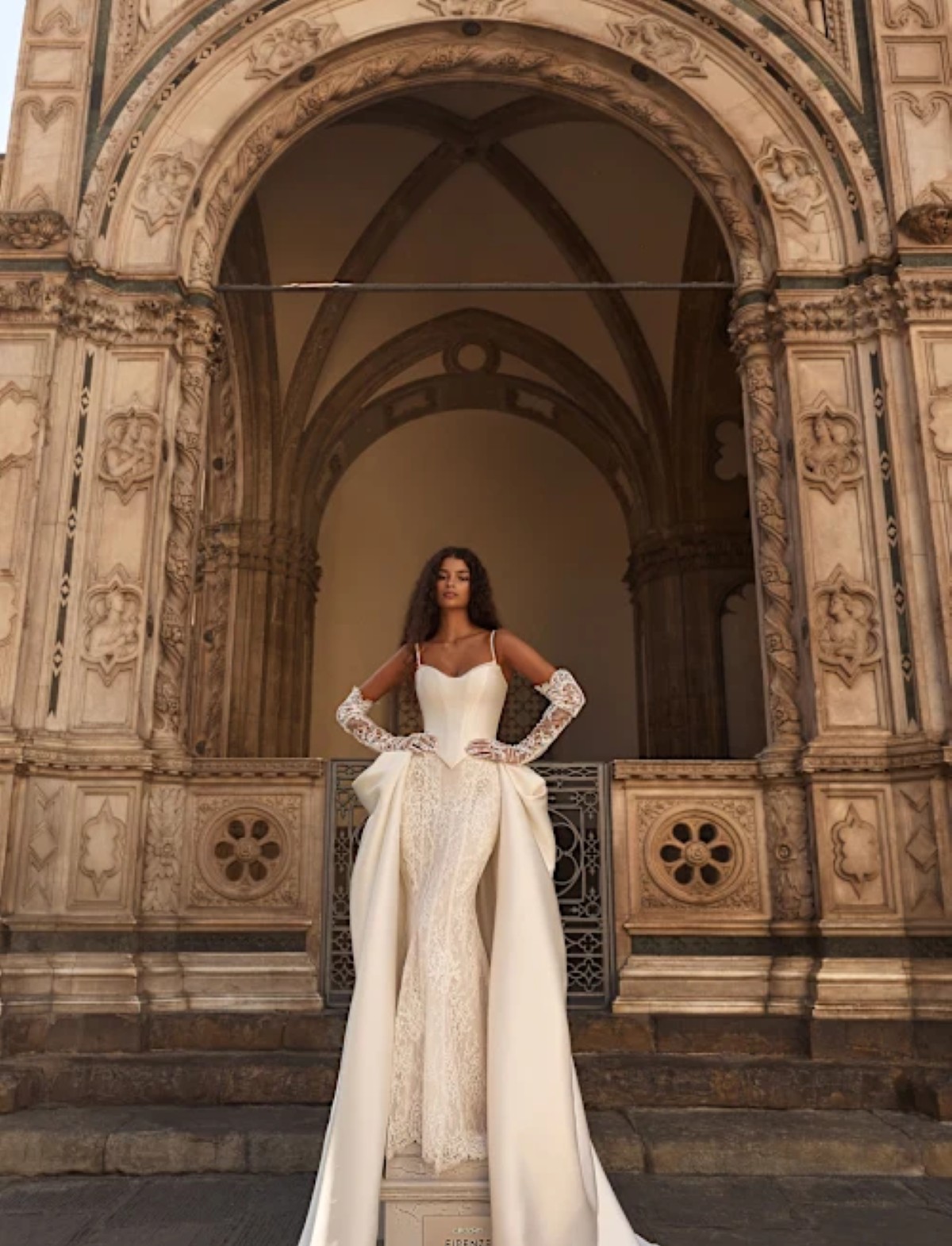La silhouette a sirena, avvolgente e sensuale, è arricchita da una spettacolare sopragonna in mikado o seta strutturata che crea volumi scenografici e un fascino regale. I dettagli artigianali, come i raffinati guanti in pizzo coordinati, aggiungono un tocco glamour d’altri tempi. È la scelta ideale per chi cerca un mix audace tra rigore contemporaneo e romanticismo classico.