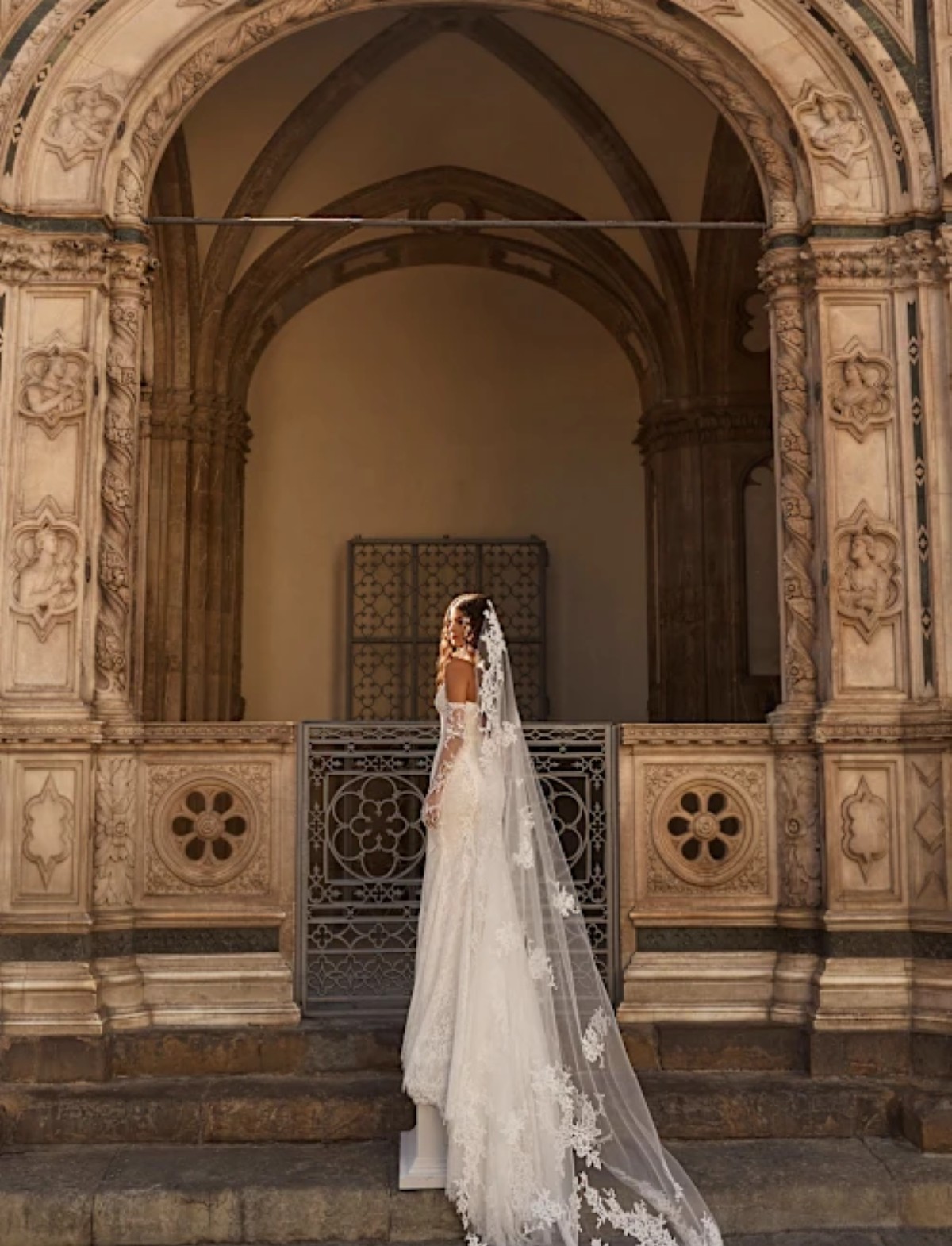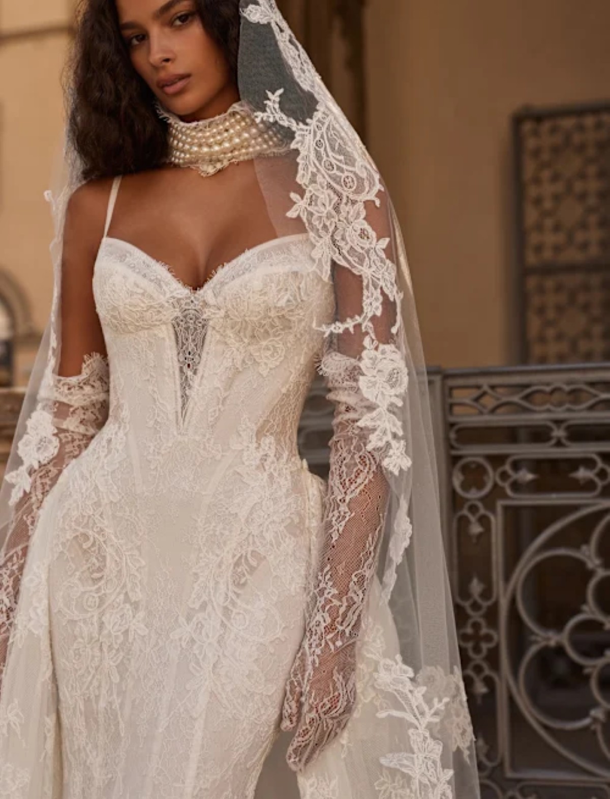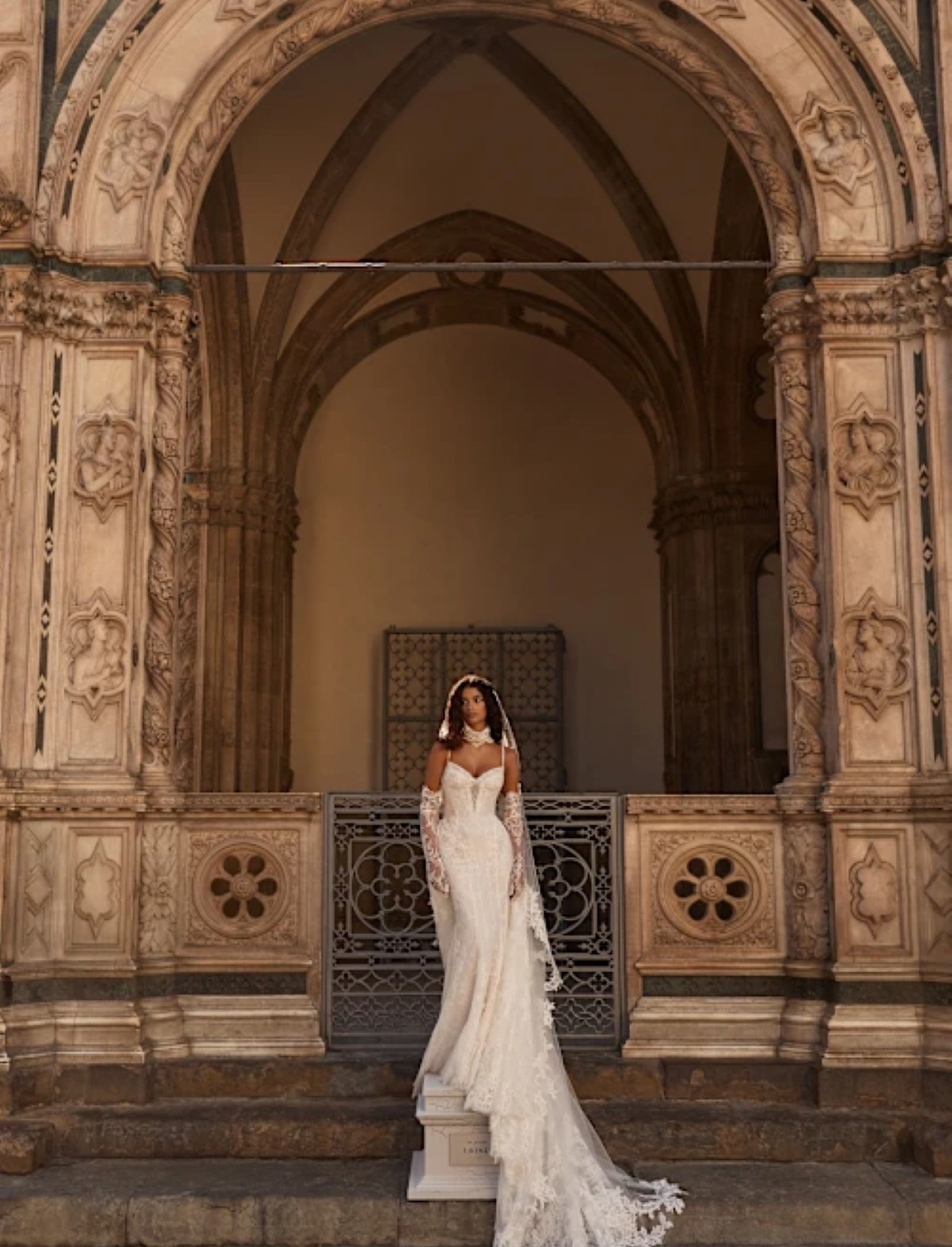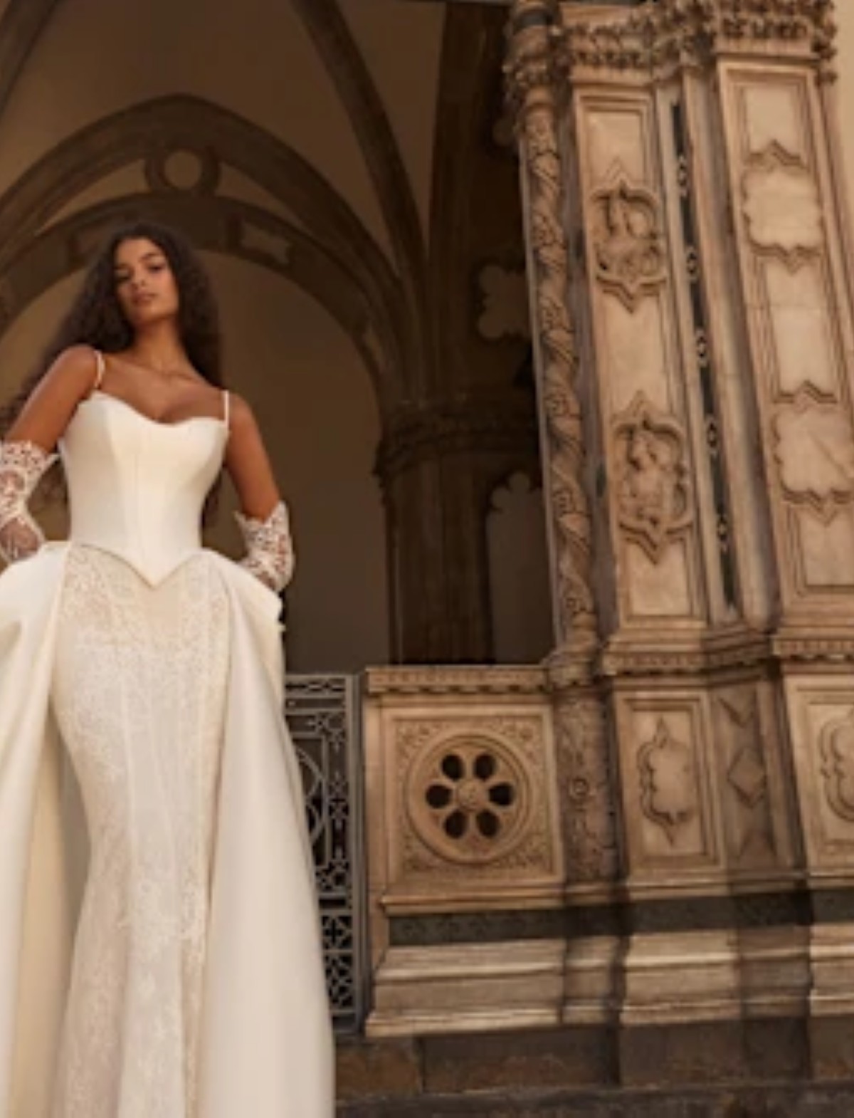 La silhouette a sirena, avvolgente e sensuale, è arricchita da una spettacolare sopragonna in mikado o seta strutturata che crea volumi scenografici e un fascino regale. I dettagli artigianali, come i raffinati guanti in pizzo coordinati, aggiungono un tocco glamour d’altri tempi. È la scelta ideale per chi cerca un mix audace tra rigore contemporaneo e romanticismo classico.