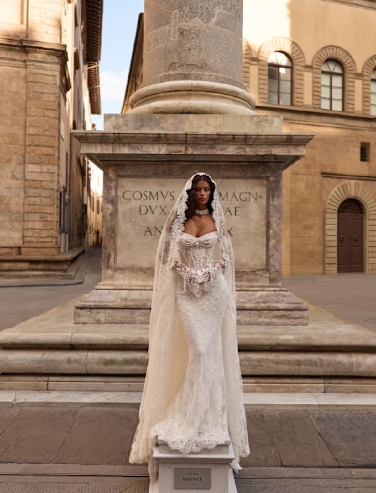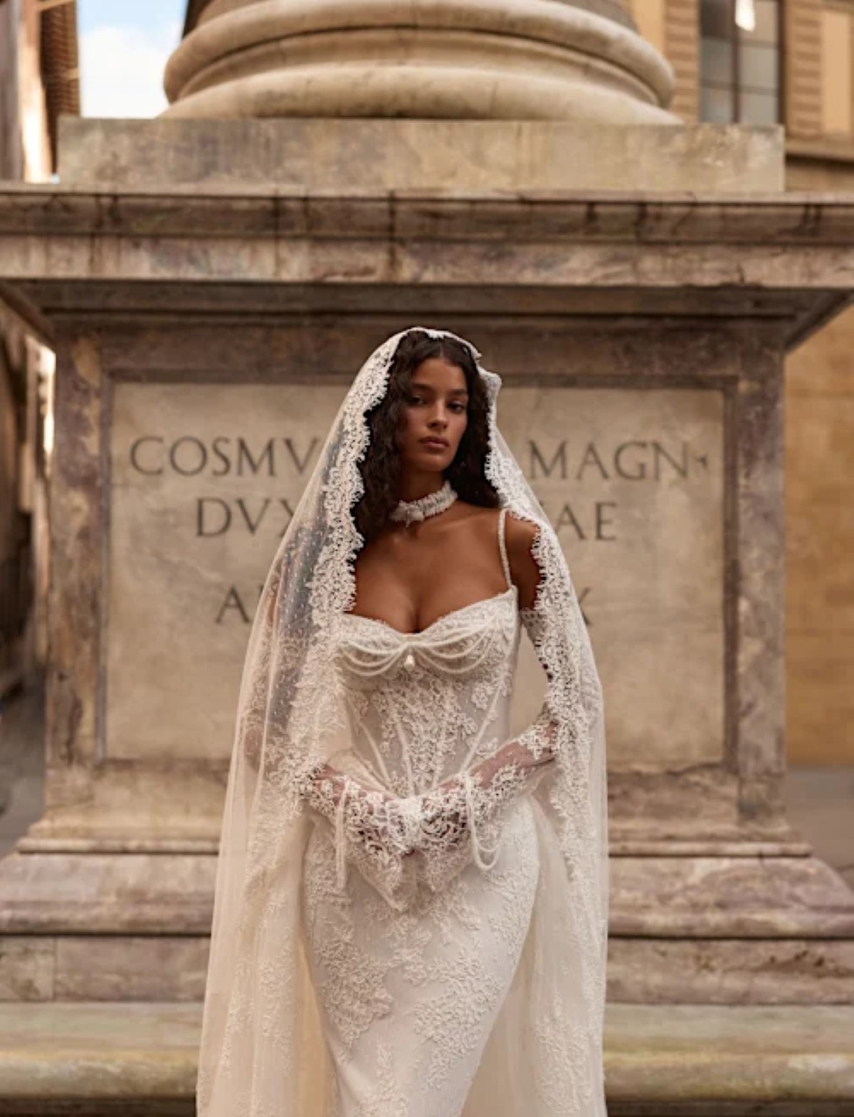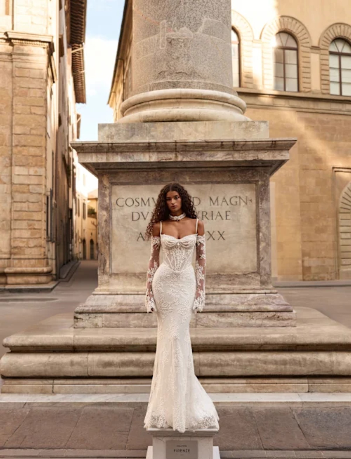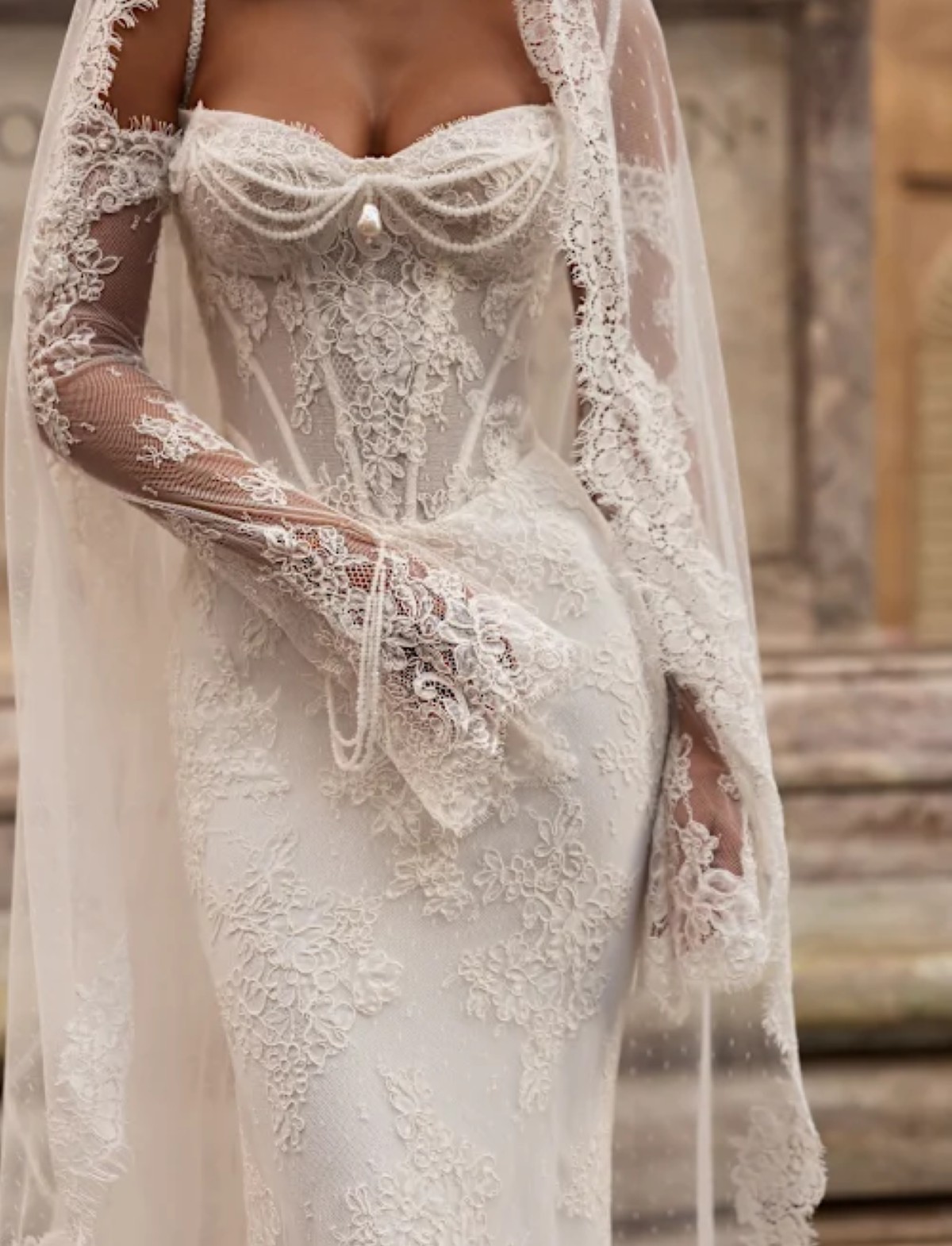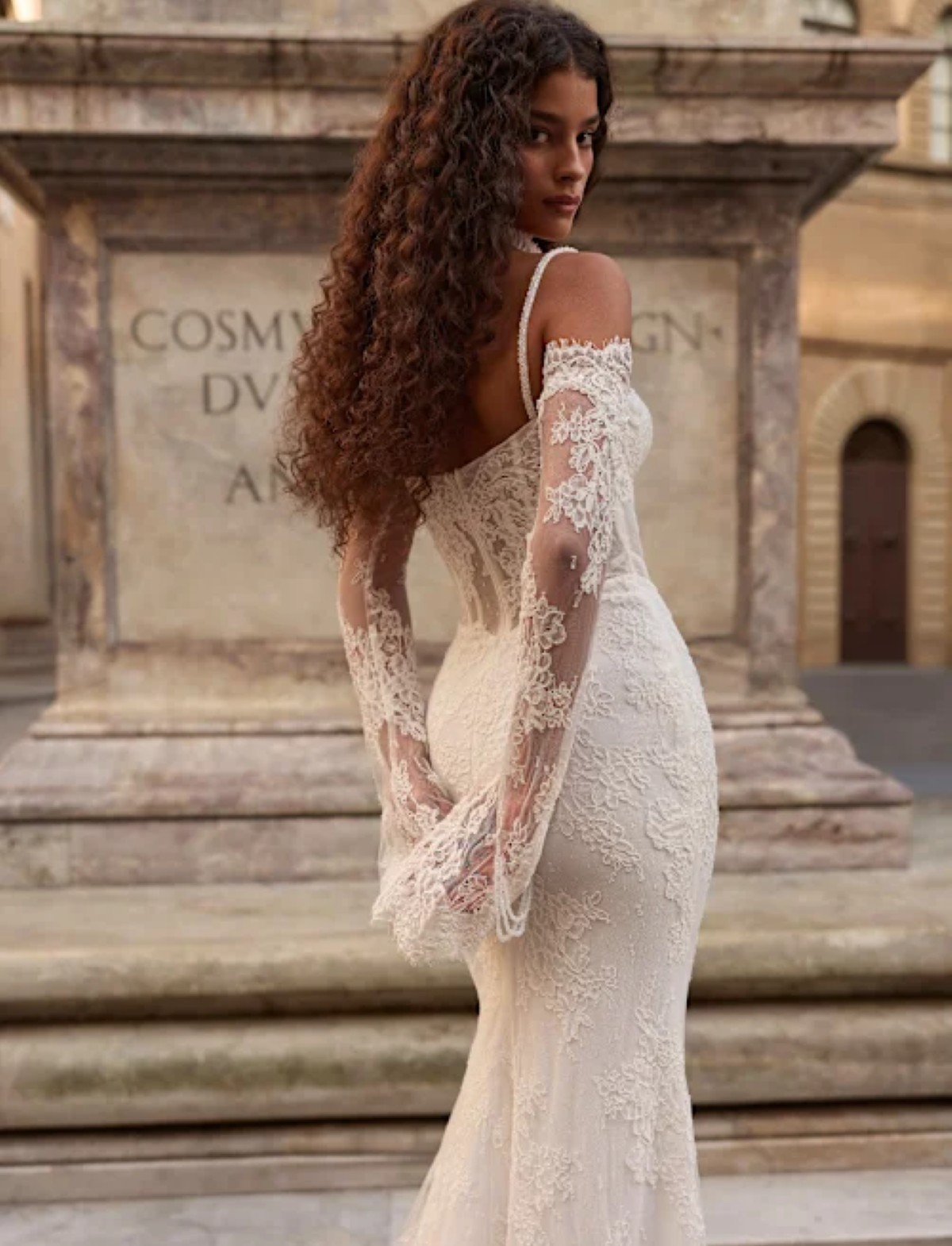 Le spettacolari maniche in pizzo a campana e il collarino gioiello aggiungono un tocco glamour e ricercato. Realizzato con lavorazioni artigianali su una base di tulle e pizzo chantilly, l’abito Botticella comunica un’atmosfera fiabesca e sensuale. È la scelta ideale per la sposa moderna che desidera un look scultoreo e ricco di dettagli preziosi, perfetto per una scenografia d’altri tempi come quella proposta dall’Atelier Le Spose di Mori.