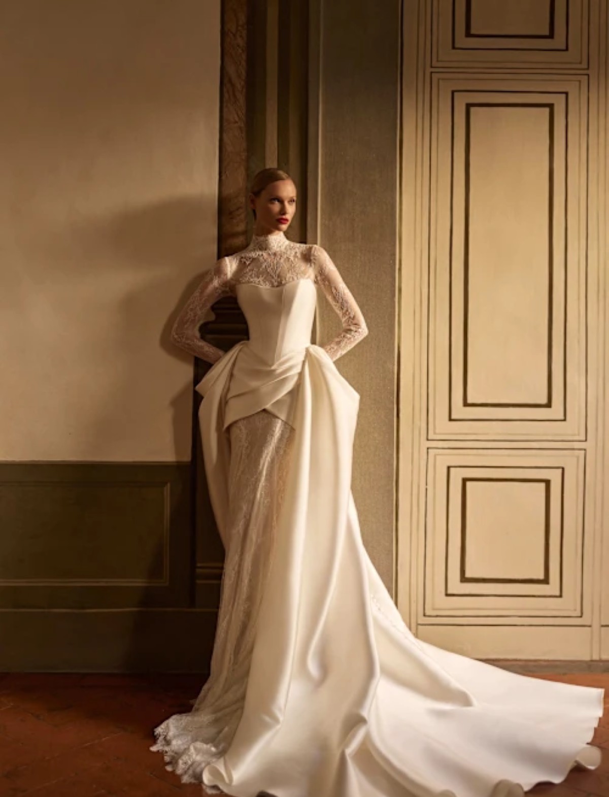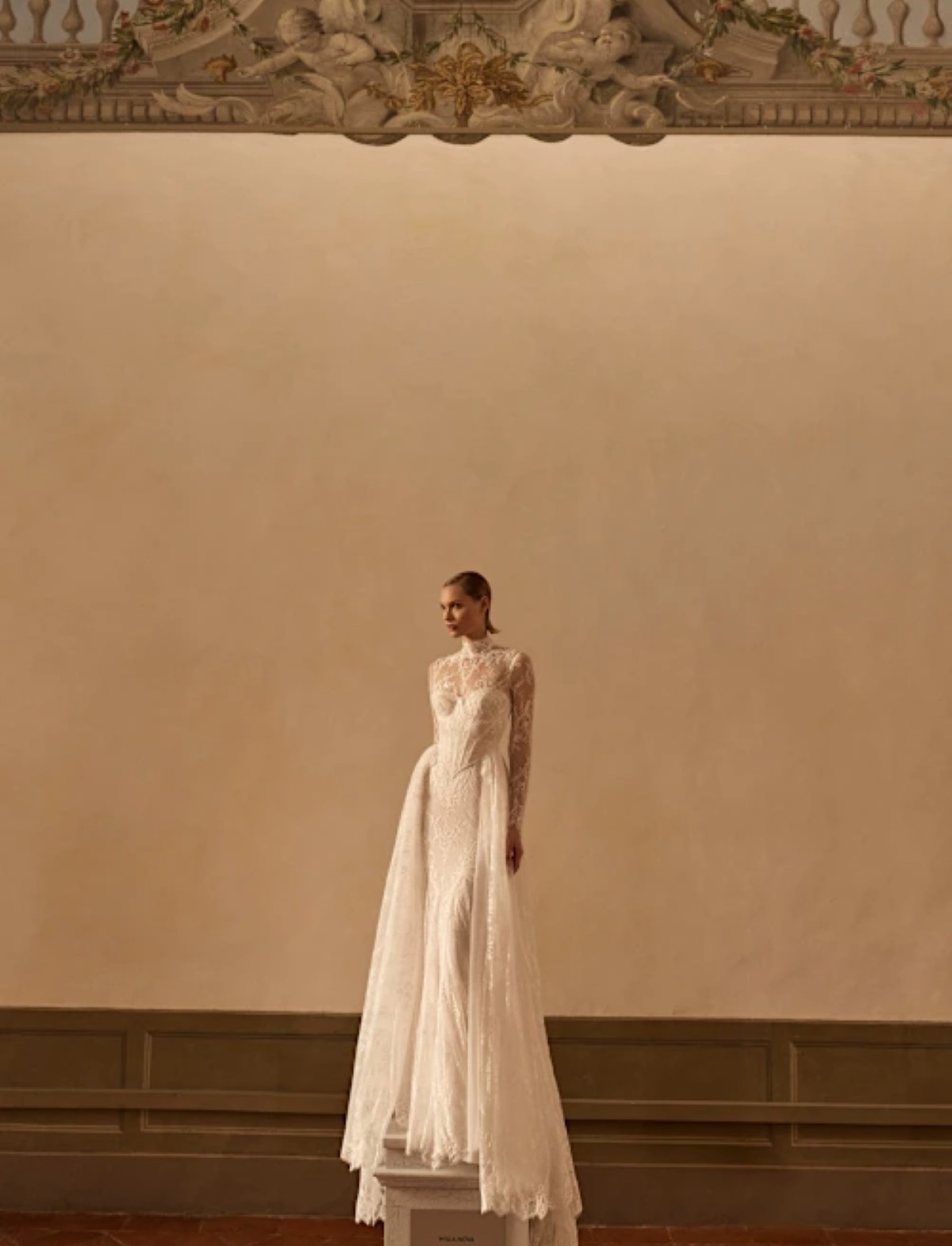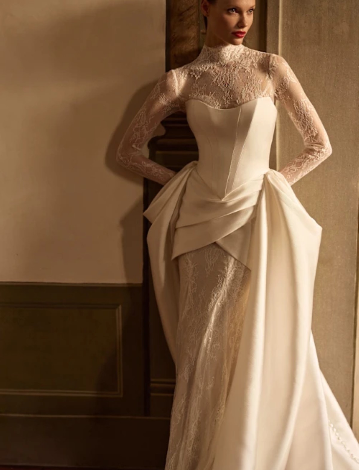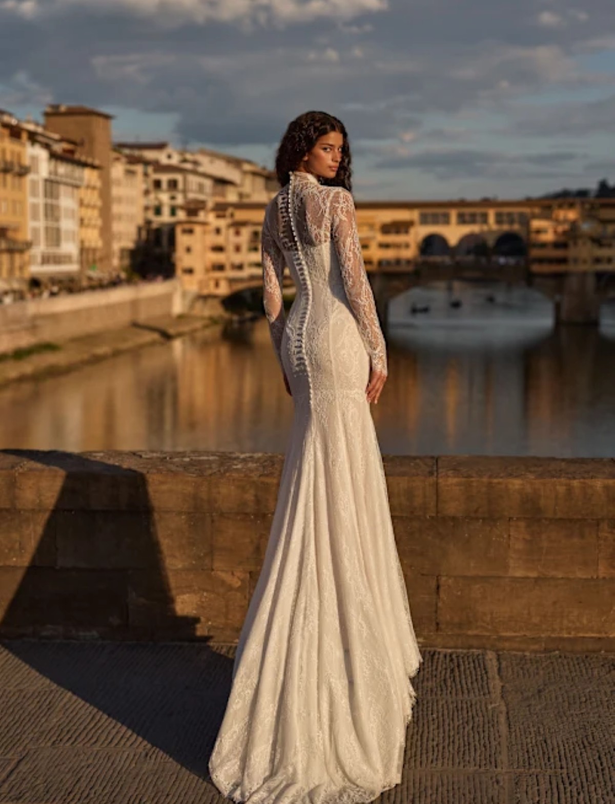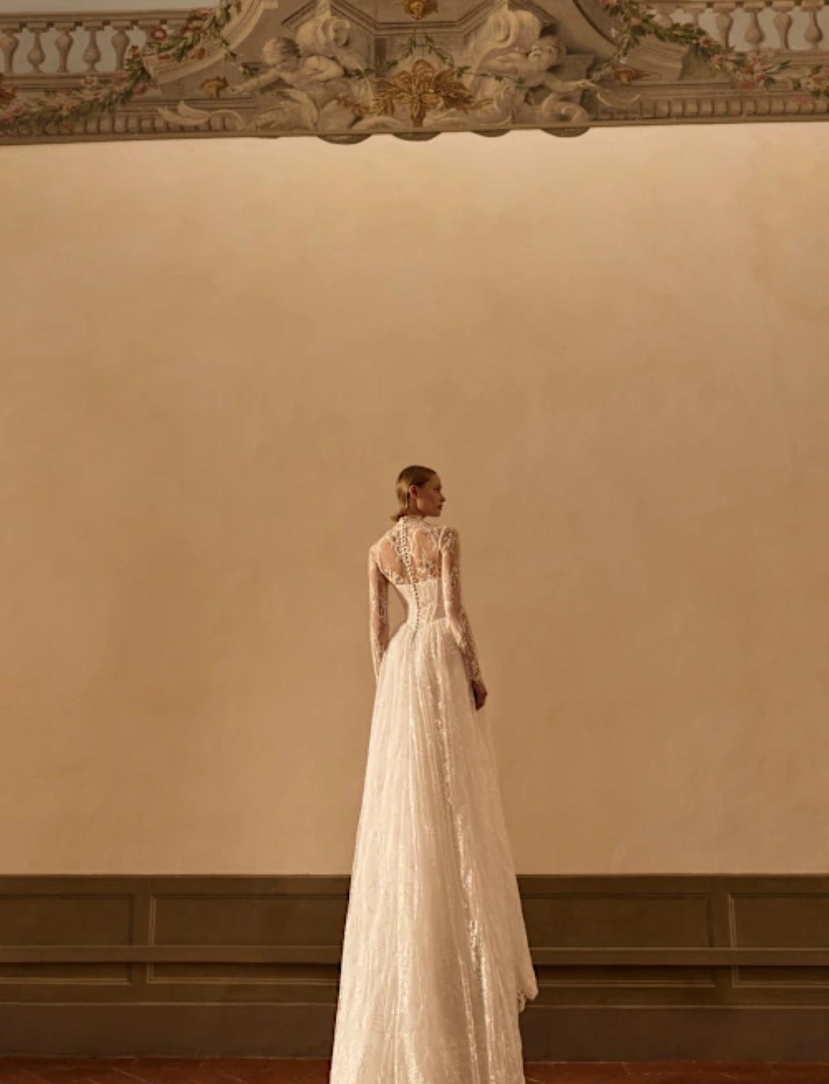 La silhouette a sirena, finemente ricamata, avvolge il corpo con grazia, mentre la possibilità di aggiungere una sopragonna in seta o mikado trasforma il volume in un modello principesco. Ogni dettaglio sartoriale, dai raffinati bottoncini sulla schiena alle trasparenze studiate, evoca un’atmosfera fiabesca e glamour. Perfetto per chi cerca un look d’alta moda che unisca tradizione e innovazione.