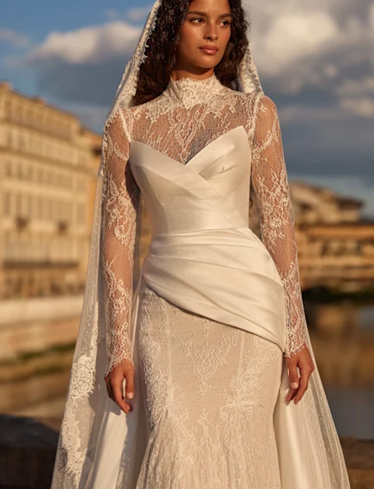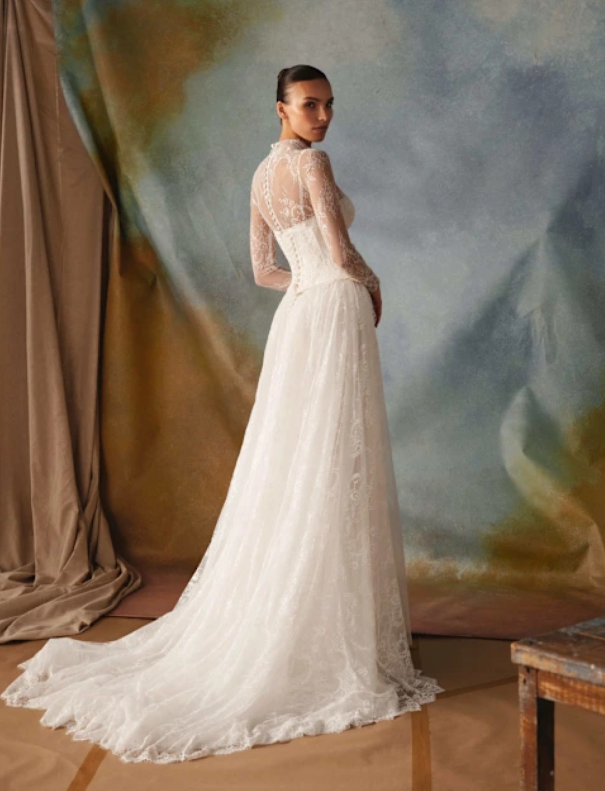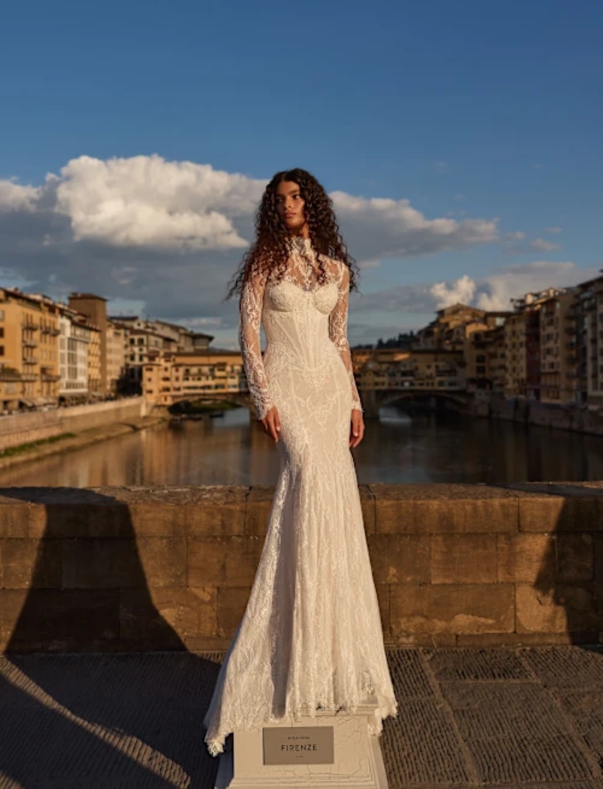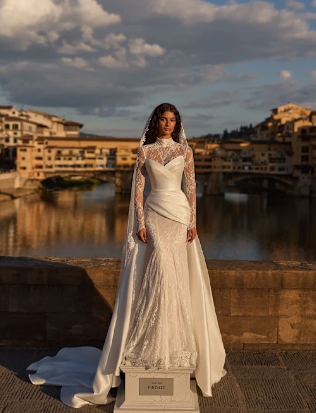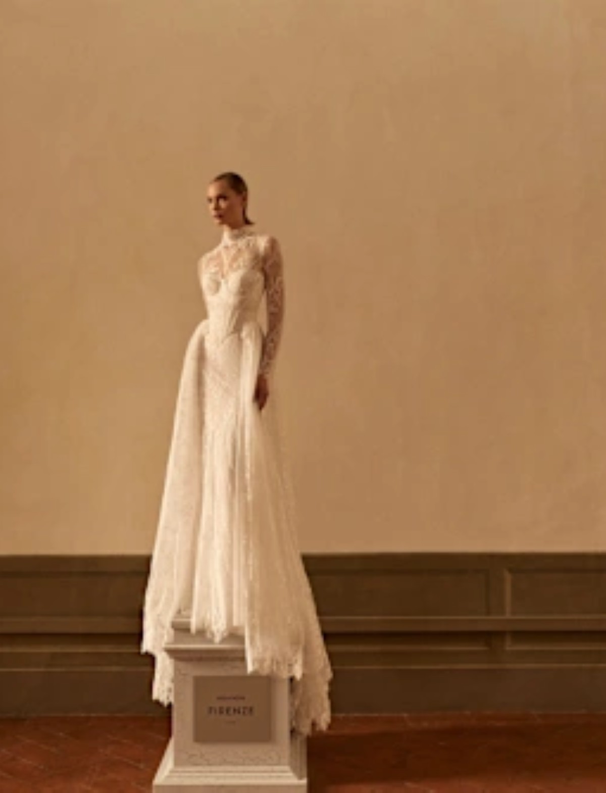 La silhouette a sirena, finemente ricamata, avvolge il corpo con grazia, mentre la possibilità di aggiungere una sopragonna in seta o mikado trasforma il volume in un modello principesco. Ogni dettaglio sartoriale, dai raffinati bottoncini sulla schiena alle trasparenze studiate, evoca un’atmosfera fiabesca e glamour. Perfetto per chi cerca un look d’alta moda che unisca tradizione e innovazione.