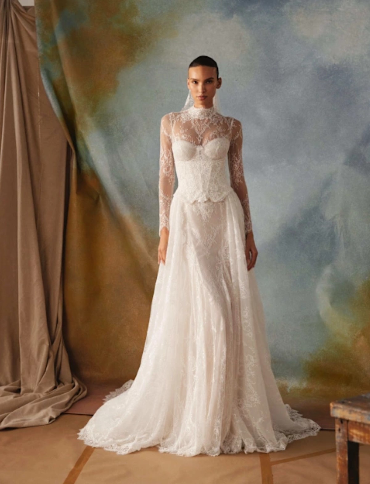 Lasciati incantare dal fascino senza tempo dell’abito da sposa Caravellia firmato D’Art. Questo vestito da sposa romantico e sofisticato è un capolavoro di lavorazioni artigianali, pensato per una sposa che desidera un’eleganza regale con un tocco moderno. Il design si distingue per un maestoso corpetto steccato a collo alto, interamente realizzato in pregiato pizzo chantilly con delicate applicazioni floreali che risalgono lungo le maniche in tulle trasparenti.