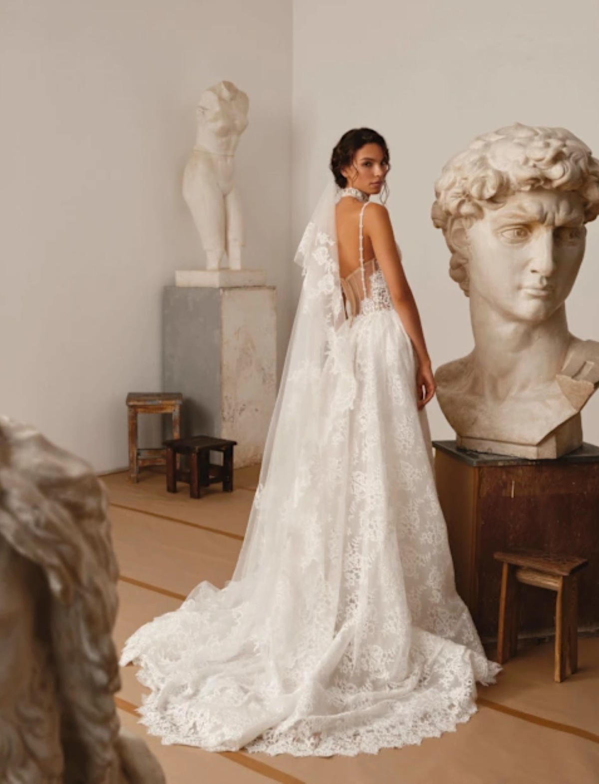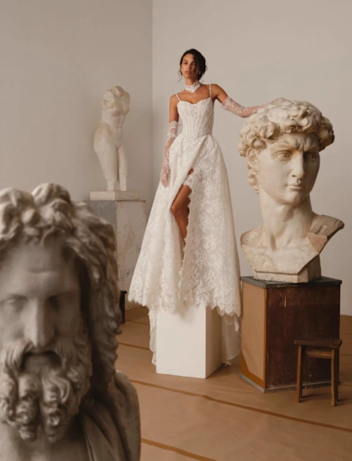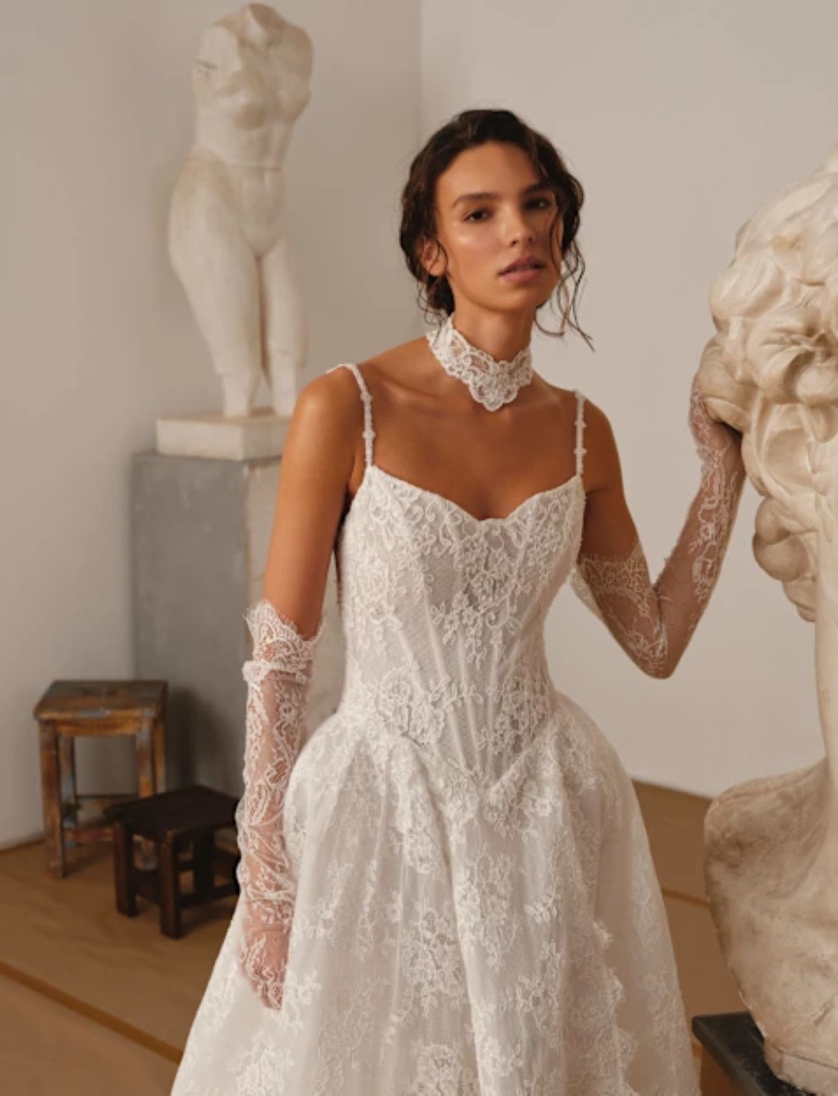 L’abito da sposa PITTURA firmato D’ART incarna un’eleganza romantica e sofisticata, ispirata alla delicatezza dell’arte classica. Questo vestito da sposa presenta un raffinato corpetto steccato con spalline sottili, impreziosito da ricami in pizzo che scolpiscono il busto con leggerezza e femminilità. La gonna ampia in pizzo ricamato, con sensuale spacco frontale, crea una silhouette A-line fluida e scenografica. Completano il look guanti in pizzo e un delicato choker coordinato. Perfetto per la sposa moderna e glamour che desidera un abito da sposa romantico, ricco di dettagli sartoriali e lavorazioni artigianali.