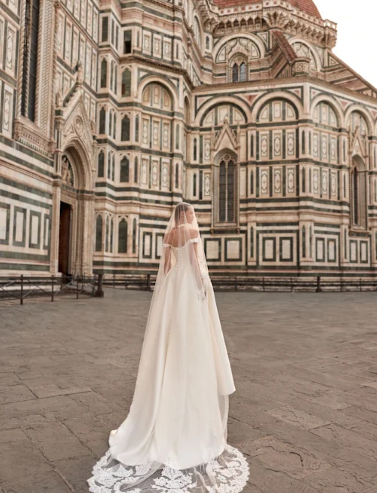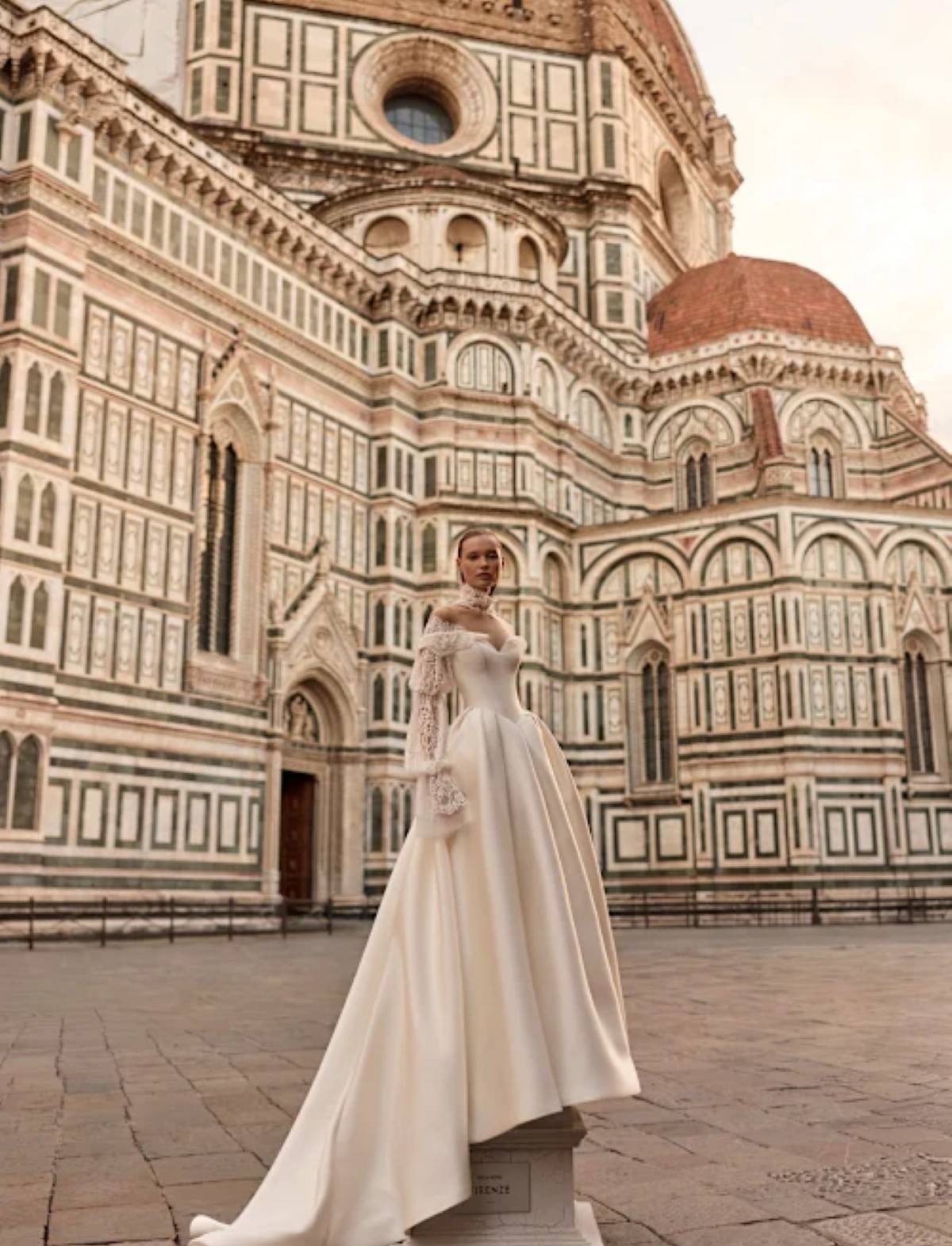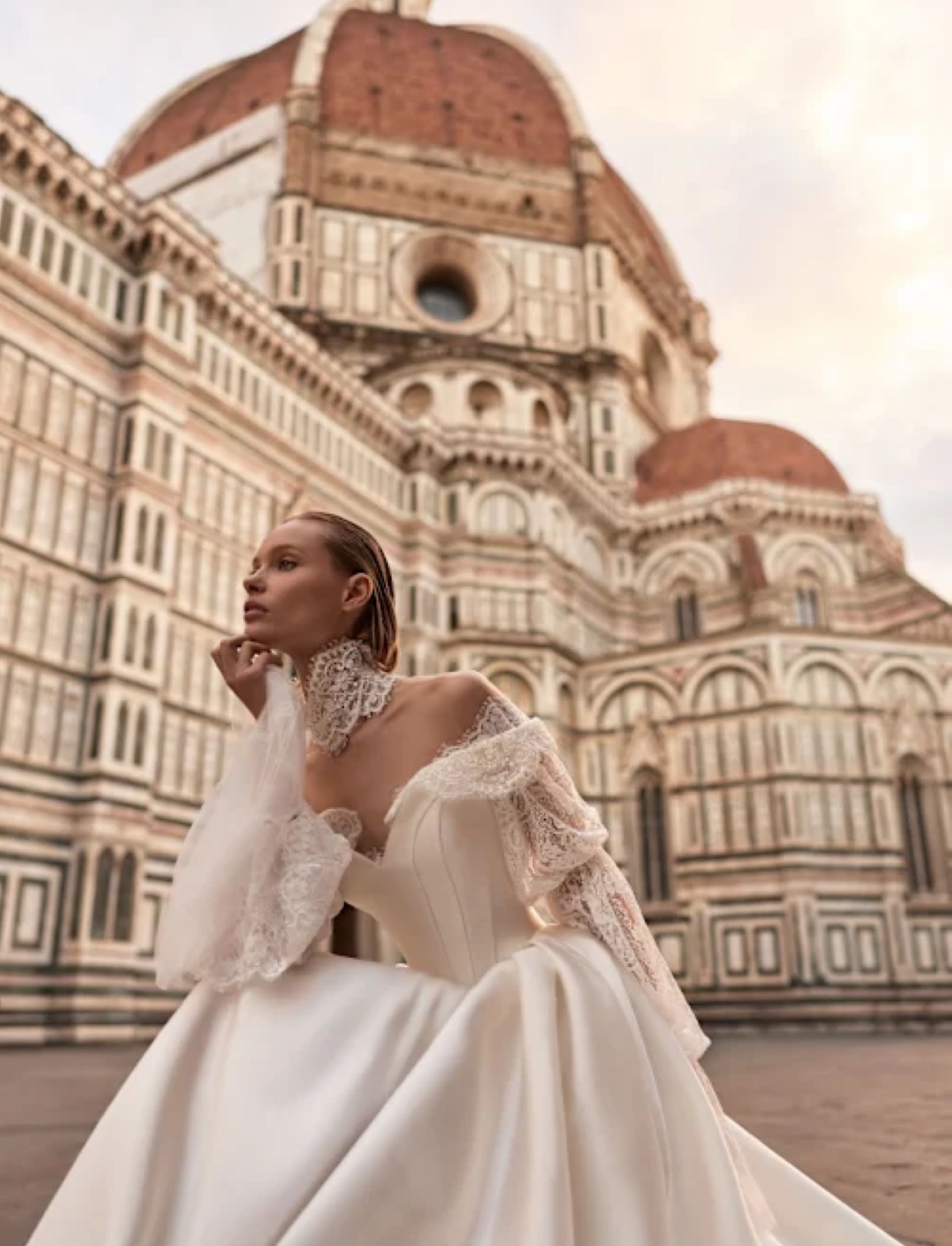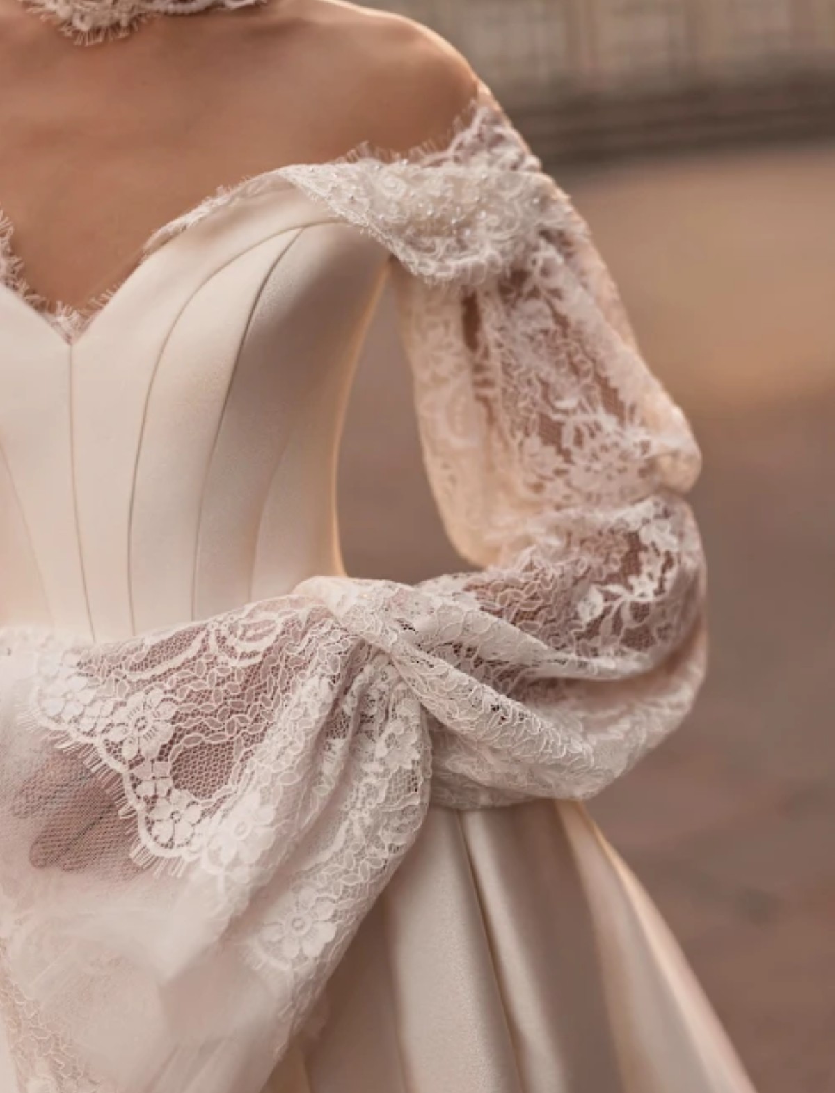 Abito da sposa SYLVIELLE di D’ART, disponibile presso l’Atelier Le Spose di Mori. Questo vestito da sposa romantico incarna un sogno regale e contemporaneo, perfetto per una sposa che desidera un look fiabesco e sofisticato. La maestosa silhouette a principessa si distingue per la sua ampia gonna in pregiato Mikado, tessuto strutturato che conferisce volume e un lucentezza satinata, culminando in un importante strascico. Il pulito corpetto off-the-shoulder a cuore è abbinato a un raffinato accessorio collo-maniche in pizzo Chantilly artigianale. Il collo alto e le lunghe maniche svasate sono decorati con elaborati ricami in pizzo e applicazioni floreali, creando un elegante contrasto materico e dettagli sartoriali di alta maestria. Un modello ideale per una sposa classica che cerca un volume imponente e un tocco di glamour intramontabile.