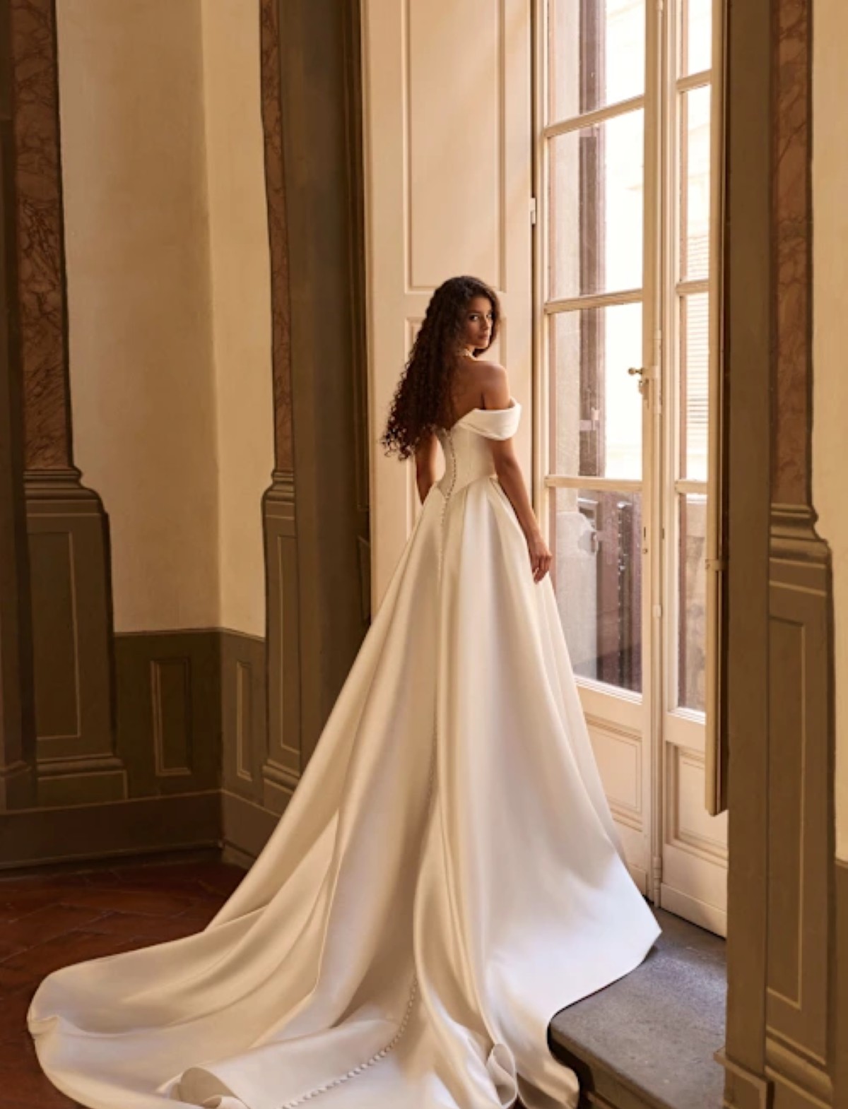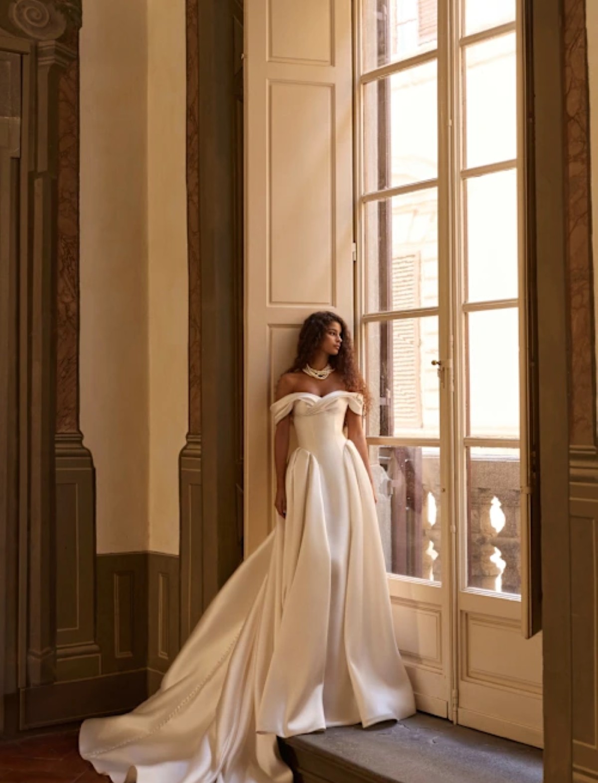 L’abito da sposa YANINA di D’ART è un’opera d’arte sartoriale che fonde grazia scultorea e fascino regale. Questo vestito da sposa moderno si distingue per un maestoso corpetto steccato a punta, capace di esaltare la silhouette con una precisione architettonica impeccabile. Lo scollo a cuore, impreziosito da un raffinato drappeggio off-the-shoulder, incornicia le spalle con estrema sofisticatezza. La gonna ampia, realizzata in pregiato mikado dalla lucentezza setosa, crea volumi scenografici che culminano in un sontuoso strascico. Per un tocco di versatilità glamour, il modello può essere arricchito da un coprispalle in pizzo con collo alto e maniche a campana, che aggiunge un’aura fiabesca e romantica all’intero ensemble. Ideale per la sposa che sogna un’eleganza classica reinterpretata in chiave contemporanea, YANINA comunica un’atmosfera di lusso senza tempo.