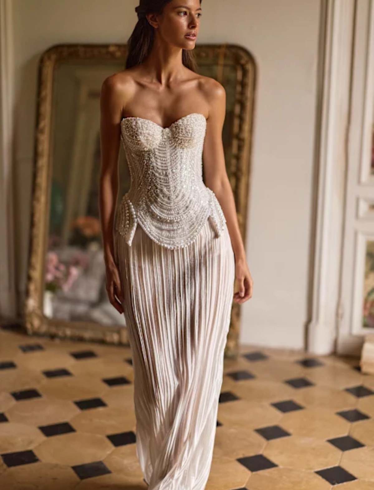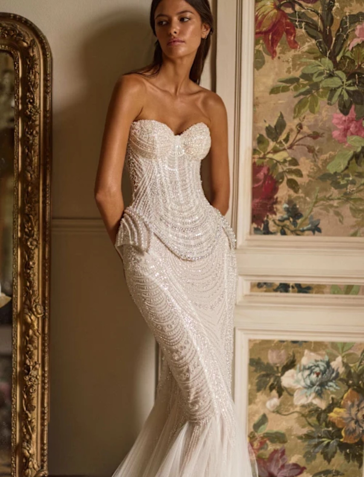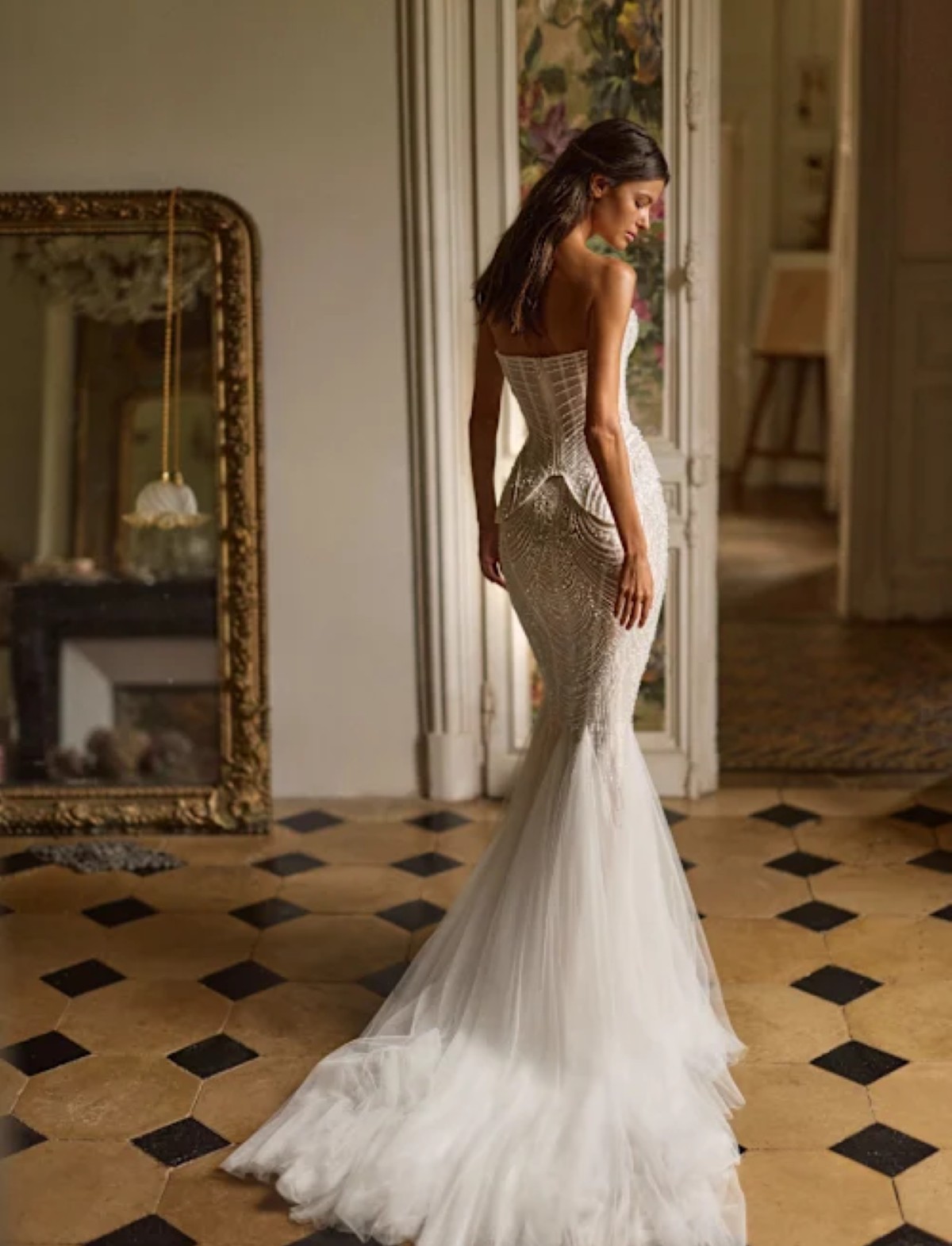 Scopri AETHER, l’abito da sposa MAISON ROSE che incarna un’eleganza moderna e sensuale. Questo modello a sirena cattura lo sguardo con una silhouette scultorea, esaltata da un corpetto steccato dal design architettonico che modella la figura con estrema raffinatezza. La lavorazione artigianale si rivela in ogni dettaglio: preziosi ricami che disegnano motivi geometrici luminosi, fondendosi con una gonna in tulle impalpabile. Una creazione sofisticata, ideale per la sposa che desidera un look iconico e di alta sartoria.