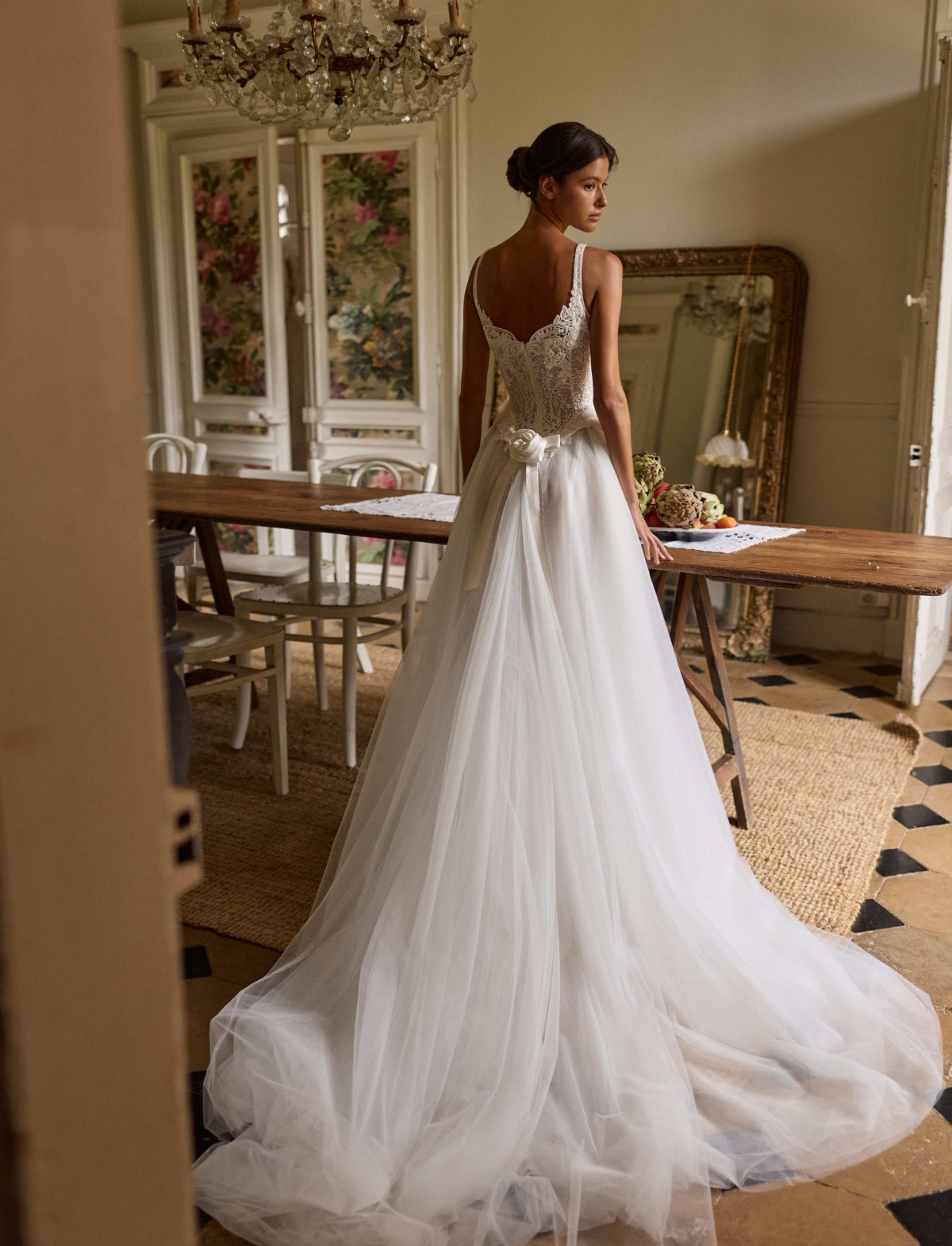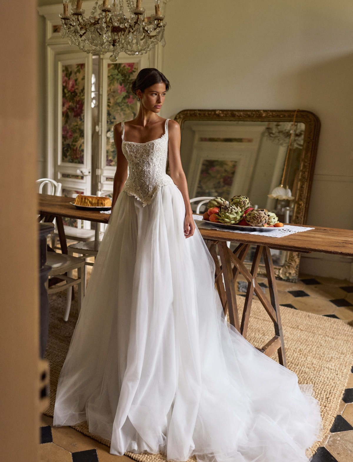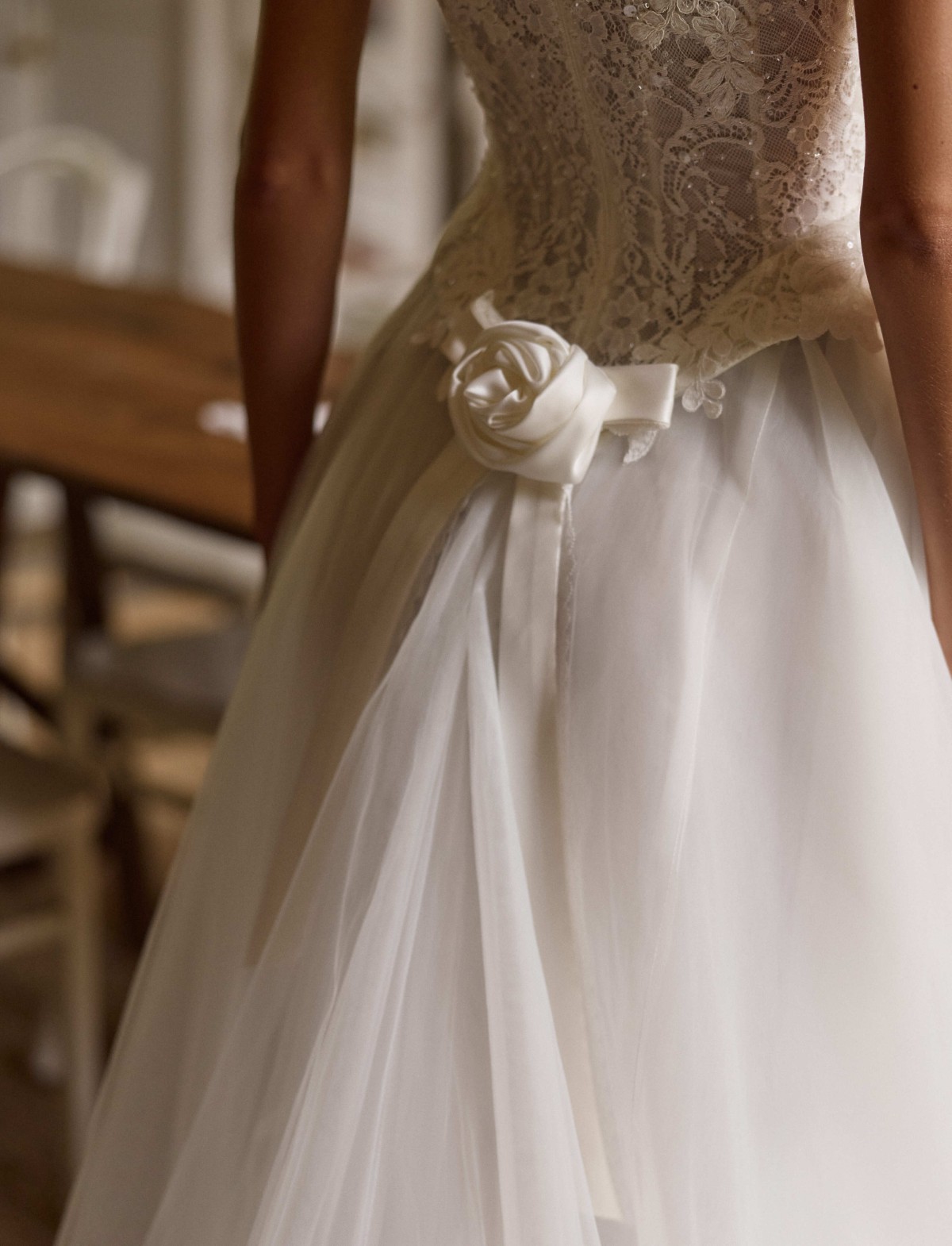 L’abito da sposa Dawnelle di Millanova Le Maison Rose è un capolavoro di equilibrio tra allure classica e design d’avanguardia. Questo vestito da sposa moderno incanta per il suo corpetto steccato a punta, finemente lavorato con ricami in pizzo e delicate trasparenze che esaltano la silhouette. La gonna ampia in soffice tulle crea un volume etereo, mentre il dettaglio sartoriale del fiore in tessuto sul retro aggiunge un tocco romantico e ricercato. Ideale per la sposa glamour che desidera un look sofisticato e senza tempo, Dawnelle trasforma ogni passo in pura poesia.