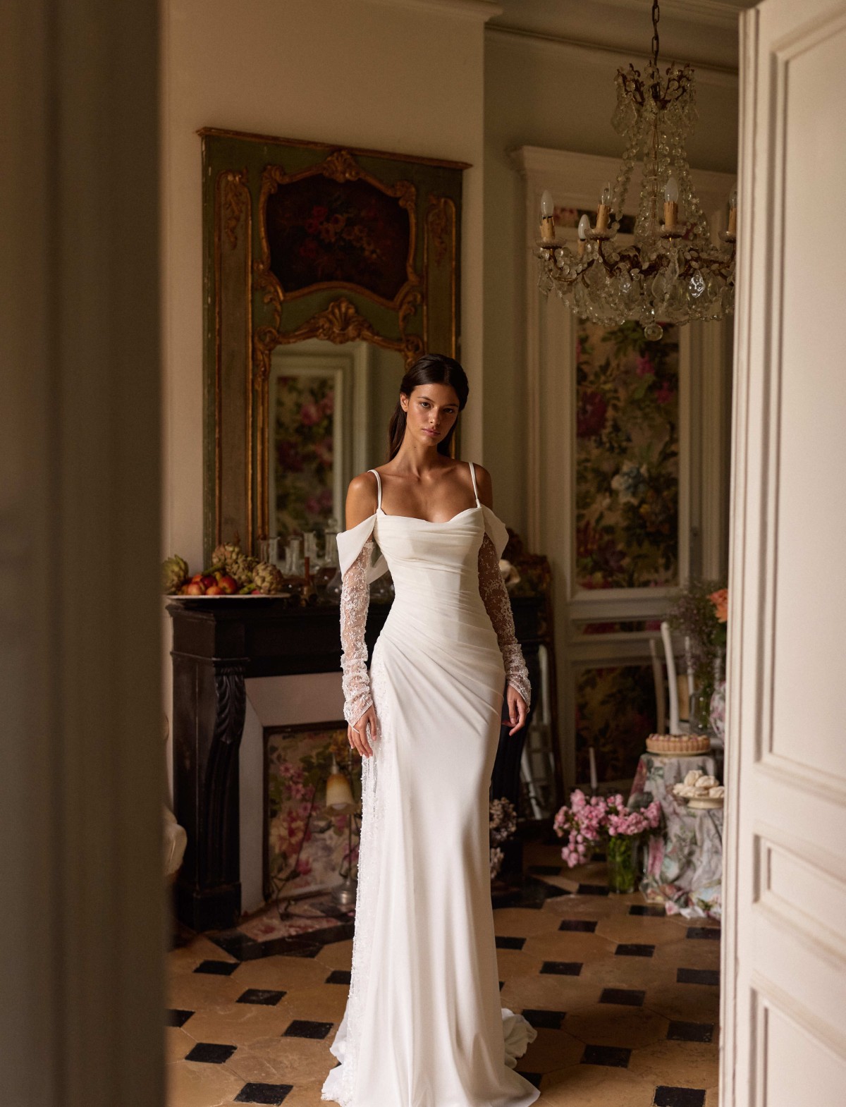 Il corpetto steccato presenta un sofisticato gioco di drappeggi artigianali che valorizzano il décolleté, arricchito da sottili spalline e romantiche maniche a sbalzo. Il dettaglio distintivo risiede nelle preziose applicazioni floreali e nei ricami in pizzo scintillante che decorano le maniche in tulle rimovibili e il fianco, creando un contrasto luminoso e glamour. Perfetto per la sposa che desidera un’atmosfera sofisticata e indimenticabile, Glimmara fonde maestria sartoriale e design d’avanguardia.