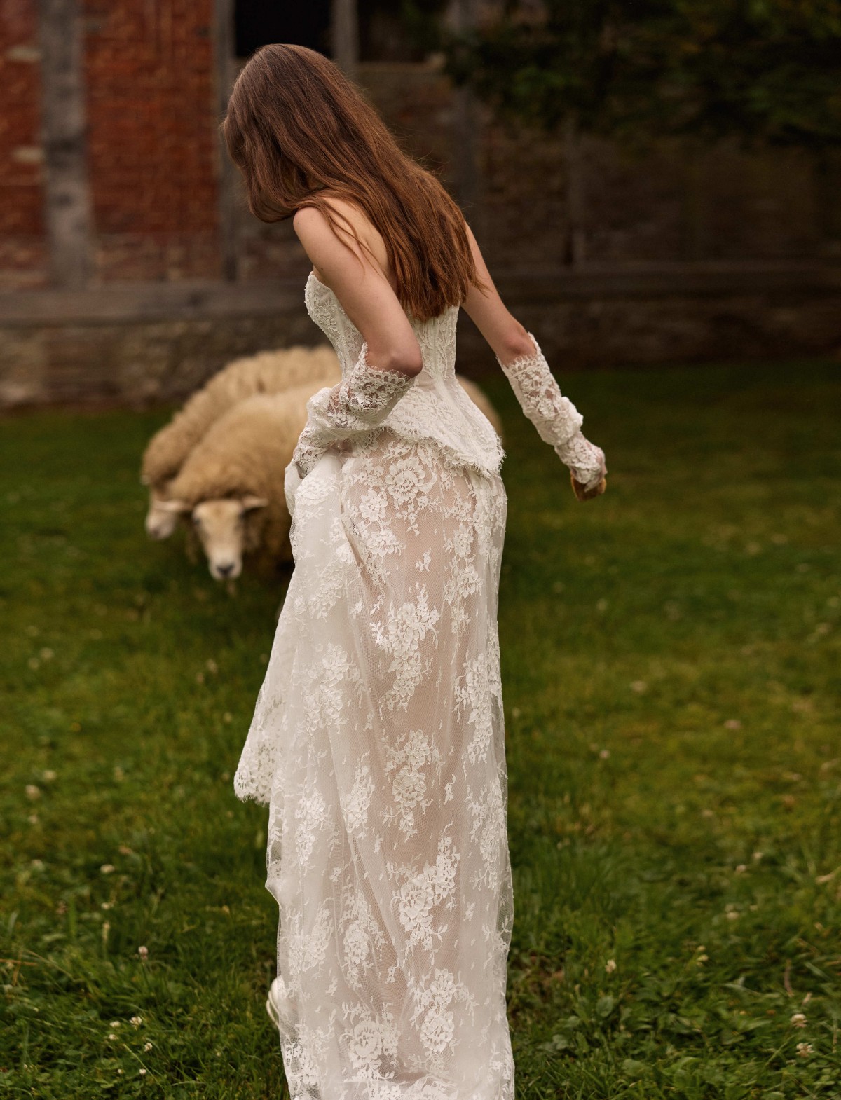 Dettagli glamour come lo scollo omerale velato, i guanti coordinati in pizzo e il raffinato collarino gioiello rendono il look sofisticato e unico. Perfetto per la sposa moderna che sogna un’atmosfera fiabesca ma ricercata, Virelle trasforma il desiderio di bellezza in pura realtà artigianale.