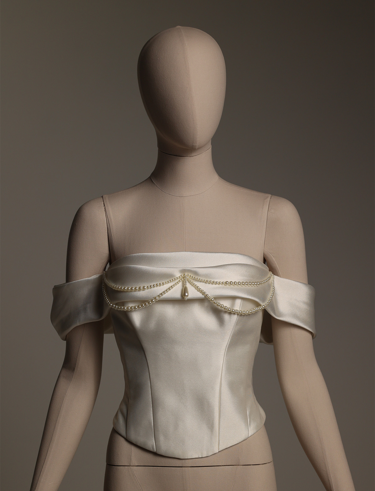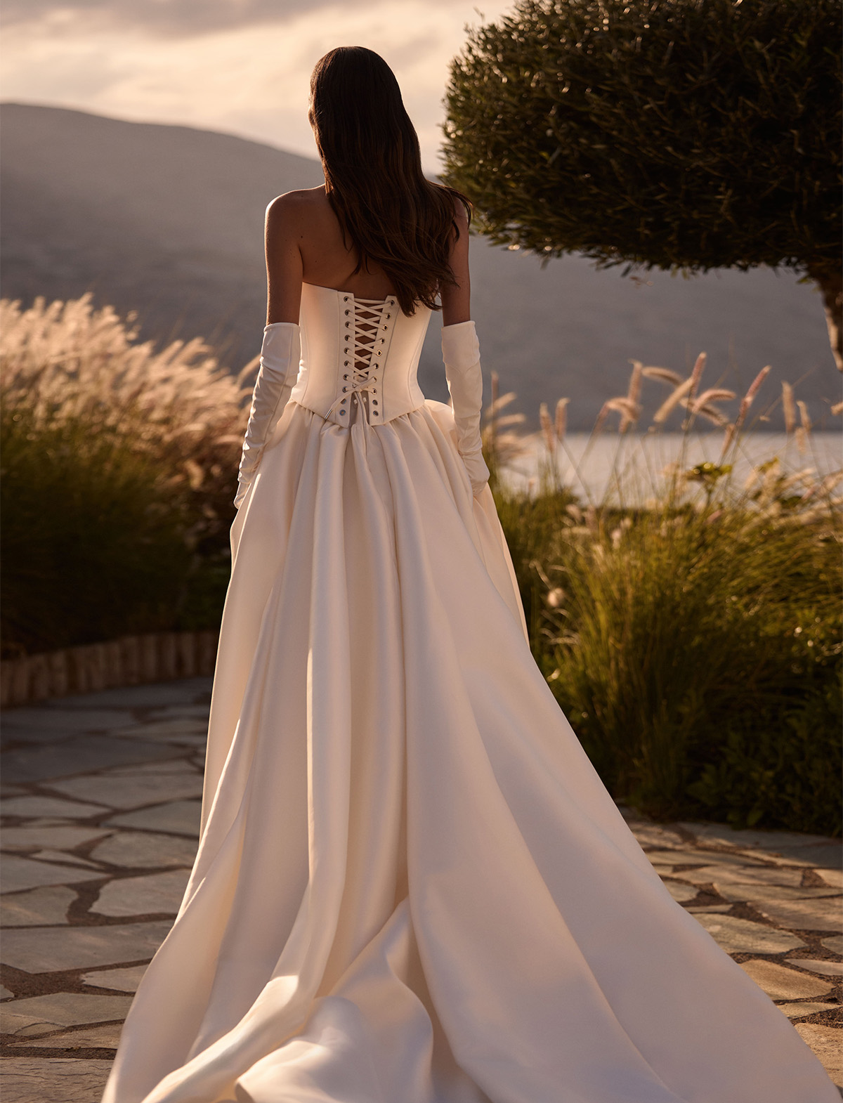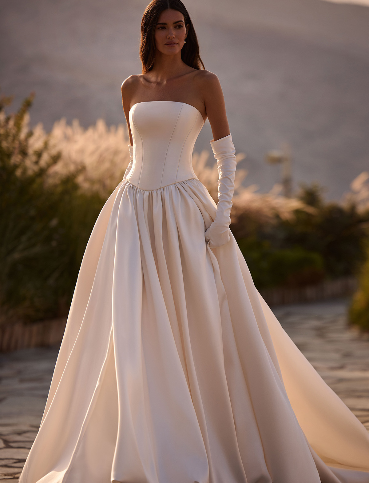 L’abito Aveline di Milla Nova Pearl of the Season è un’abito modellante realizzato in lussuoso tessuto mikado. Caratterizzato da un design sagomato e senza spalline, con disossamento che definisce magnificamente il punto vita, una delicata chiusura con lacci per una vestibilità regolabile e personalizzata e un’aggiunta staccabile off-the-shoulder ornata da dettagli in carcanet di perle. Gonna in mikado a vita alta, sorprendente e lucente, con un’elegante silhouette ad A che sfocia in un drammatico strascico. Si abbina perfettamente ai guanti Aveline, creando un insieme moderno e sofisticato.