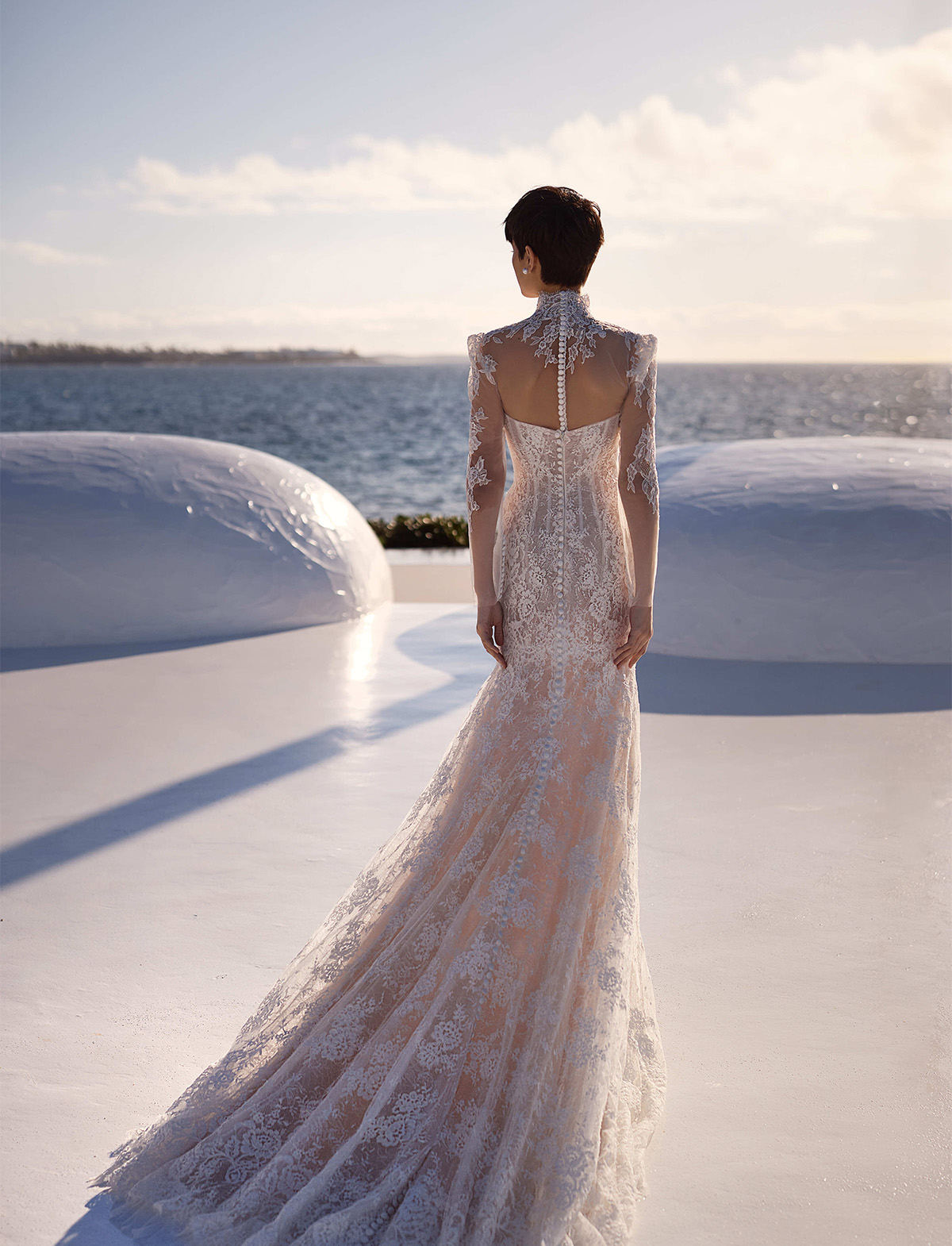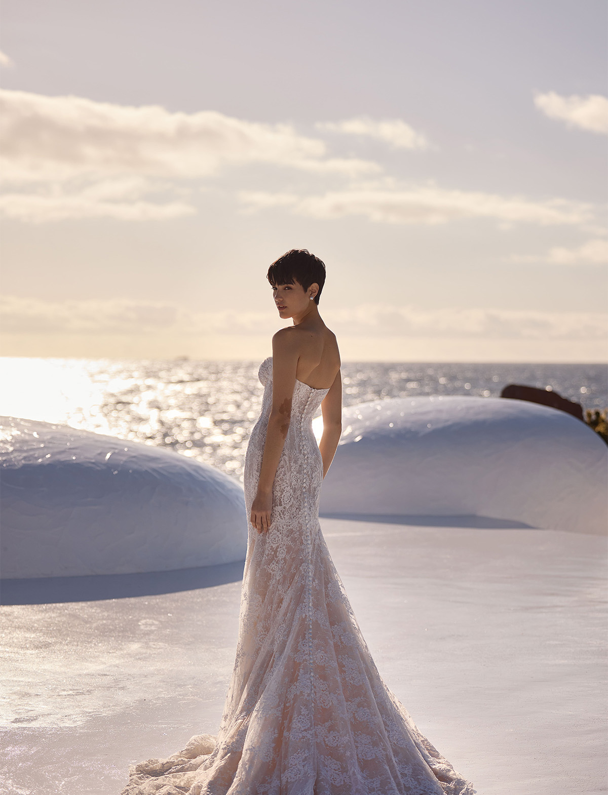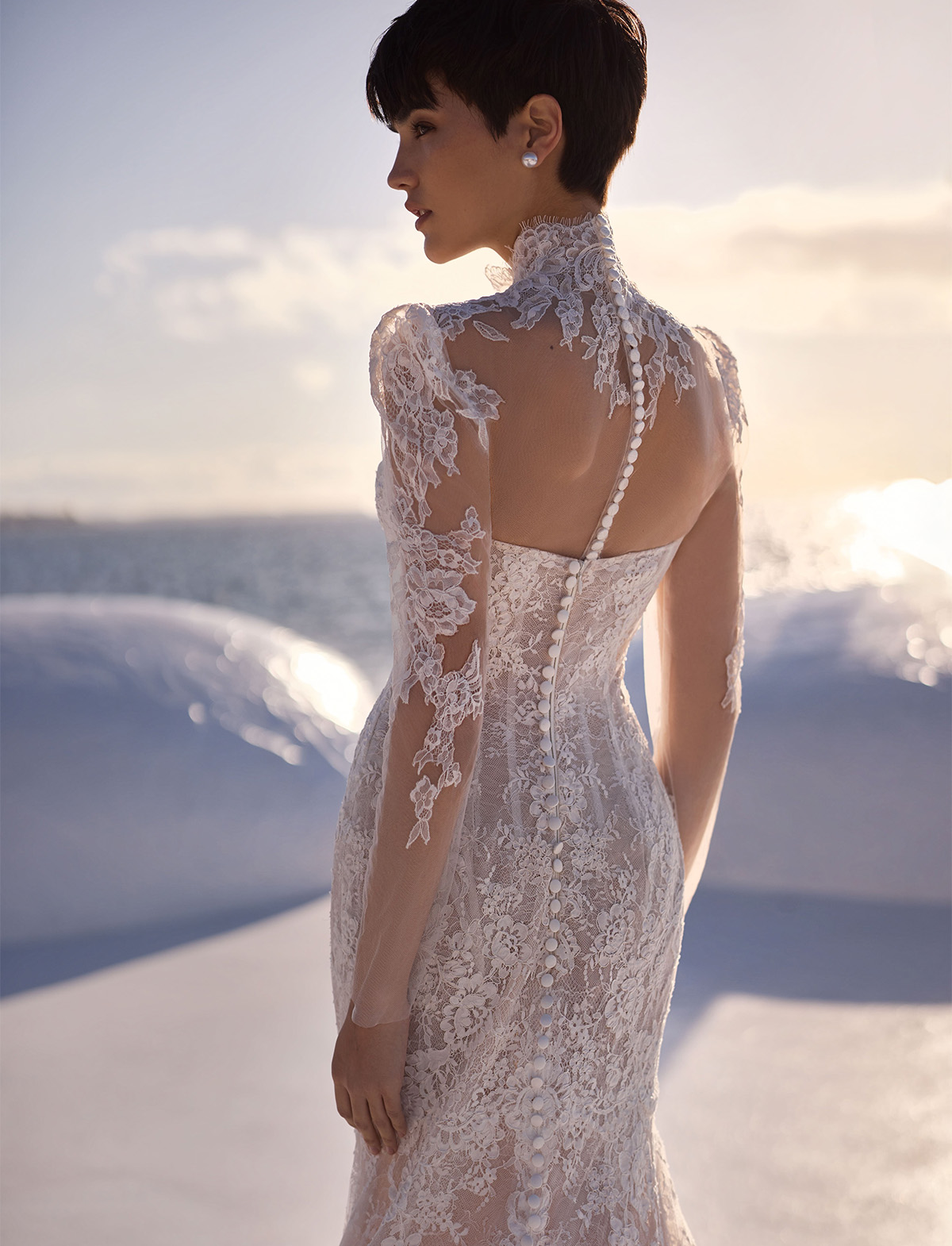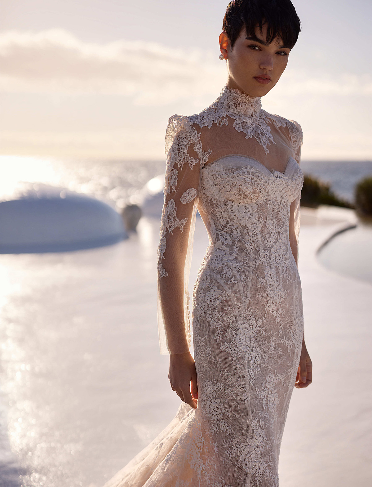 L’abito Bellamy di Milla Nova Pearl of the Season è un delicato abito da sposa a sirena realizzato in pizzo chantilly con squisiti ornamenti floreali. Caratterizzato da una scollatura a cuore che incornicia splendidamente il decolleté, da una cerniera nascosta ornata da bottoni e da una splendida gonna aderente semitrasparente con fodera nuda che sfocia in un grazioso strascico. Può essere completato con un elegante bolero Selvianne in pizzo.