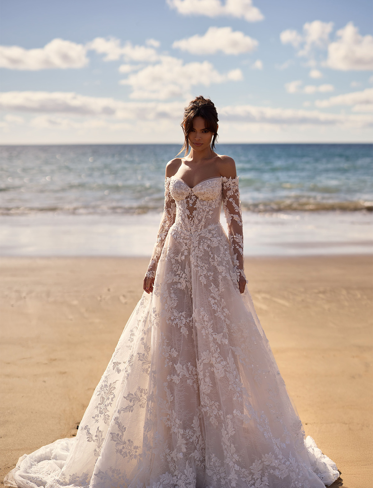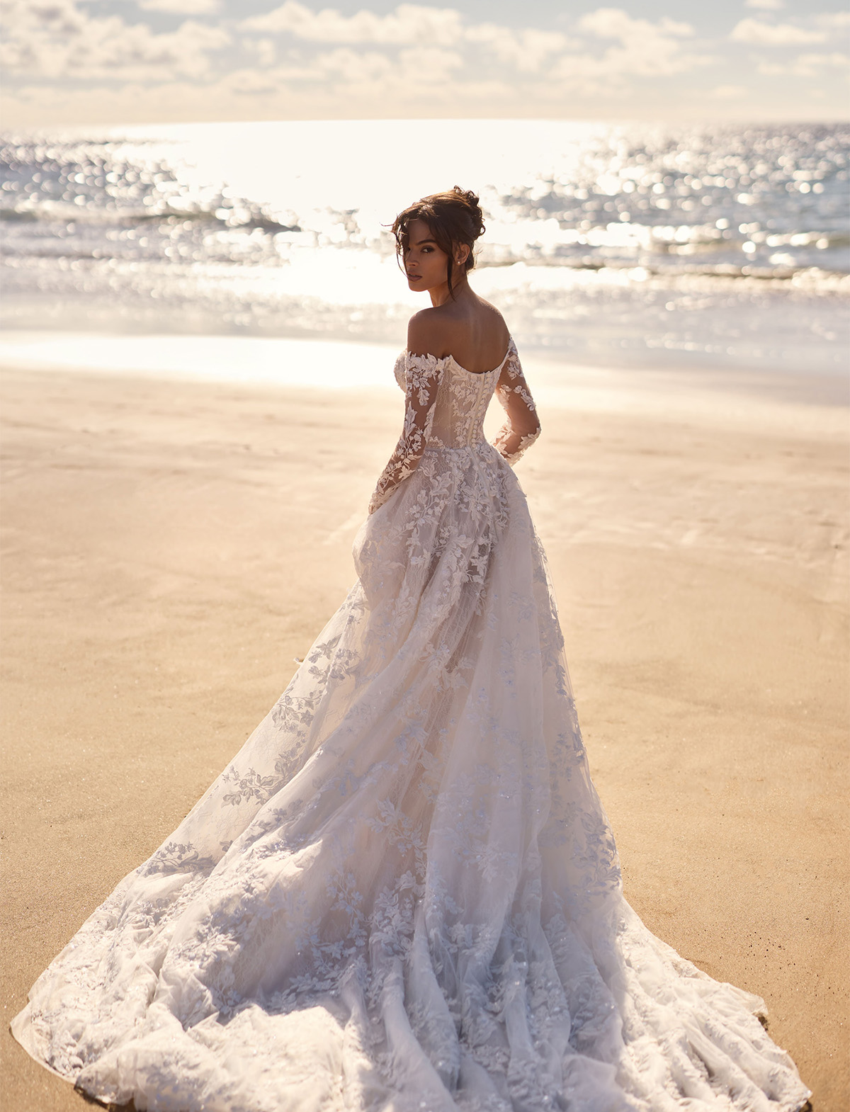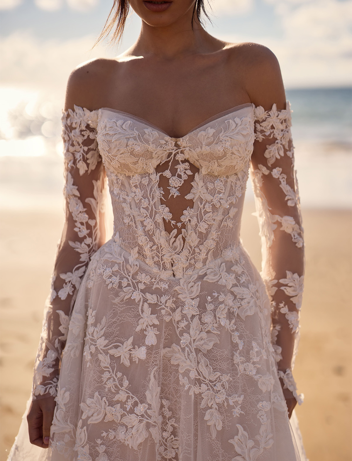 L’abito Charm di Milla Nova Pearl of the Season è un incantevole abito da sposa off-the-shoulder a maniche lunghe in linea A, realizzato in pizzo con motivi floreali. Caratterizzato da una scollatura a cuore, un corsetto disossato con un inserto trasparente a forma di V al centro, maniche lunghe trasparenti off-the-shoulder ornate di fiori, chiusura con cerniera posteriore e una voluminosa maxi gonna in stile principesco con uno strascico scenografico.
