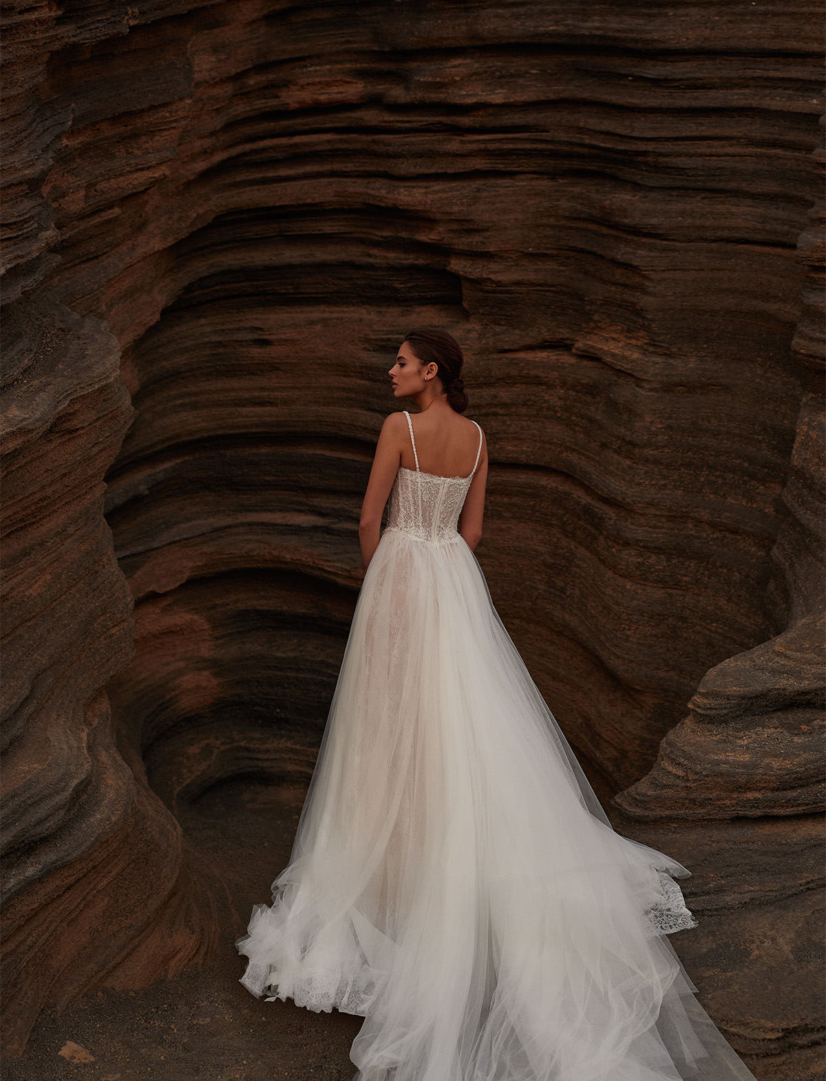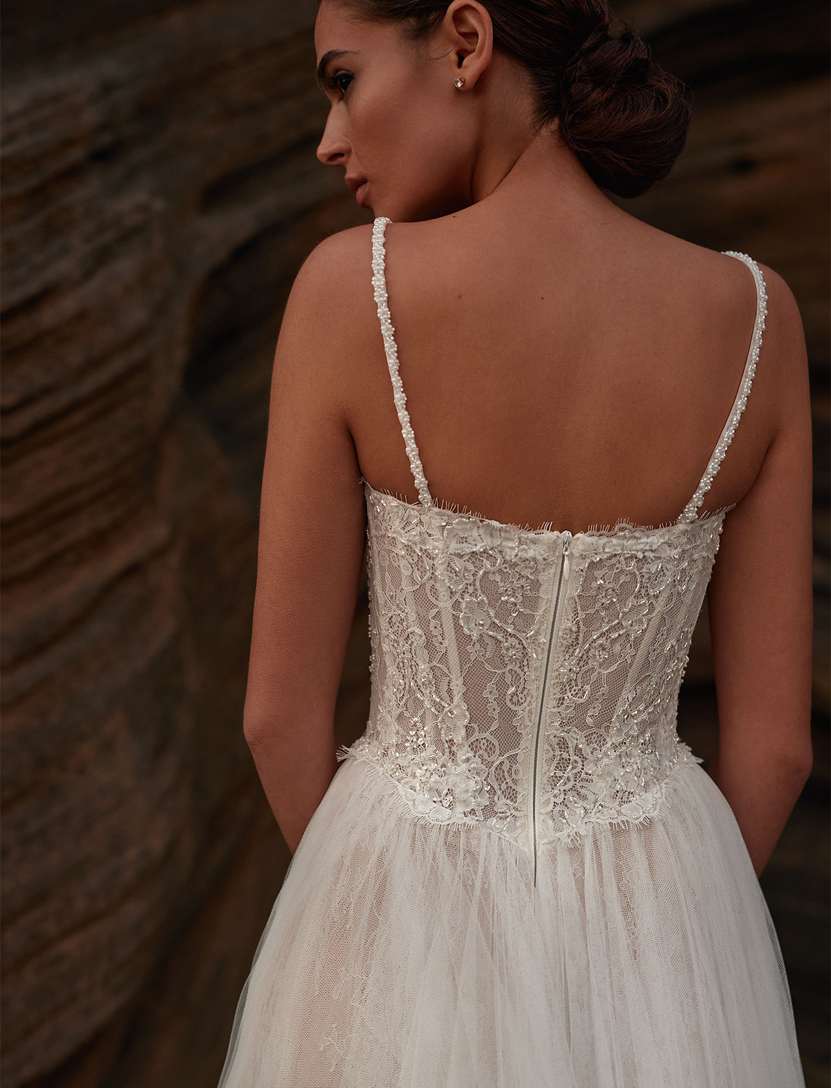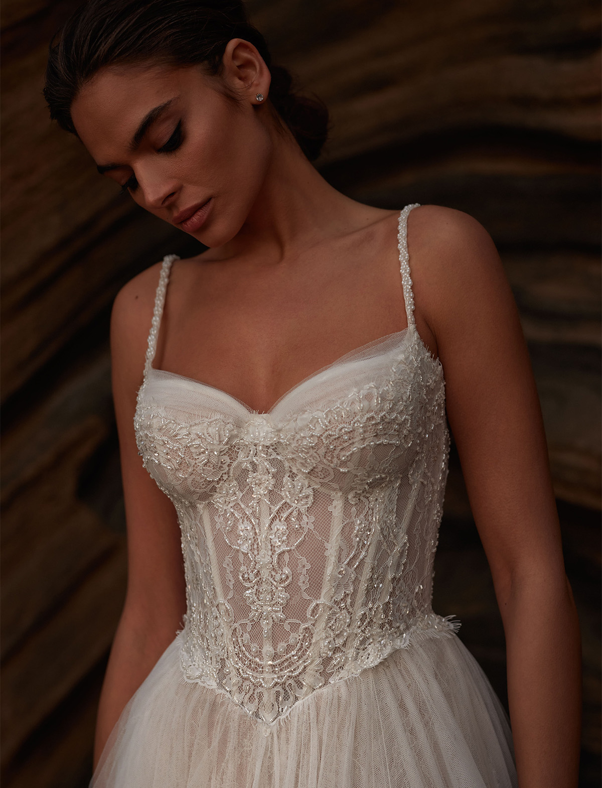 L’abito Eloria di Milla Nova Pearl of the Season è un abito da sposa ad A di ispirazione vintage con corsetto in pizzo ornato semitrasparente con spalline sottili e scollatura a cuore. Il corsetto include coppe incorporate staccabili per un maggiore sostegno, ha una chiusura a zip per una vestibilità senza cuciture e maniche off-the-shoulder staccabili. L’abito sfocia in una morbida gonna dritta in tulle con un breve strascico.