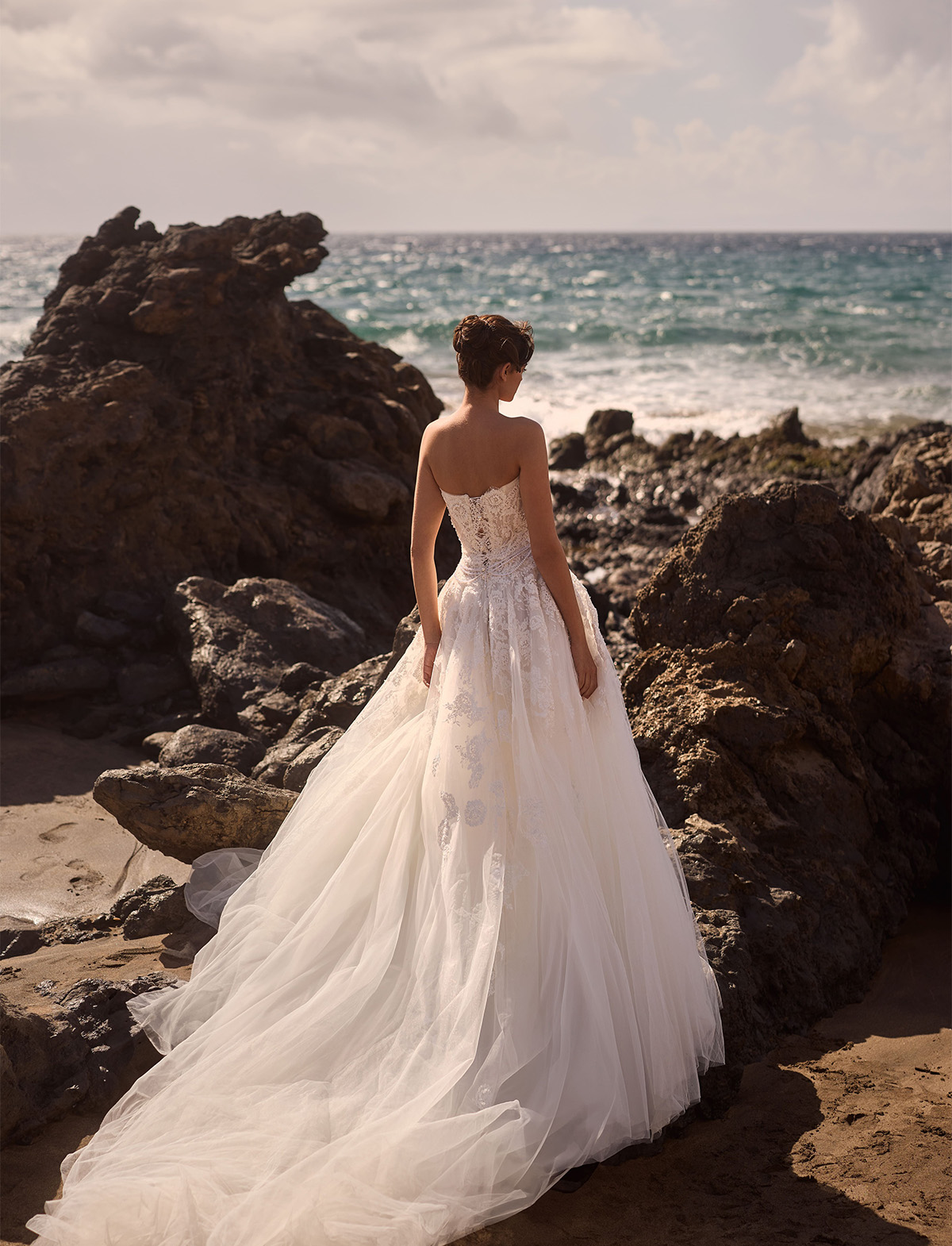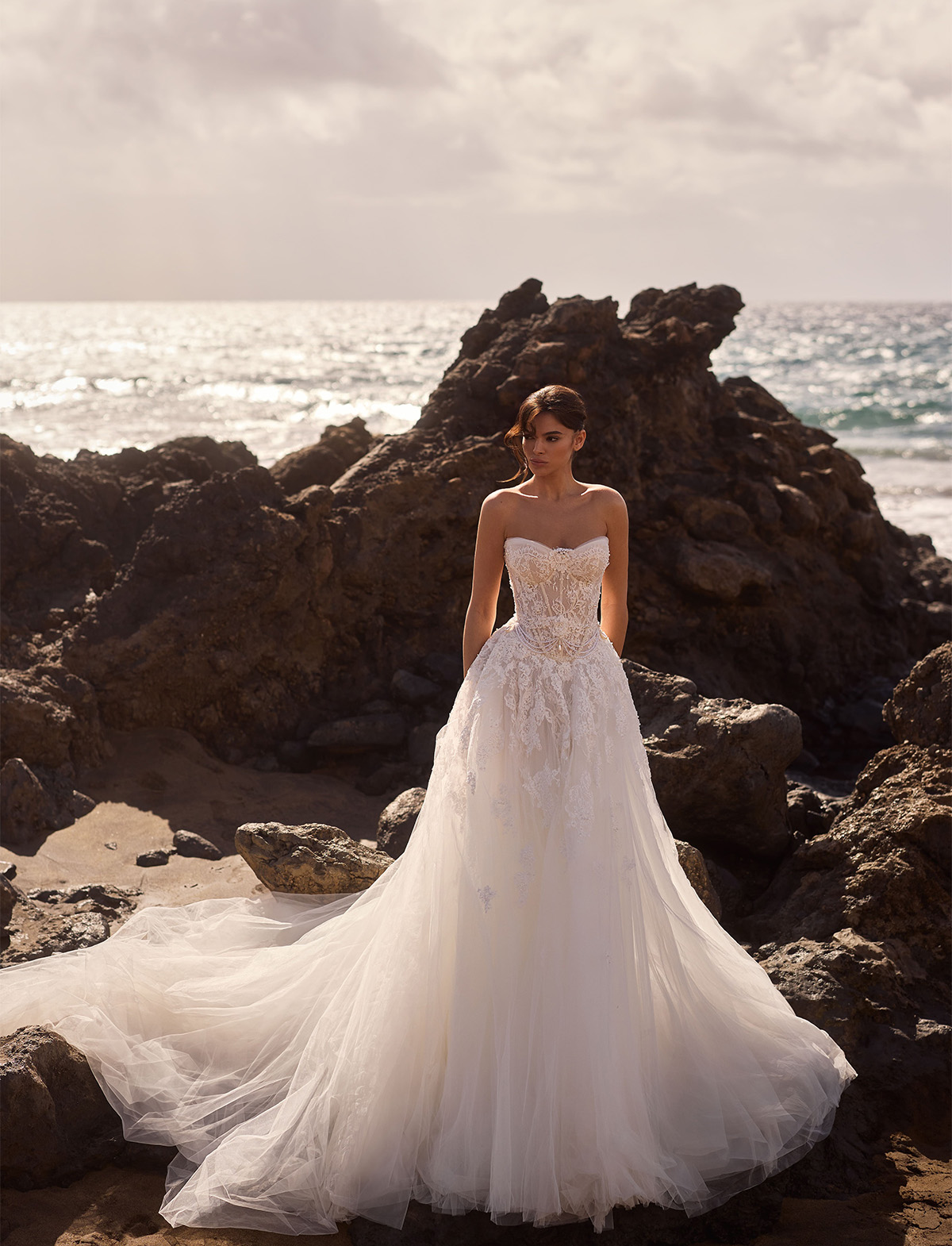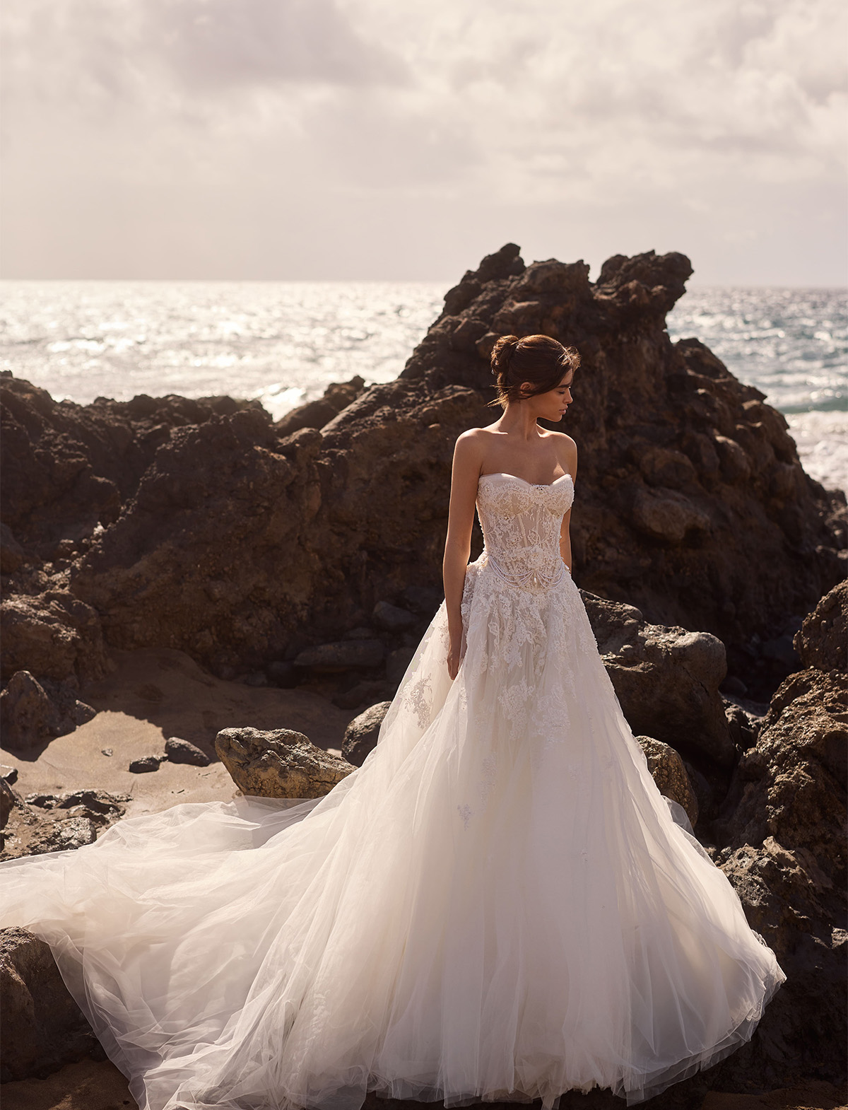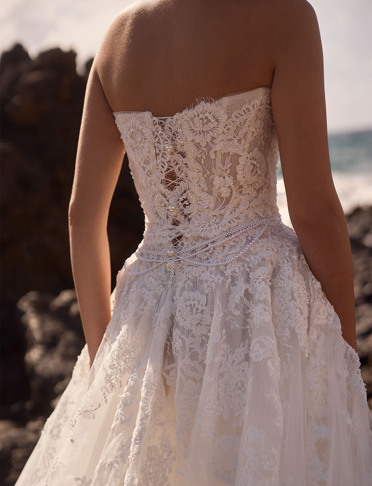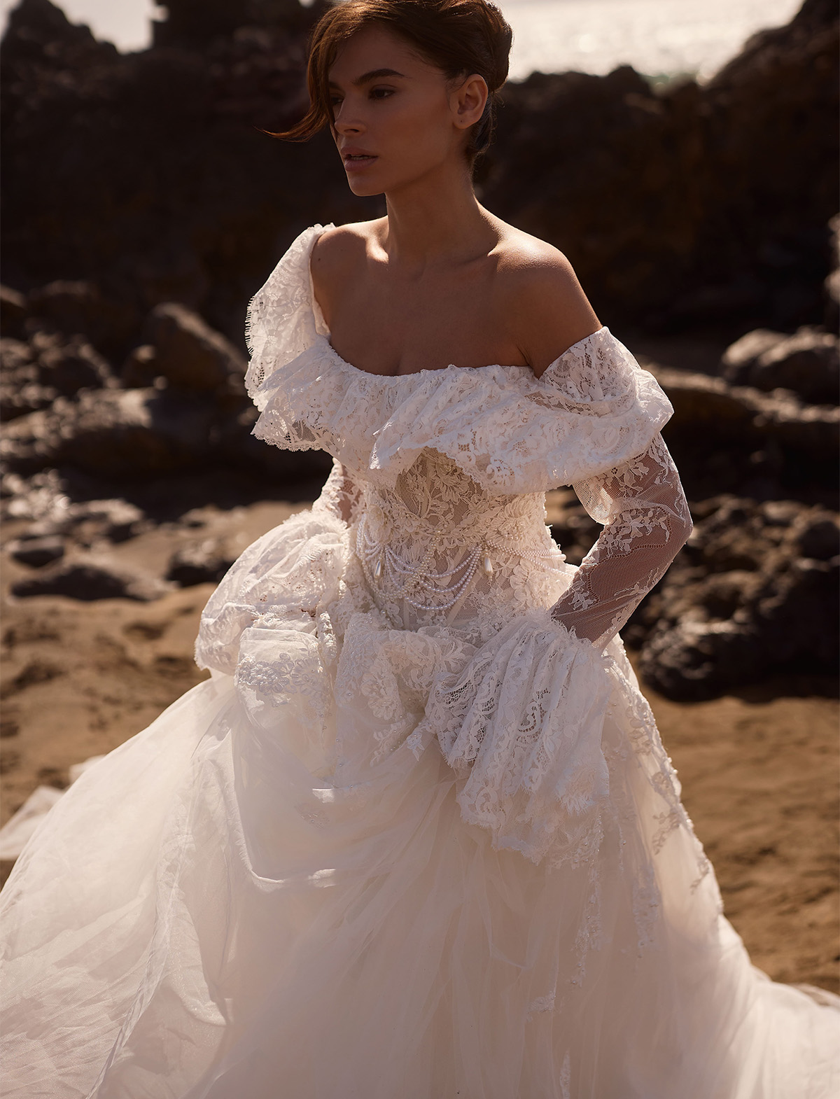 L’abito Evalisse di Milla Nova Pearl of the Season è un incantevole abito da sposa A-line realizzato in delicato pizzo floreale. Caratterizzato da una scollatura a forma di cuore, un corsetto disossato velato a vita bassa con coppe push-up incorporate, una delicata chiusura con lacci sulla schiena e una maxi gonna da principessa disseminata di applicazioni floreali dalla vita e un maxi strascico. Viene fornito con una squisita cintura in pizzo ornata da applicazioni floreali 3D e catene di perle, spalline staccabili e maniche off-the-shoulder staccabili. Il look può essere arricchito dal bolero di ispirazione vintage Zephyra, con scollo quadrato increspato e maniche lunghe trasparenti con polsini svasati increspati. Il suo design drammatico aggiunge un tocco di estetica vintage al look da sposa.