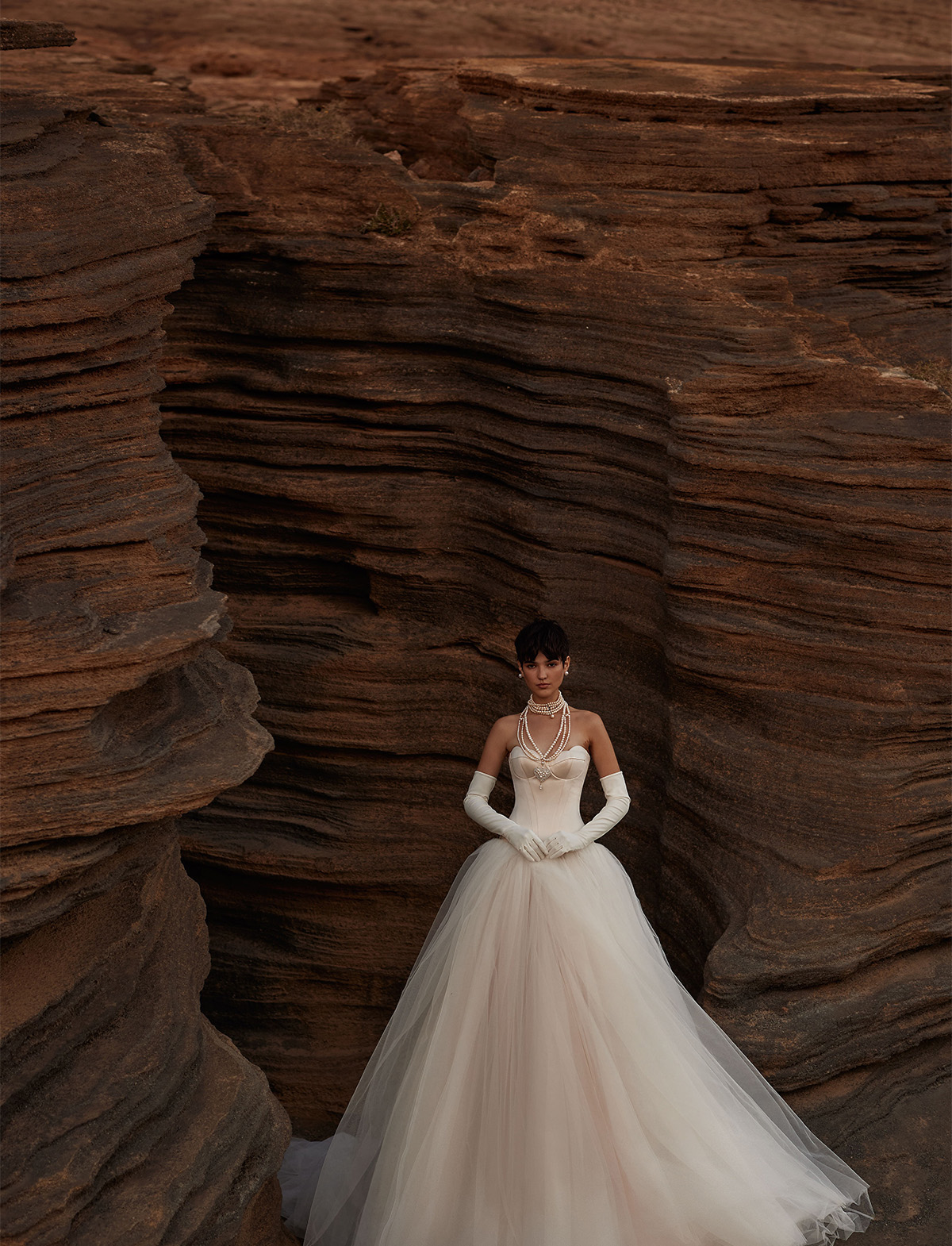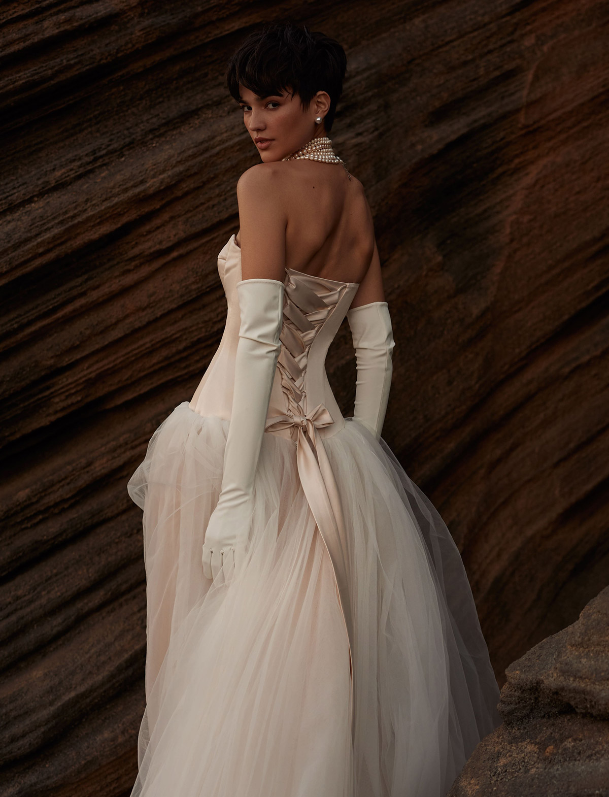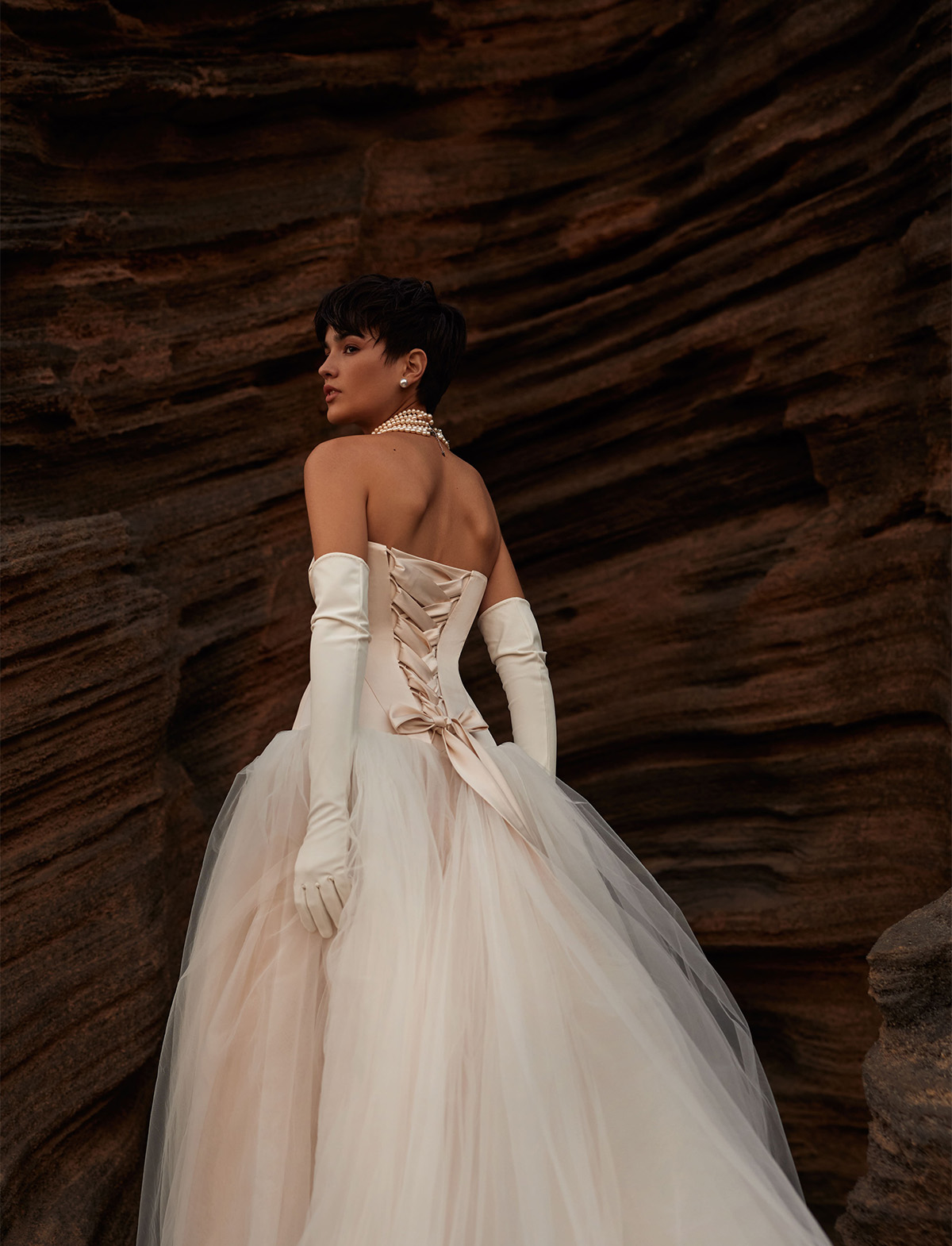 L’abito Lumiere di Milla Nova Pearl of the Season è un incantevole abito da sposa da principessa caratterizzato da un corsetto strutturato in raso a vita bassa con scollatura a conchiglia a forma di cuore, che accentua splendidamente il decolleté. Il corpetto è sapientemente scolpito con disossamento e rifinito con un’ampia allacciatura sulla schiena per una vestibilità perfetta e regolabile, mentre la gonna voluminosa realizzata con strati di morbido tulle aggiunge un fascino fiabesco. Può essere completato dai guanti lunghi Aveline.