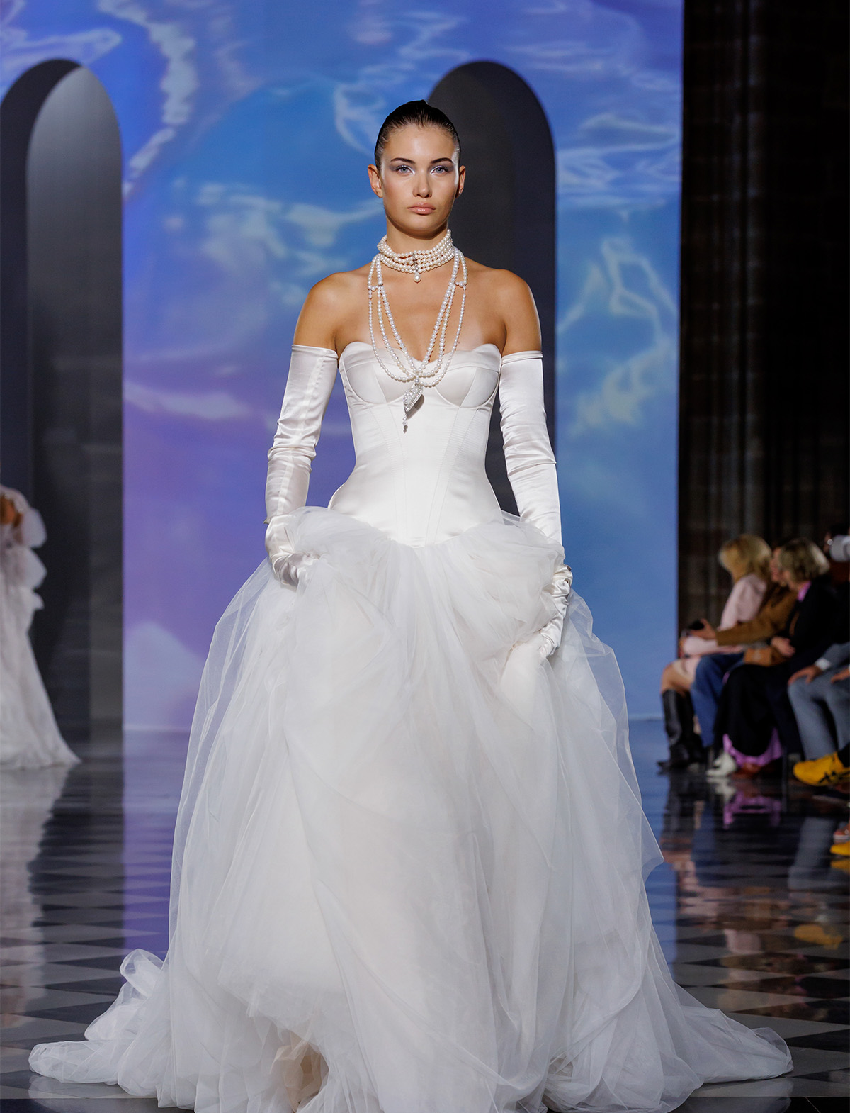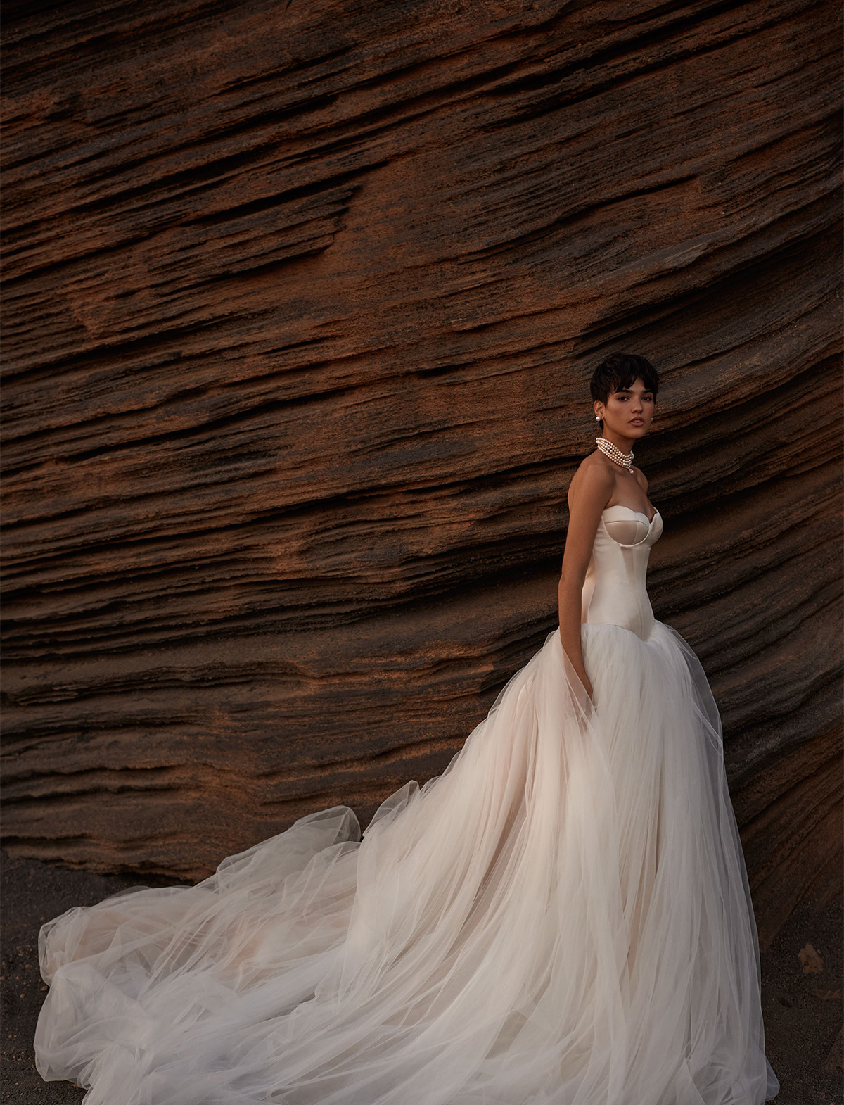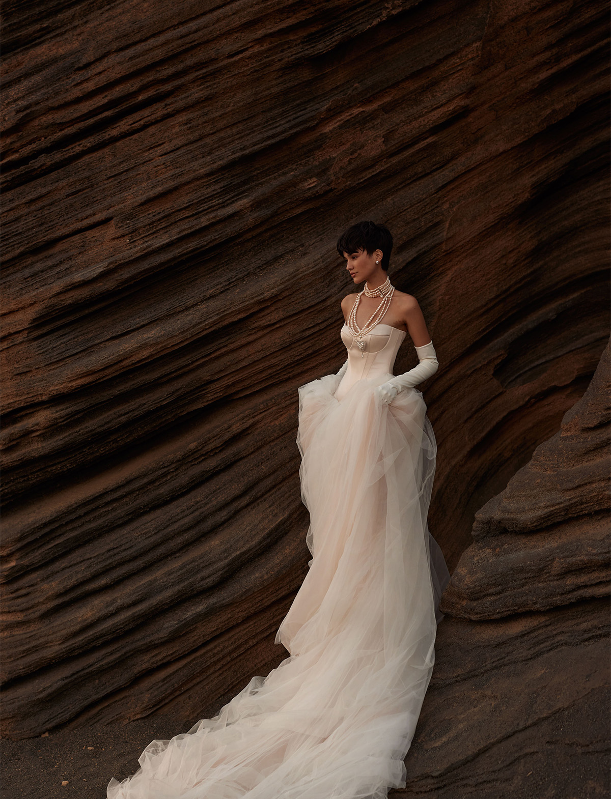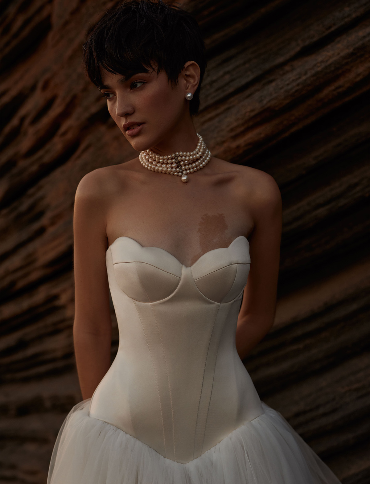 L’abito Lumiere di Milla Nova Pearl of the Season è un incantevole abito da sposa da principessa caratterizzato da un corsetto strutturato in raso a vita bassa con scollatura a conchiglia a forma di cuore, che accentua splendidamente il decolleté. Il corpetto è sapientemente scolpito con disossamento e rifinito con un’ampia allacciatura sulla schiena per una vestibilità perfetta e regolabile, mentre la gonna voluminosa realizzata con strati di morbido tulle aggiunge un fascino fiabesco. Può essere completato dai guanti lunghi Aveline.