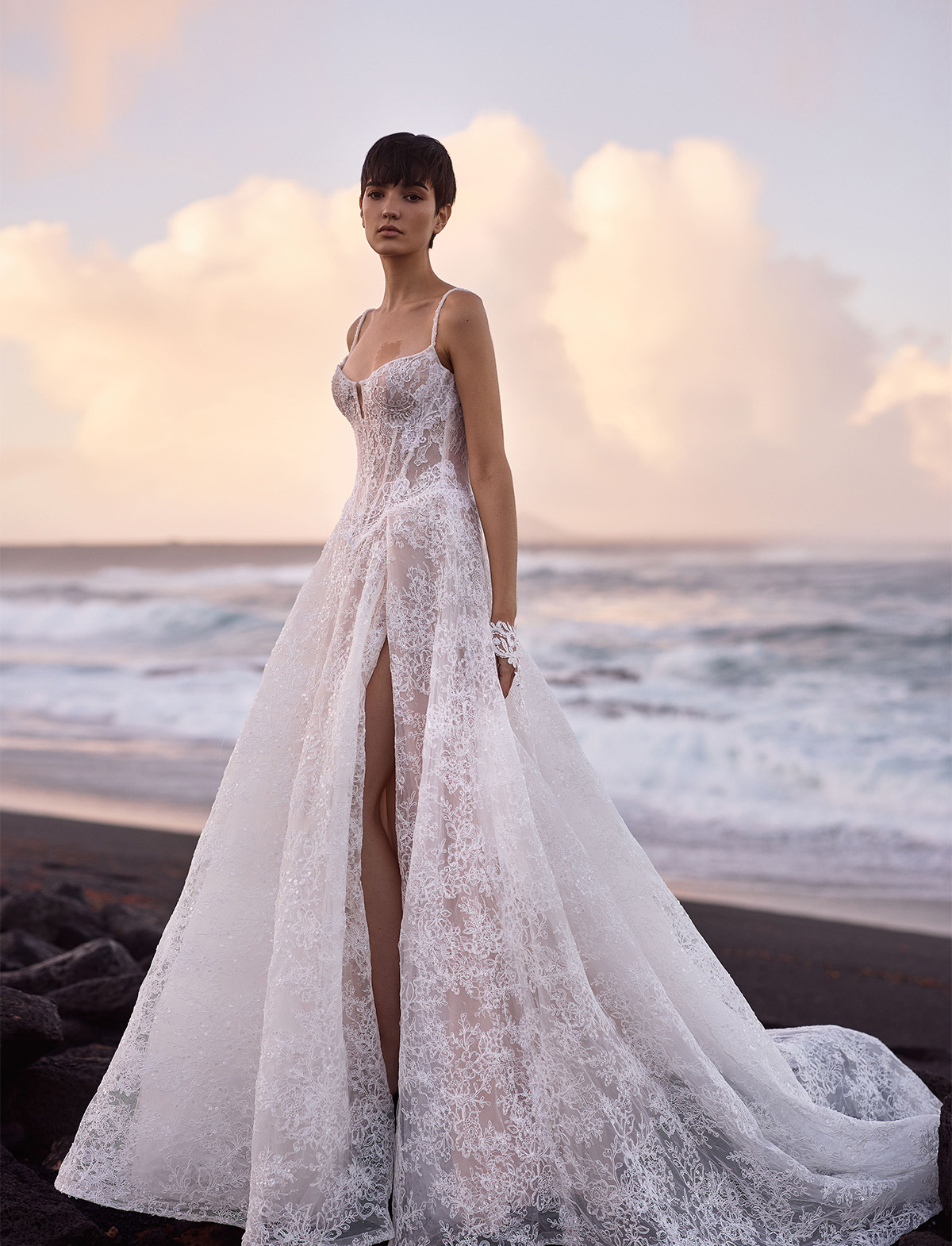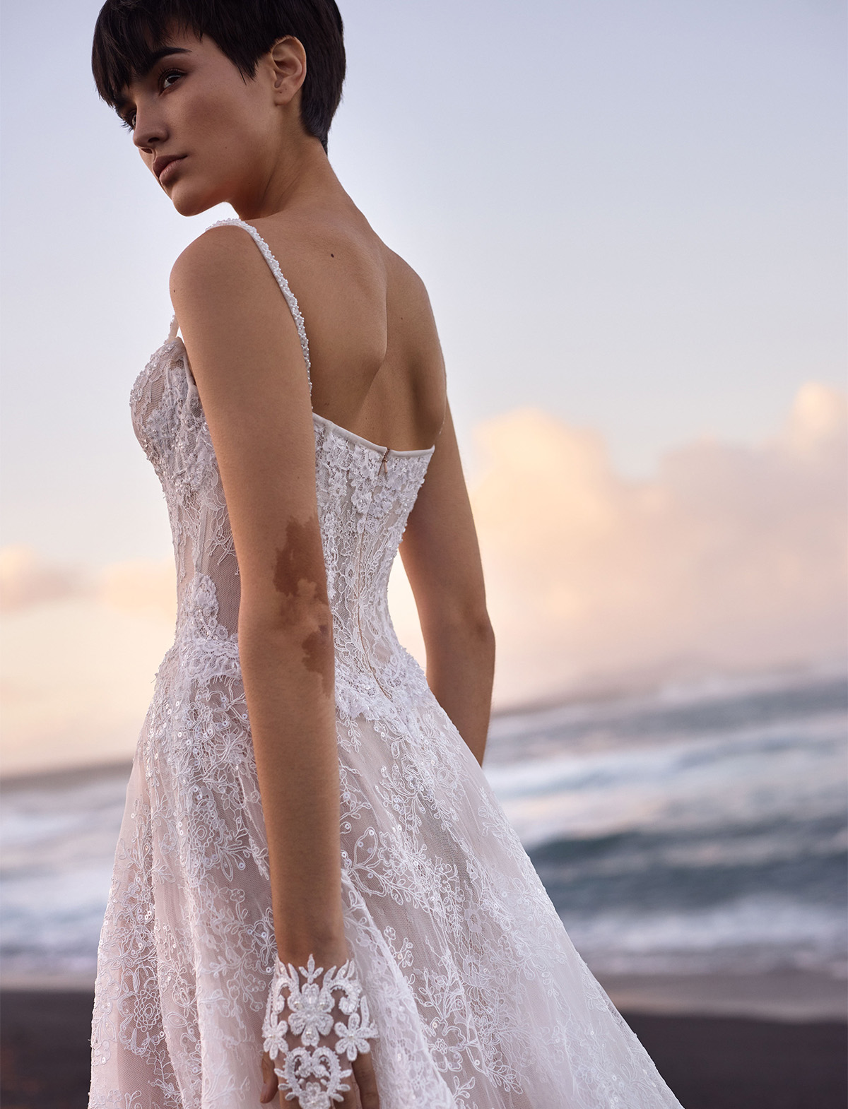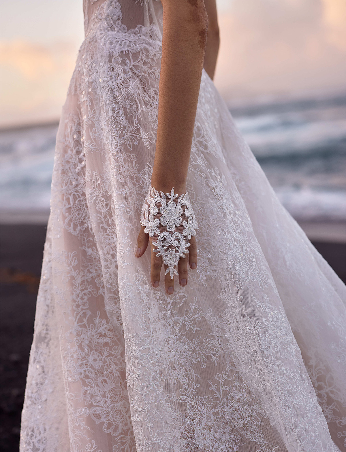 L’abito Opal di Milla Nova Pearl of the Season è un romantico abito da sposa A-line realizzato in delicato pizzo con intricati dettagli floreali e scintillanti paillettes all-over. Caratterizzato da un corsetto disossato a vita bassa in pizzo semitrasparente che slancia la figura, una scollatura a forma di cuore con sottile taglio a V e coppe staccabili, spalline impreziosite e schiena chiusa da una zip. La maxi gonna, realizzata con strati di pizzo e sottogonna nuda, si trasforma in uno strascico, aggiungendo una finitura eterea. L’abito può essere impreziosito da guanti senza dita Opal.