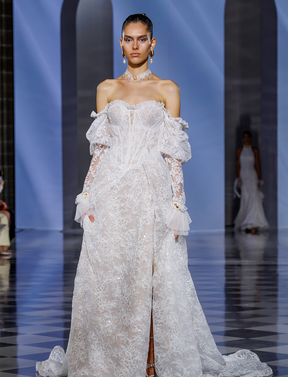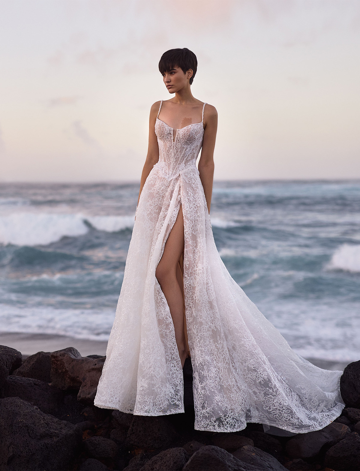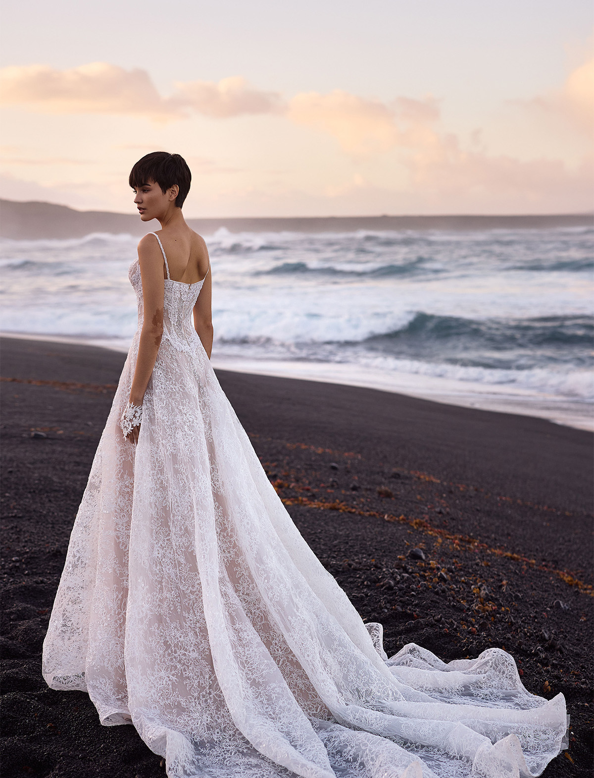 L’abito Opal di Milla Nova Pearl of the Season è un romantico abito da sposa A-line realizzato in delicato pizzo con intricati dettagli floreali e scintillanti paillettes all-over. Caratterizzato da un corsetto disossato a vita bassa in pizzo semitrasparente che slancia la figura, una scollatura a forma di cuore con sottile taglio a V e coppe staccabili, spalline impreziosite e schiena chiusa da una zip. La maxi gonna, realizzata con strati di pizzo e sottogonna nuda, si trasforma in uno strascico, aggiungendo una finitura eterea. L’abito può essere impreziosito da guanti senza dita Opal.
