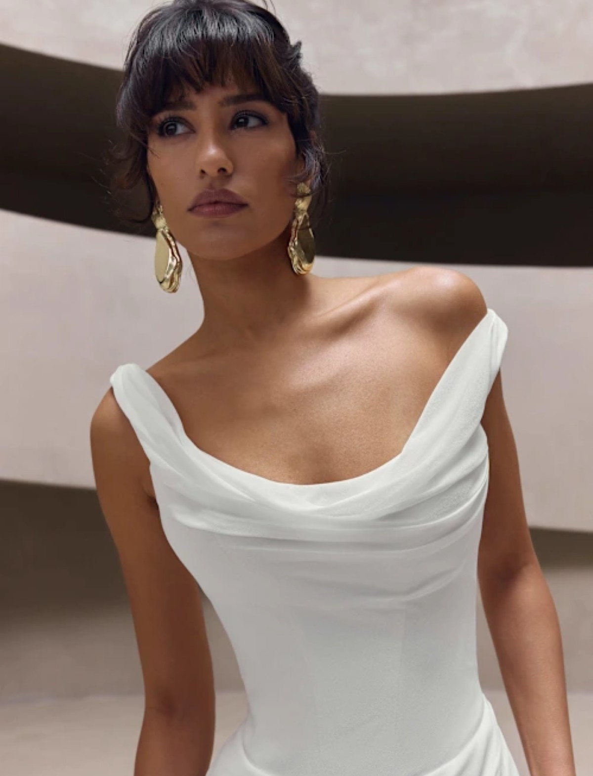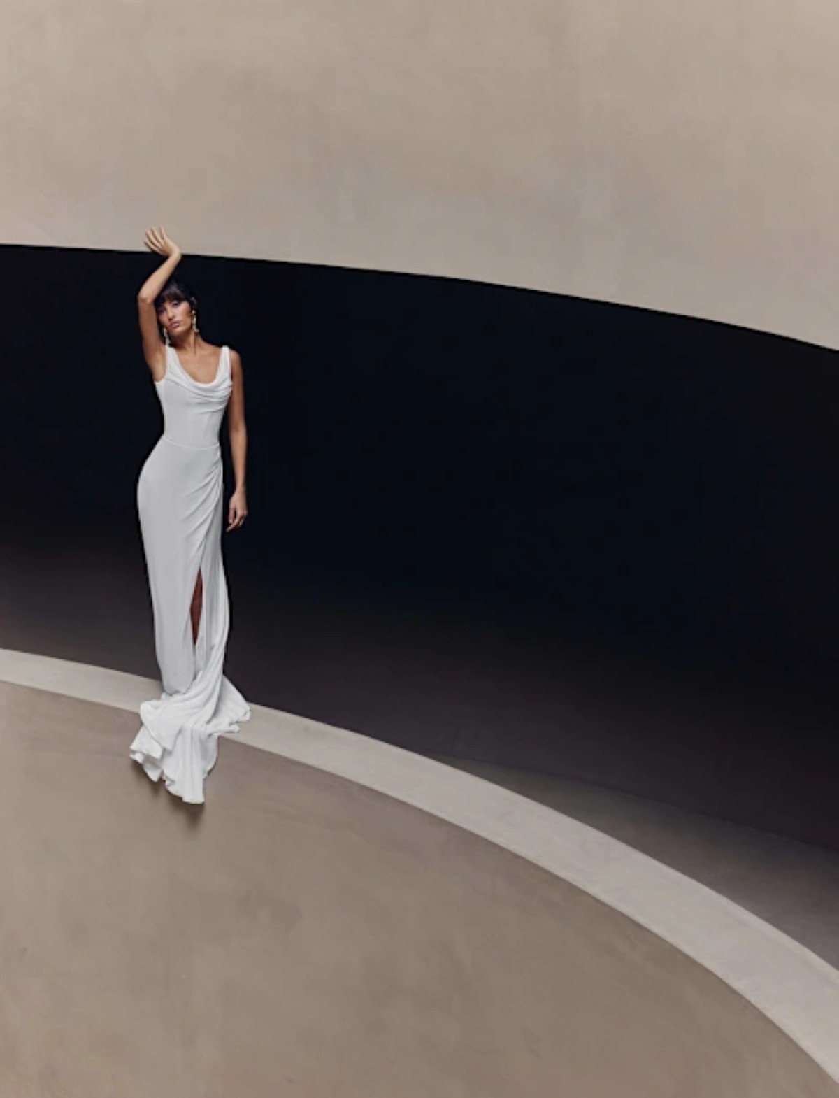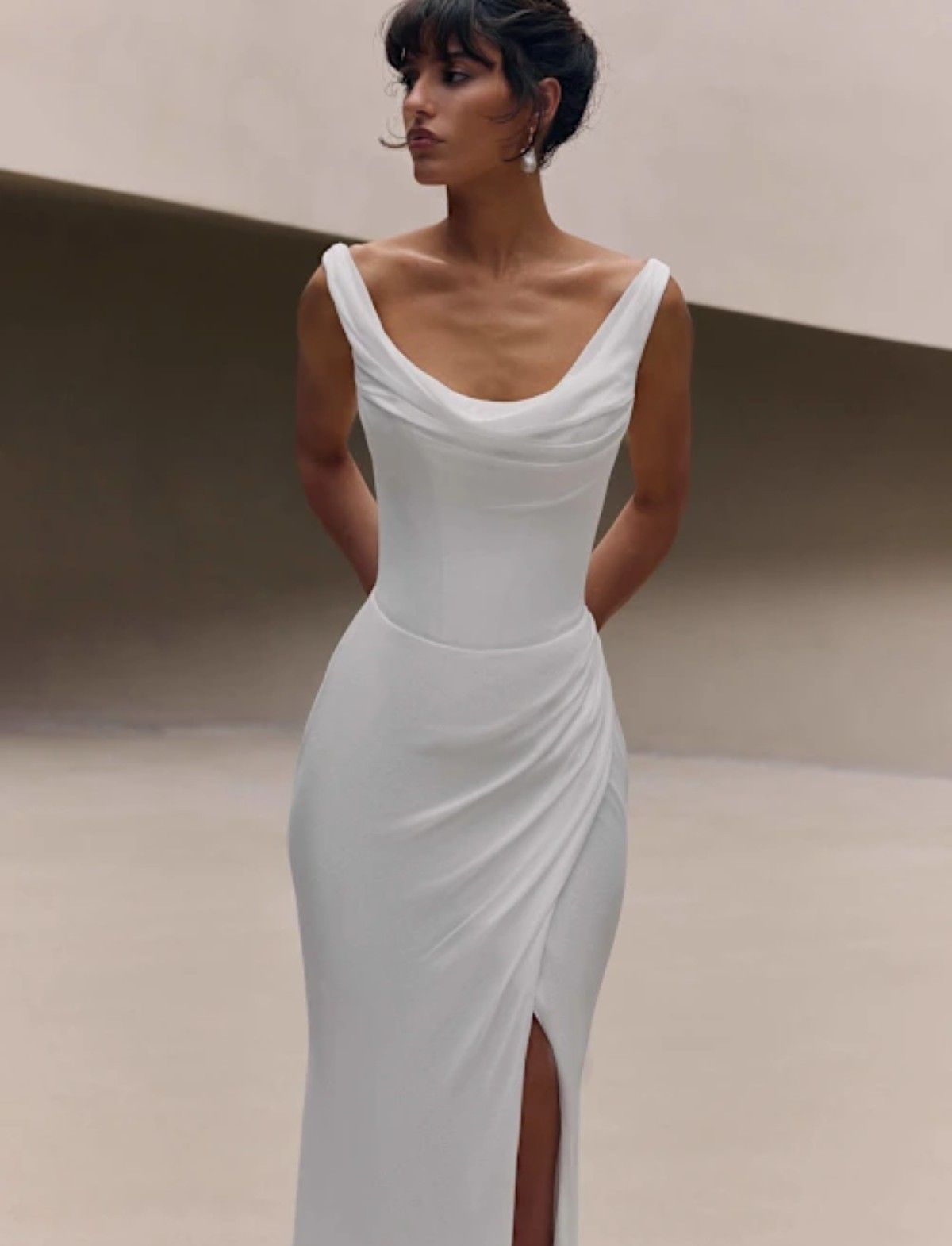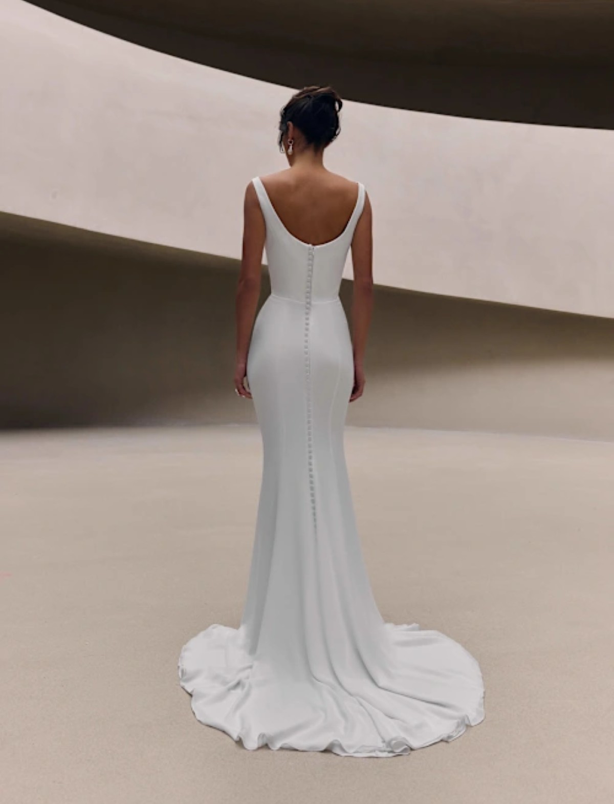 Scopri ISMARELLE, l’abito da sposa che incarna una femminilità moderna e sofisticata. Questo modello scivolato disegna una silhouette a sirena capace di esaltare la figura con estrema eleganza. Il corpetto presenta un raffinato scollo a barchetta con un delicato drappeggio, che si contrappone alla purezza del tessuto fluido. La schiena, protagonista di pura maestria artigianale, è impreziosita da una fila di bottoni rivestiti che scendono fino allo strascico. Perfetto per la sposa glamour che cerca un design minimalista ma iconico.