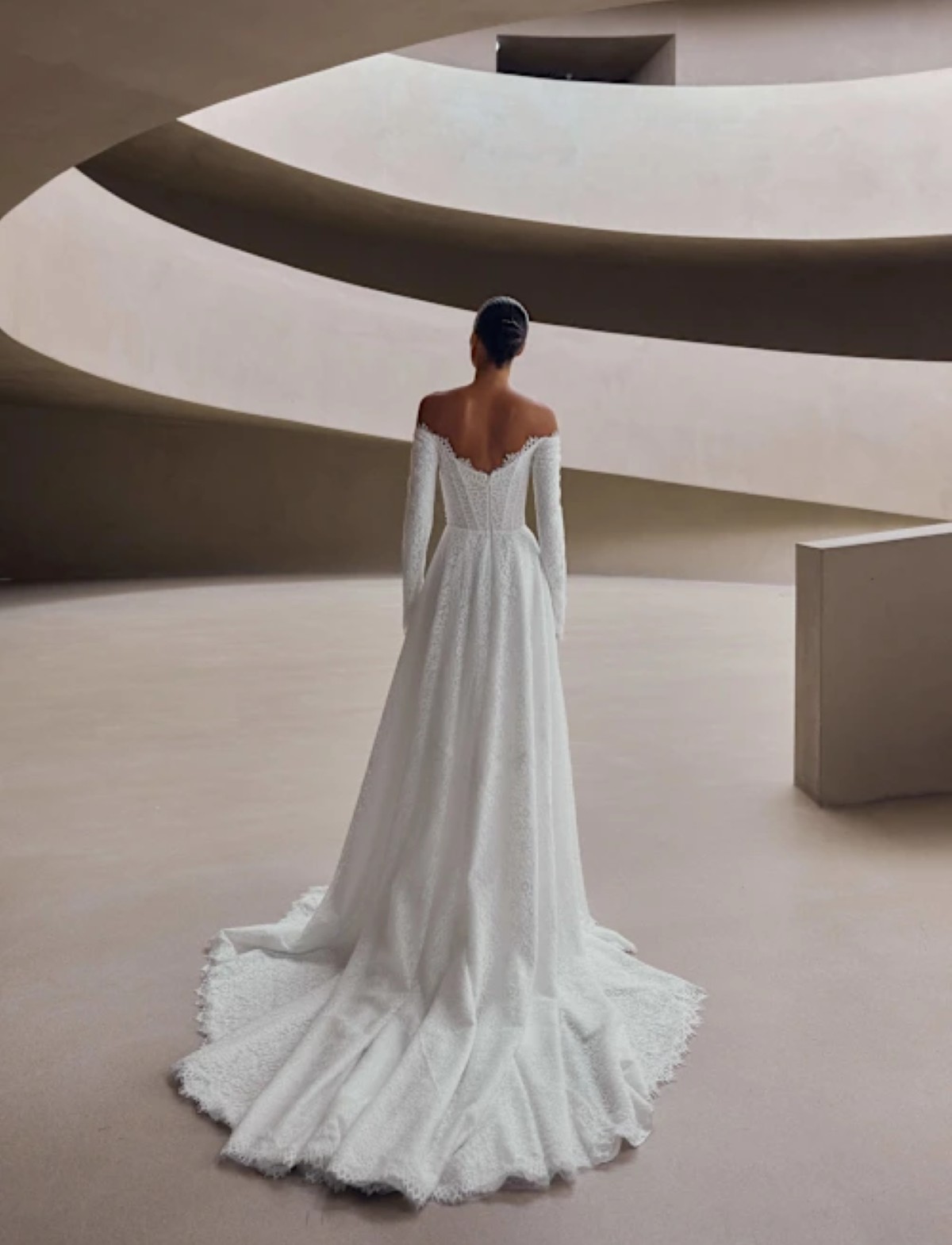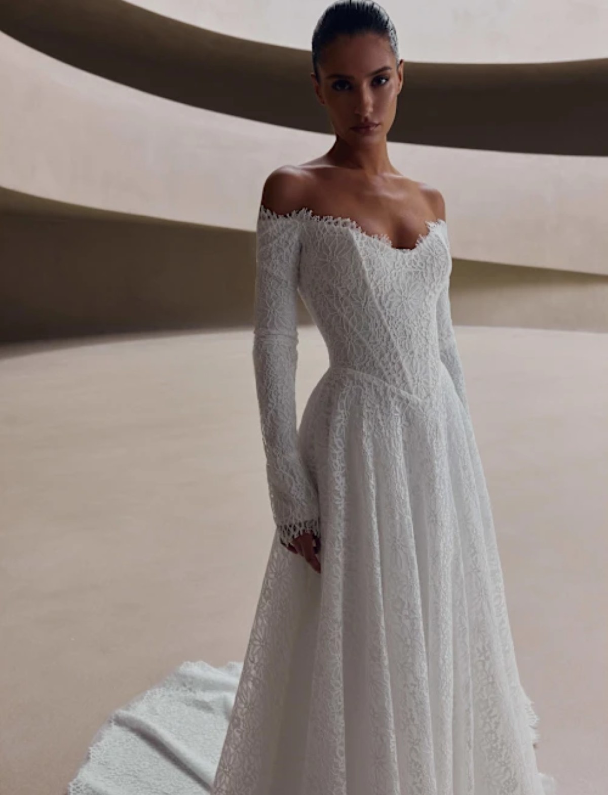 Lasciati incantare da OLYNE, un abito da sposa che fonde maestria artigianale e design contemporaneo. Questo vestito da sposa romantico ed etereo si distingue per il raffinato corpetto steccato, che definisce con precisione la silhouette. Il prezioso pizzo all-over accarezza il corpo, rivelando maniche lunghe in pizzo e un delicato scollo a barca che esalta le spalle.