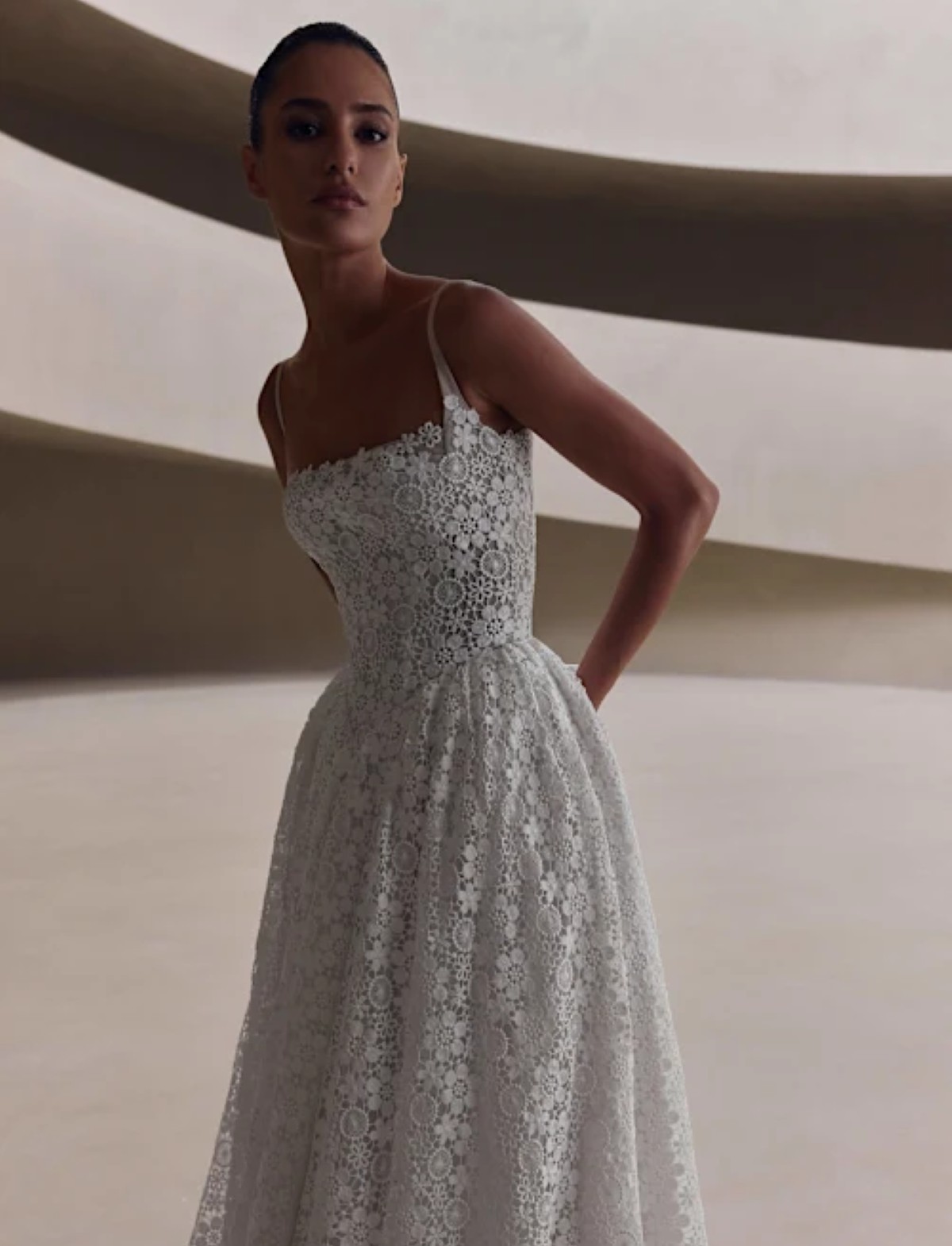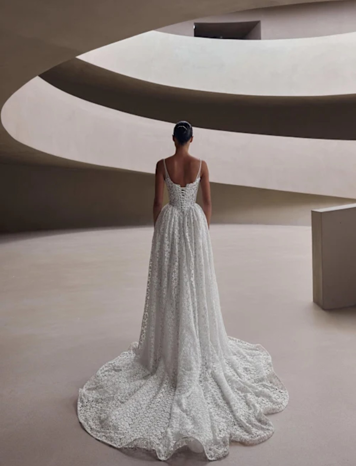 Scopri VANYELLE, l’abito da sposa firmato Prima Forma che incanta per il suo perfetto equilibrio tra stile principesco e design moderno. Il corpetto, caratterizzato da una raffinata struttura steccata e uno scollo squadrato, esalta la silhouette con eleganza. Il prezioso ricamo in pizzo floreale si fonde con una gonna ampia e scivolata, creando un movimento etereo. Lavorazioni artigianali e dettagli sartoriali rendono questo modello la scelta ideale per una sposa sofisticata che desidera un look iconico e senza tempo.