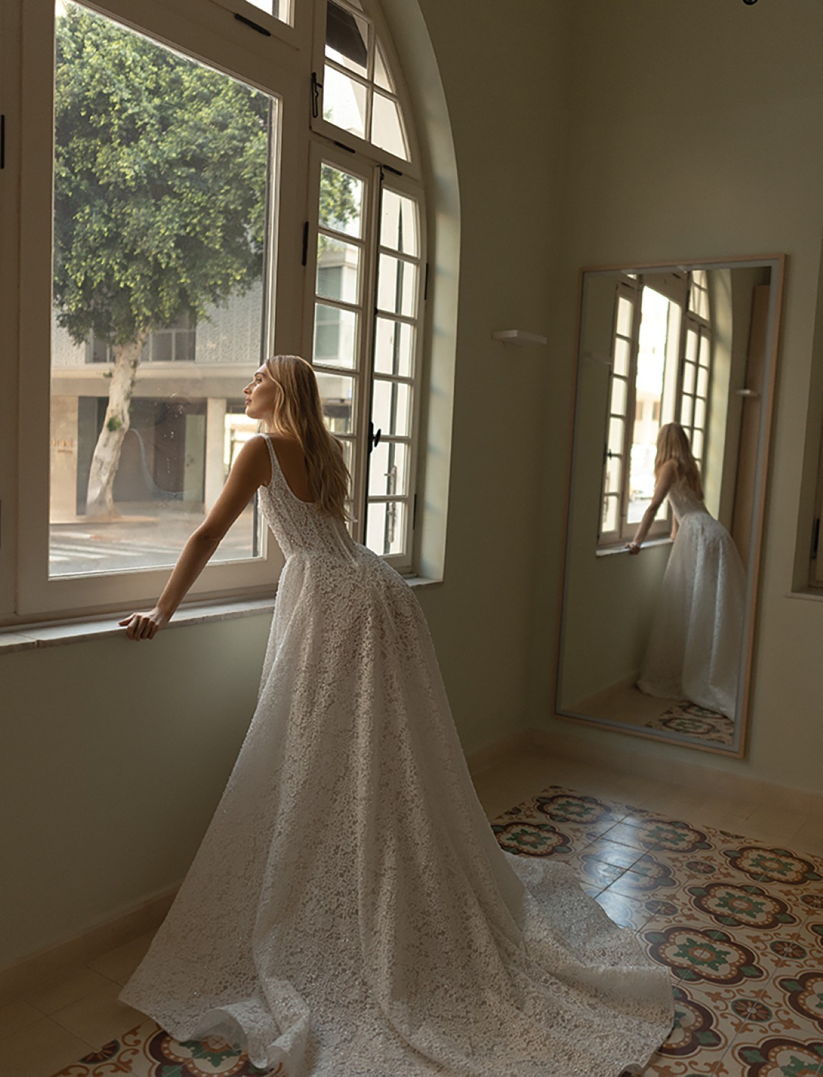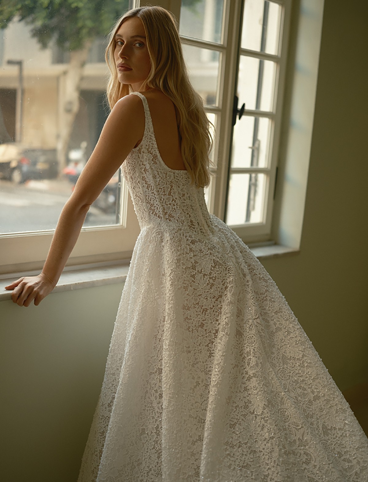 Interamente lavorato in un prezioso pizzo bianco dall’effetto tridimensionale e luminoso, l’abito è arricchito da delicate applicazioni scintillanti che catturano magicamente la luce. Il design è caratterizzato da un elegante corpetto steccato a vista, con sottili spalline e una scollatura squadrata che valorizza con grazia il décolleté. Le lavorazioni artigianali mettono in risalto la figura, mentre lo strascico leggero aggiunge un tocco di maestosità. Un capo sofisticato e senza tempo, perfetto per un matrimonio all’aperto o una cerimonia elegante.