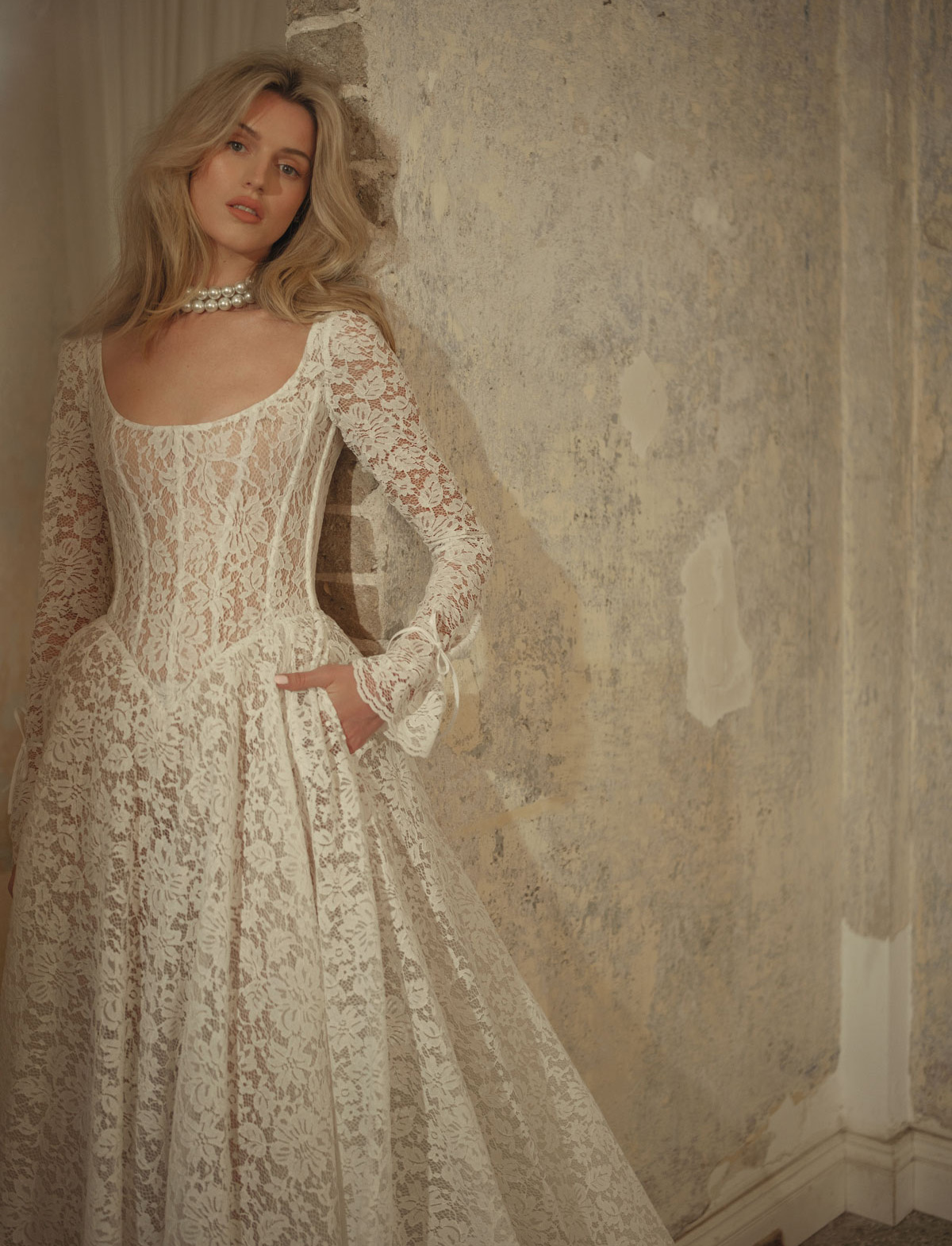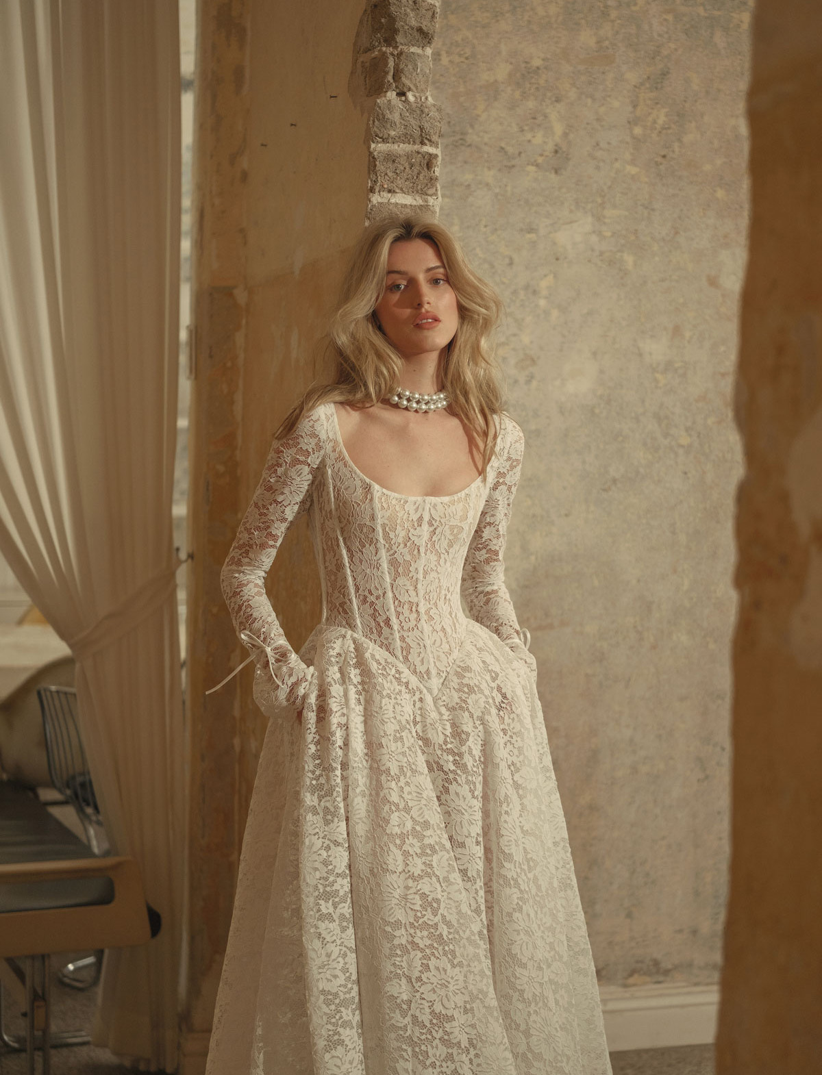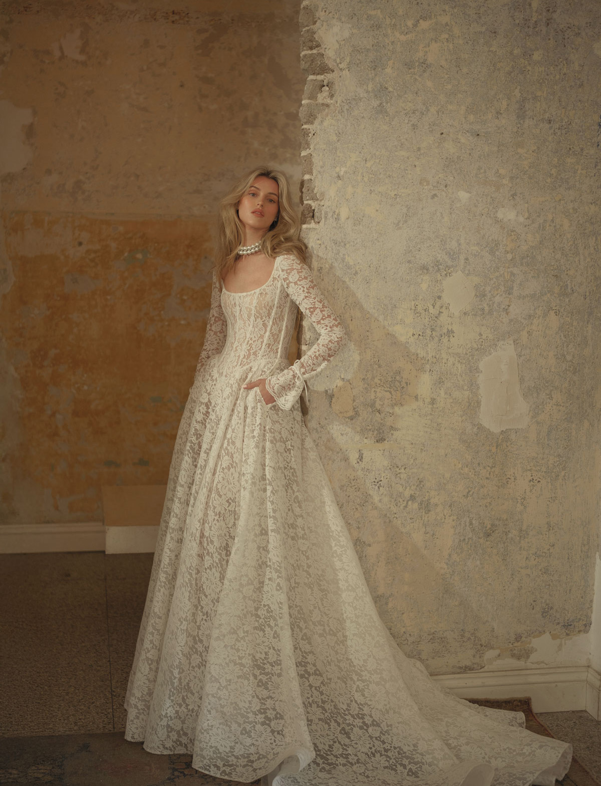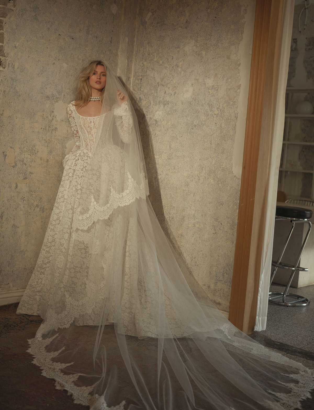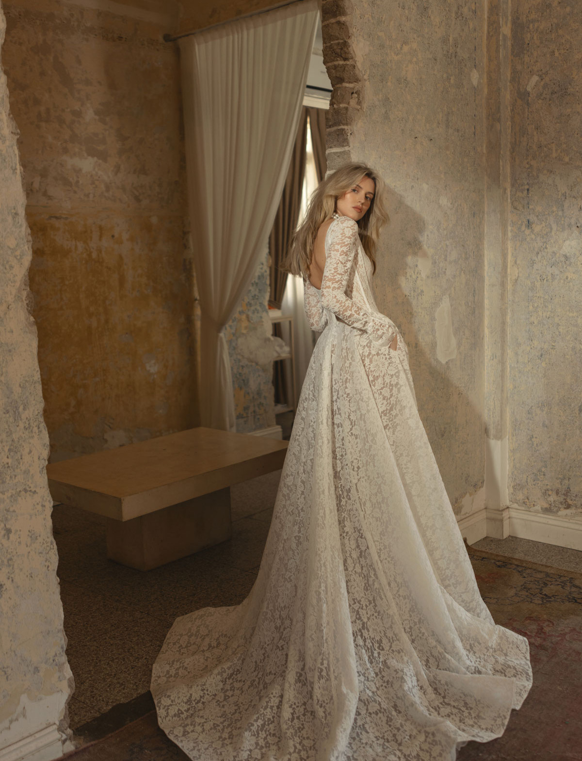 L’abito firmato Muse by Berta, disponibile all’Atelier Le Spose di Mori, è un abito da sposa romantico con gonna ampia in pizzo e tulle. Il corpetto steccato e semi-trasparente ha una profonda scollatura a barca e maniche lunghe in pizzo chantilly con polsini a campana. Schiena scoperta. I ricami floreali decorano tutto l’abito, mentre uno strascico lungo e prezioso completa il look. L’abito unisce eleganza fiabesca e praticità grazie alle tasche discrete. Lungo velo con particolari ricami in pizzo.