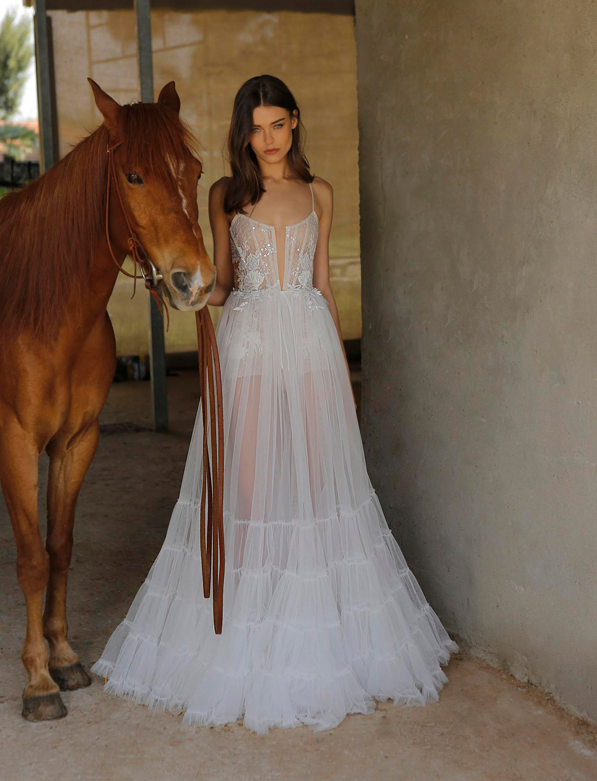 Eleganza bohémien e romanticismo contemporaneo si fondono nell’abito da sposa Kenzie di MUSE BY BERTA. Questo vestito da sposa sensuale e leggero presenta un corpetto a bustier steccato, arricchito da ricami in pizzo che creano un delicato effetto di trasparenza. La gonna ampia in tulle, scivolata e a balze, dona un movimento etereo e un look moderno. I dettagli sartoriali e le lavorazioni artigianali rendono questo abito perfetto per la sposa che desidera un look non convenzionale, sofisticato e al tempo stesso romantico, un mix tra principesco e moderno.