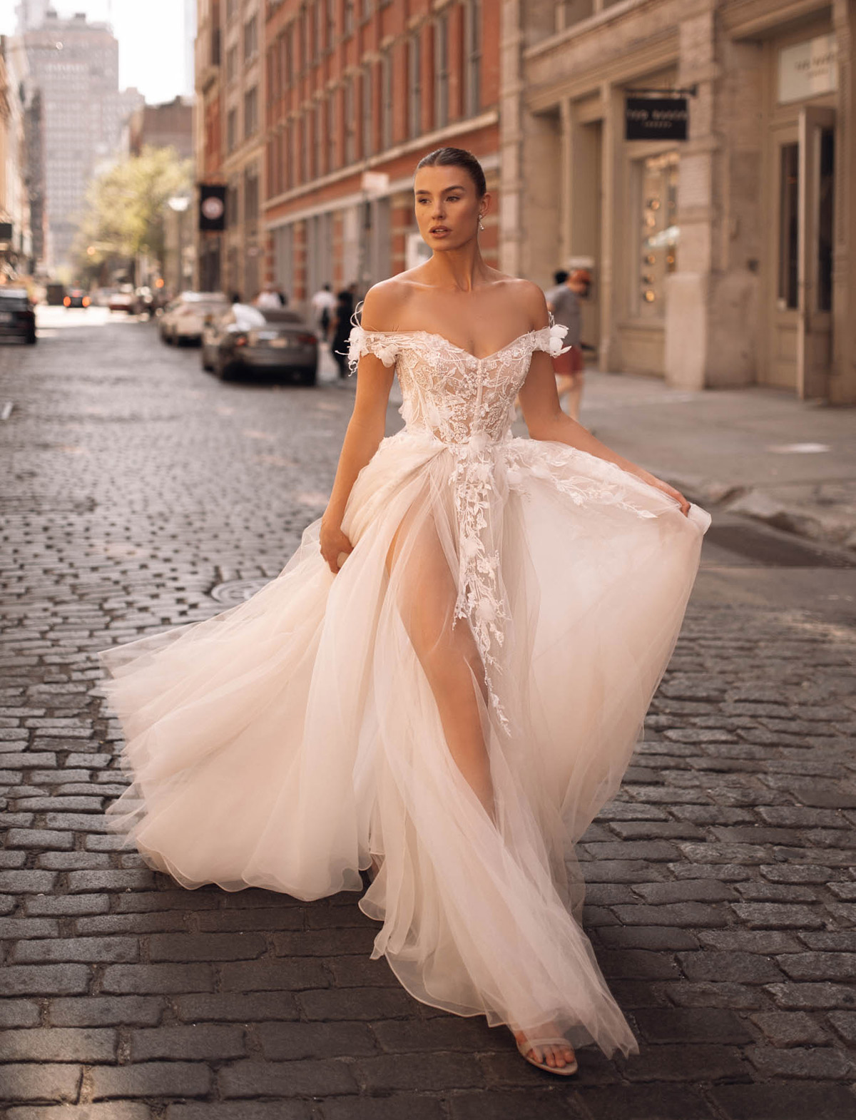 Preparati a sognare con l’abito da sposa Maleficent di MUSE BY BERTA, un vestito da sposa sensuale e moderno che sprigiona un fascino etereo. La silhouette fluida e la gonna ampia in leggerissimo tulle creano un effetto fluttuante e fiabesco. Il corpetto a cuore, con maniche a spalla scoperta, è un capolavoro di dettagli sartoriali, con ricami in pizzo che si diramano come rami fioriti, scendendo delicatamente sulla gonna. Un profondo spacco laterale rivela un tocco audace e contemporaneo. Questo abito è la scelta ideale per una sposa audace, romantica e alla ricerca di un look che unisca modernità e pura magia.