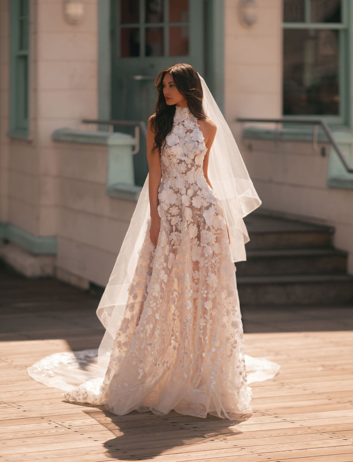 Scopri la pura poesia dell’abito da sposa Odel di MUSE BY BERTA, un vestito da sposa romantico e fiabesco che celebra la natura. L’abito, dalla silhouette A-line, è un’esplosione di dettagli sartoriali, con un’opulenza di applicazioni floreali 3D che ricoprono l’intera superficie, dal corpetto alla gonna, creando un effetto magico e tridimensionale. Il design del corpetto a collo alto e senza maniche dona un tocco di moderna eleganza, mentre la gonna ampia e scivolata assicura un movimento leggero e sofisticato. Perfetto per la sposa che desidera un look incantevole, sensuale e indimenticabile, come un giardino in fiore.