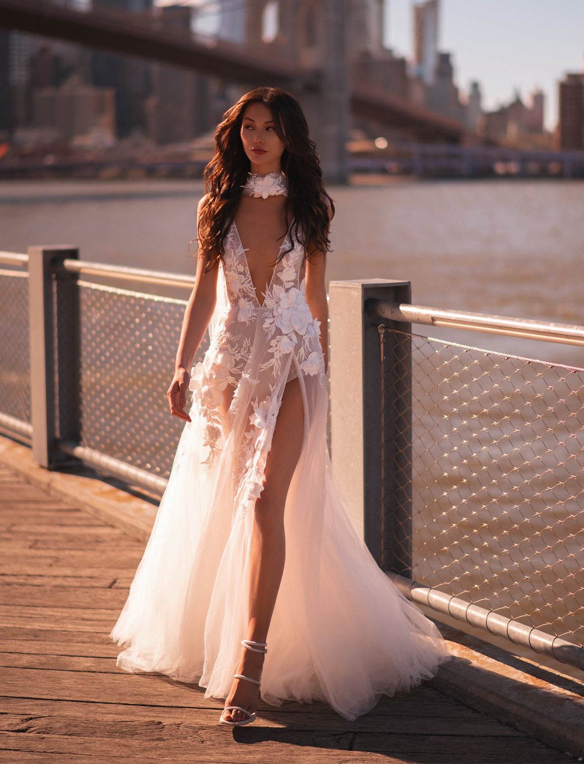 Eleganza audace e romanticismo si fondono nell’abito da sposa Oksana di MUSE BY BERTA, un vestito da sposa moderno che celebra la sposa sicura di sé. Questo modello dalla silhouette scivolata cattura lo sguardo con il suo profondo scollo a V e uno spacco vertiginoso che rivela con grazia la gamba. Il corpetto, un capolavoro di dettagli sartoriali, è adornato da ricami in pizzo che si trasformano in applicazioni floreali 3D, creando un effetto sensuale e fiabesco. La gonna, leggera in tulle, si muove con delicatezza. Un abito da sogno per una sposa audace, sofisticata e romantica.