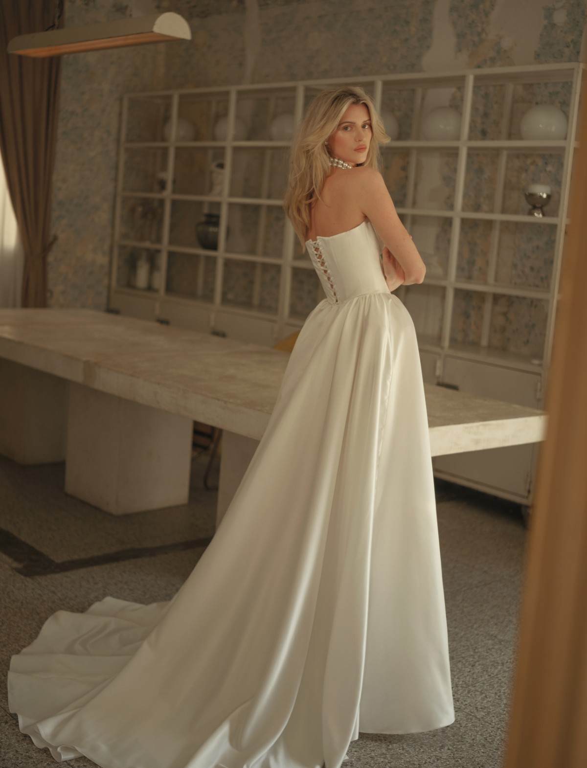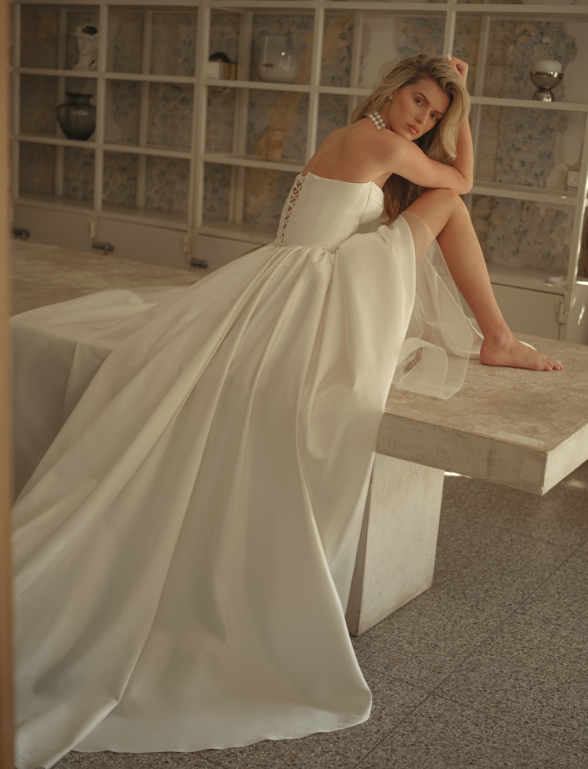 Il design, pulito e privo di ricami superflui, mette in risalto la qualità dei tessuti e l’eccellenza delle lavorazioni artigianali. Il fascino di Penelope risiede nella sua semplicità: è l’abito ideale per la sposa classica e glamour che cerca un look intramontabile e di classe. L’atmosfera che comunica è di pura raffinatezza e lusso, perfetto per una cerimonia formale o in una location sfarzosa.