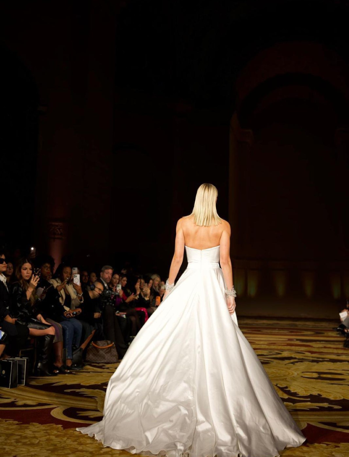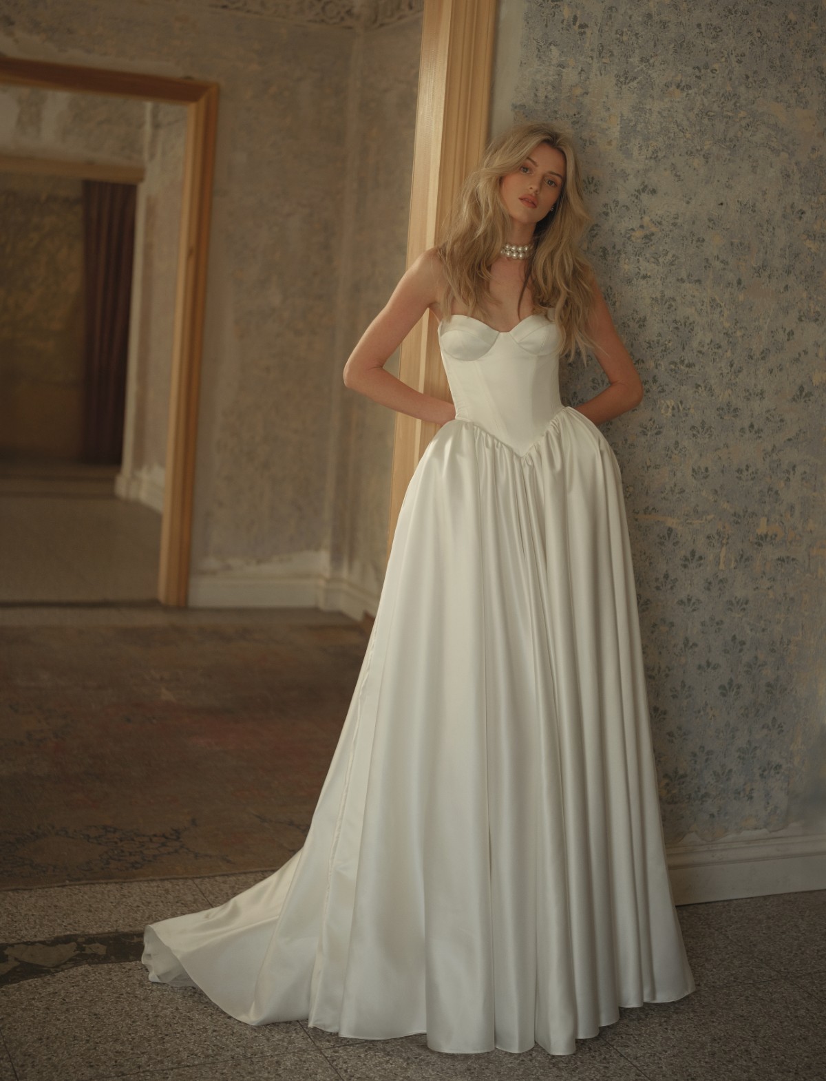 Il corpetto steccato, con un elegante taglio a cuore, è realizzato in seta lucente e liscia che avvolge la figura con una precisione sartoriale impeccabile. La gonna ampia e scivolata, sempre in seta, cade a terra con una grazia fluida, creando una silhouette A-line che dona un’allure maestosa e leggera allo stesso tempo.
