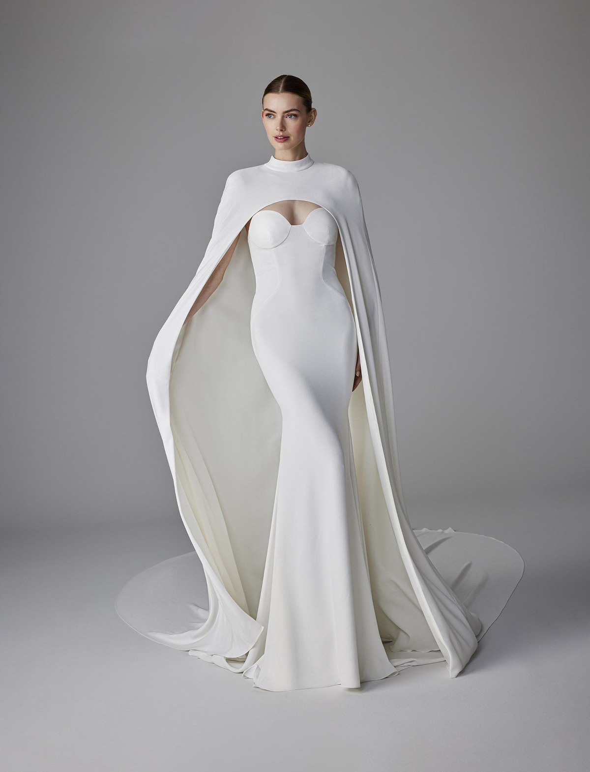 Con il suo design audace e l’eleganza raffinata, l’abito da sposa Pronovias Alexandrine è l’incarnazione della sposa moderna e sofisticata. Questo capolavoro sartoriale presenta una silhouette a sirena che avvolge la figura, valorizzando le curve in modo sensuale e impeccabile. La lavorazione artigianale si esprime nel tessuto liscio e luminoso, che comunica un’eleganza minimalista. Il corpetto presenta un audace scollo a cuore con un taglio geometrico e pulito, che unito alla mantella, lo rende un abito da sposa versatile e ricercato. La mantella, con il suo colletto alto, aggiunge un tocco di regalità e mistero, scivolando in un lungo strascico che conferisce drammaticità e grazia al vestito. L’Alexandrine è la scelta ideale per la sposa che desidera un look glamour e indimenticabile, perfetto per una cerimonia formale o un matrimonio in città.