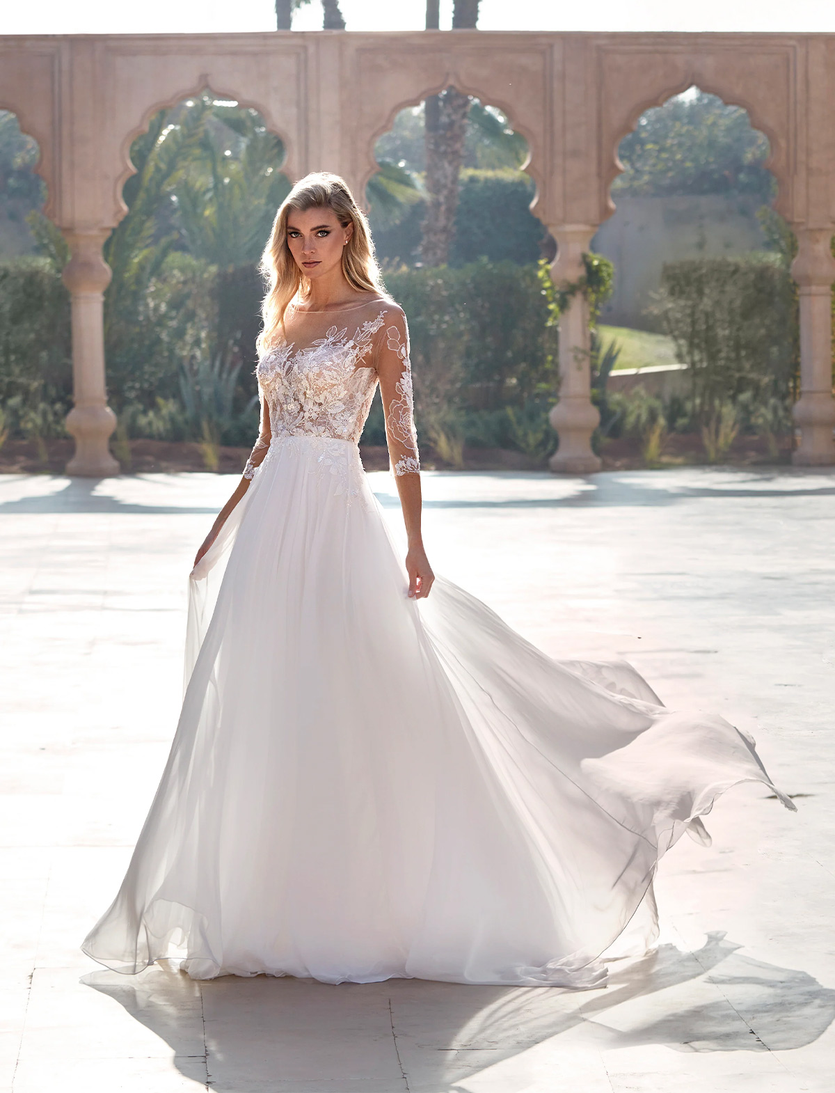 Il romanticismo si fonde con l’eleganza moderna nell’abito da sposa Pronovias Danube, una creazione che incanta con la sua leggerezza e i dettagli sofisticati. Questo vestito da sposa scivolato, dalla silhouette A-line, ha un’allure eterea che accarezza la figura con grazia. Il corpetto, un vero capolavoro di lavorazioni artigianali, presenta un delicato gioco di trasparenze e ricami in pizzo floreale che si estendono sul busto e sulle maniche lunghe. Questo vestito è l’ideale per la sposa che desidera un look romantico e boho-chic, perfetto per un matrimonio all’aria aperta. La gonna ampia e fluida, realizzata in un leggerissimo chiffon, crea un movimento fiabesco a ogni passo, trasformando la sposa in una visione incantevole e indimenticabile.