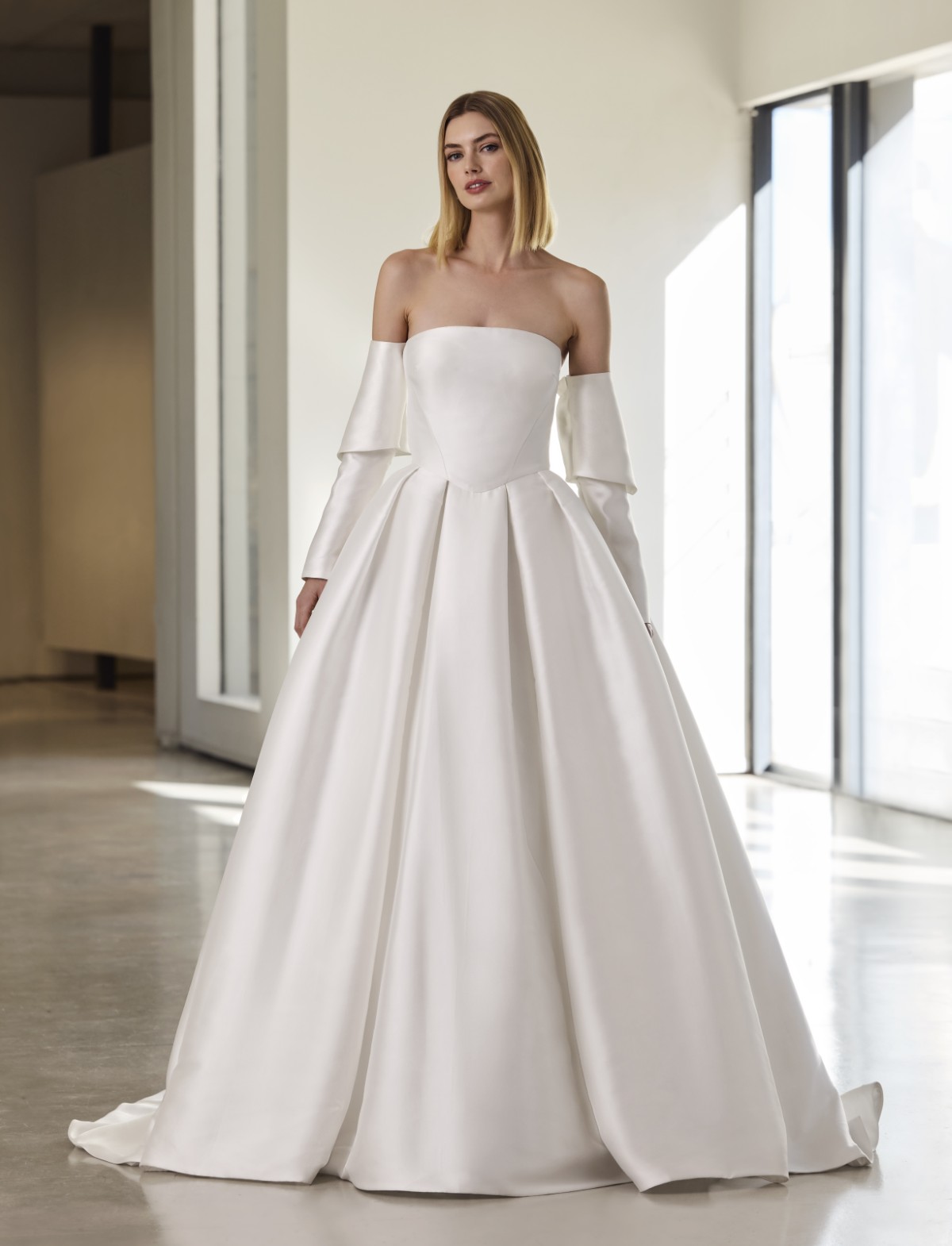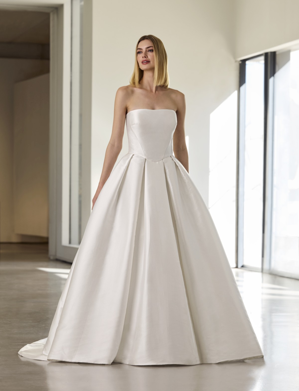 Abbraccia l’eleganza senza tempo e la versatilità con JANETTE di PRONOVIAS 2026, un abito da sposa principesco che incarna la modernità e la tradizione. Questo vestito da sposa, dalla silhouette ampia e maestosa, è realizzato in pregiato mikado, un tessuto che conferisce un volume strutturato e una lucentezza sofisticata. Il corpetto bustier, dalla linea pulita e sensuale, valorizza il décolleté con grazia discreta.