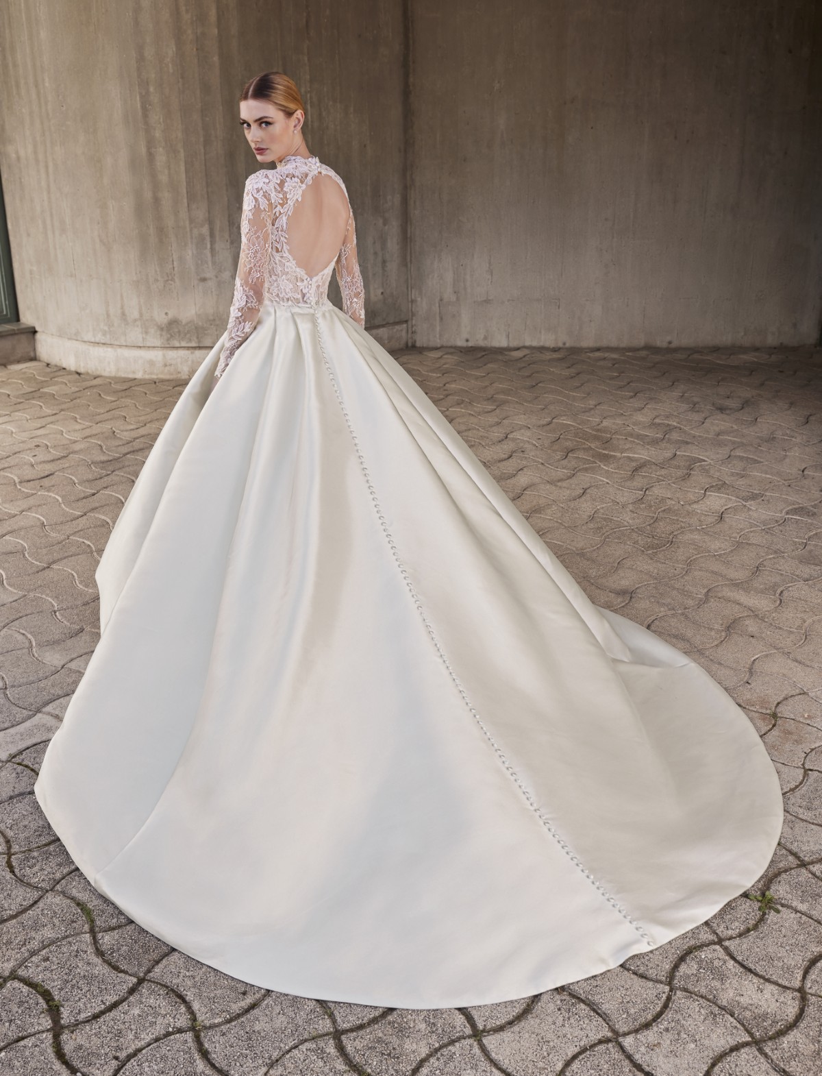 Il vero protagonista è il corpetto, un capolavoro di lavorazione artigianale: finemente ricamato in pizzo, con un romantico collo alto e maniche lunghe illuso, crea un sensuale effetto tattoo sulla pelle, adornato da applicazioni floreali delicate e tridimensionali. Il design del corpetto a collo alto si bilancia con un’audace scollatura sulla schiena, impreziosita da una fila di bottoncini che scendono lungo la schiena fino alla vita. La gonna liscia e voluminosa è arricchita da tasche discrete, un tocco moderno e funzionale. MAPLIS è l’abito ideale per la sposa sofisticata e romantica che sogna un look da favola con un tocco contemporaneo. Vieni a scoprirlo all’Atelier Le Spose di Mori.