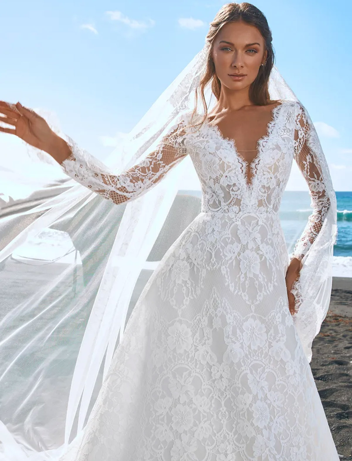 Con il suo stile bohémien e un tocco di romanticismo etereo, l’abito da sposa Pronovias Mingsha è l’incarnazione della sposa moderna e sognatrice. Questo vestito da sposa scivolato, dalla silhouette A-line, ha una vestibilità fluida che si muove con grazia. Il corpetto, un capolavoro di lavorazioni artigianali, presenta un profondo scollo a V e maniche lunghe realizzate in pizzo floreale, con una delicata trasparenza che aggiunge un tocco sensuale. I ricami in pizzo decorano il corpetto e la gonna, scendendo in modo armonioso, mentre il tessuto leggero e impalpabile della gonna crea un movimento fiabesco a ogni passo. La sposa che indosserà Mingsha si sentirà una vera dea, un’eroina romantica perfetta per un matrimonio sulla spiaggia o in una location da sogno all’aperto.