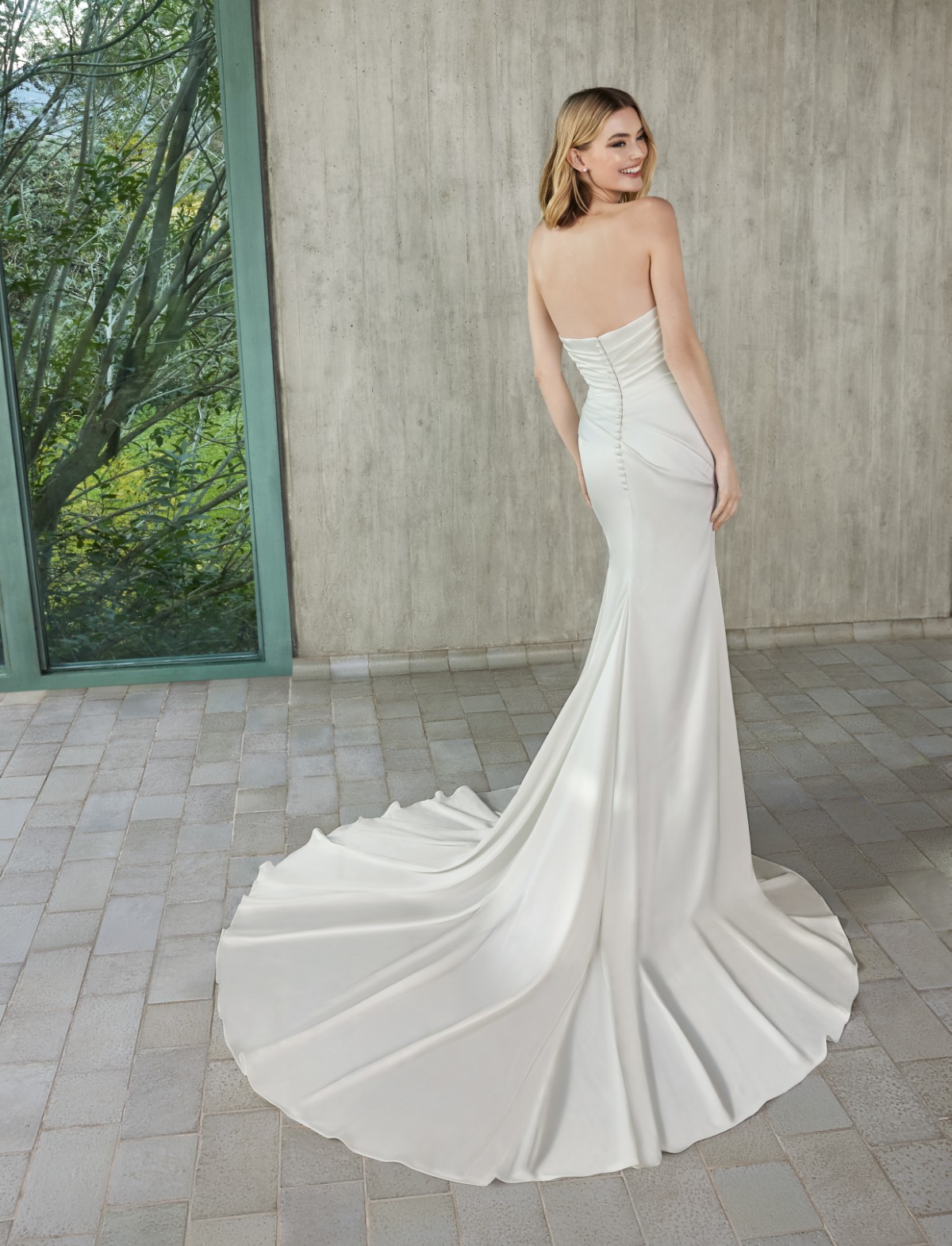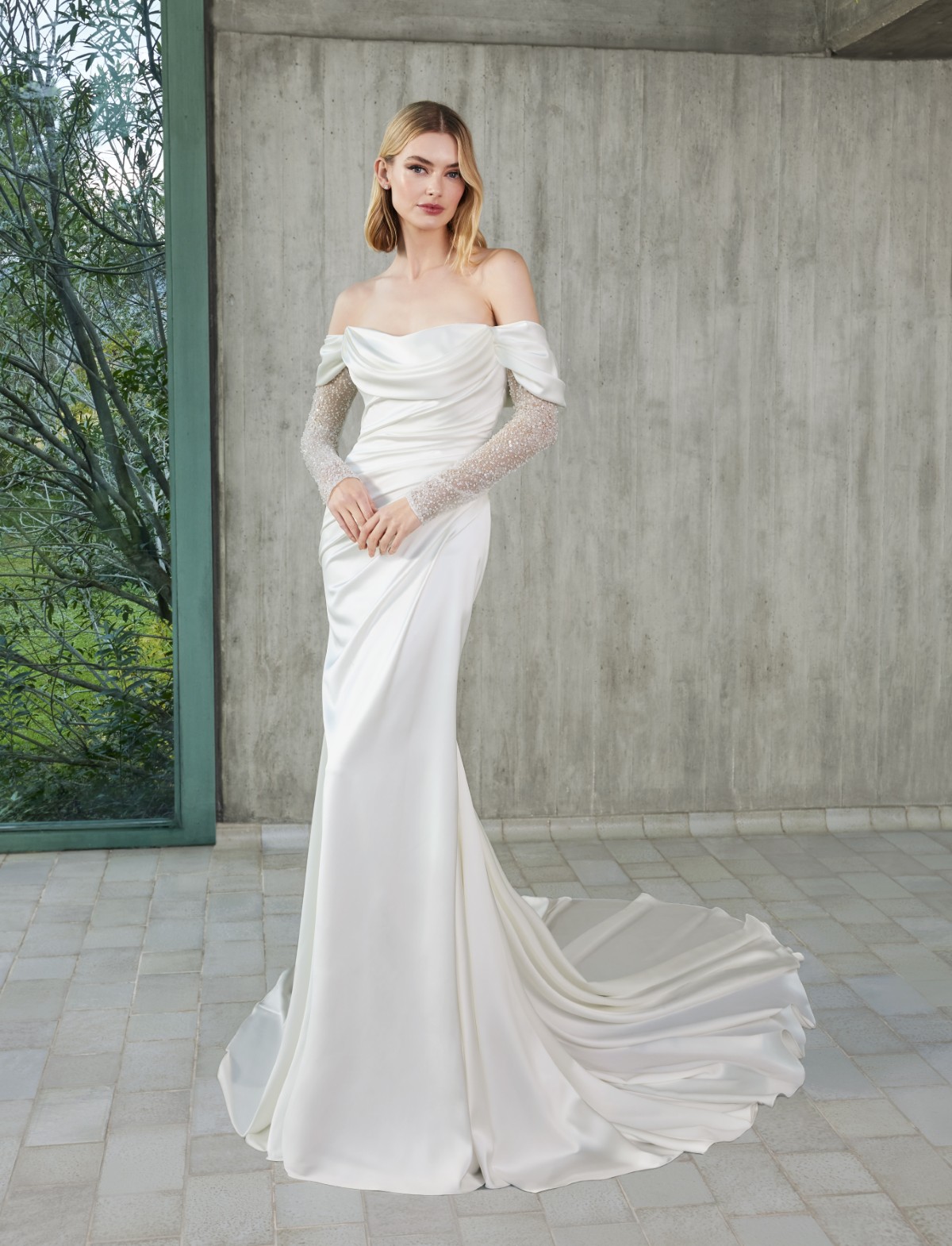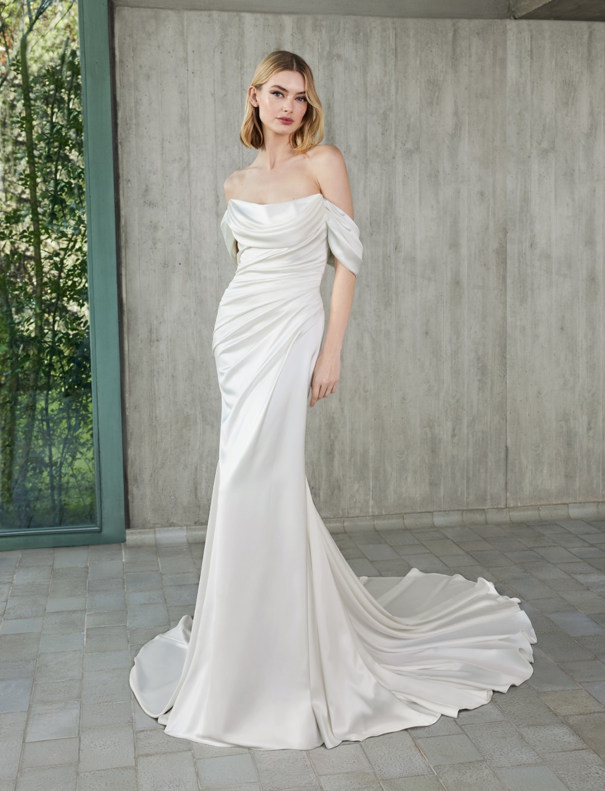 Sogni un abito da sposa che unisca il glamour classico alla modernità? VIVIAMA di PRONOVIAS 2026 è la scelta perfetta per te. Questo vestito da sposa scivolato, realizzato in un raso lucido, avvolge la figura con una fluidità sensuale, esaltando la silhouette con eleganza.