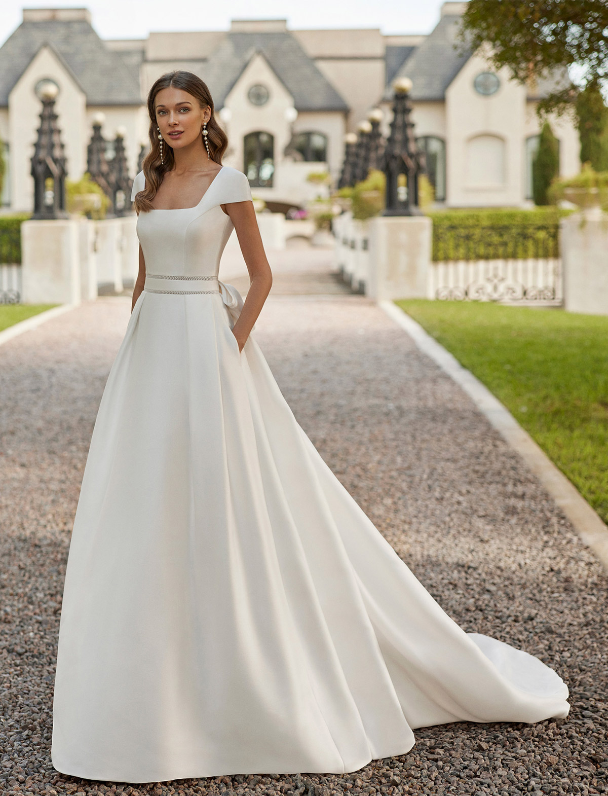 Immergiti in un’atmosfera da sogno con l’abito da sposa Evaly di Rosa Clarà, un perfetto connubio tra romanticismo e modernità. Questo vestito da sposa principesco, con la sua silhouette A-line, incarna la grazia e la raffinatezza. Il corpetto in mikado con scollo quadrato e delicate maniche a cappuccio esalta il busto, mentre la gonna, voluminosa e fluida, scende elegantemente con delle pieghe che si aprono su comode tasche. Il punto vita è evidenziato da un fiocco in mikado e da un prezioso inserto in strass. Evaly è la scelta ideale per la sposa che cerca un look classico e chic, con un tocco contemporaneo.
